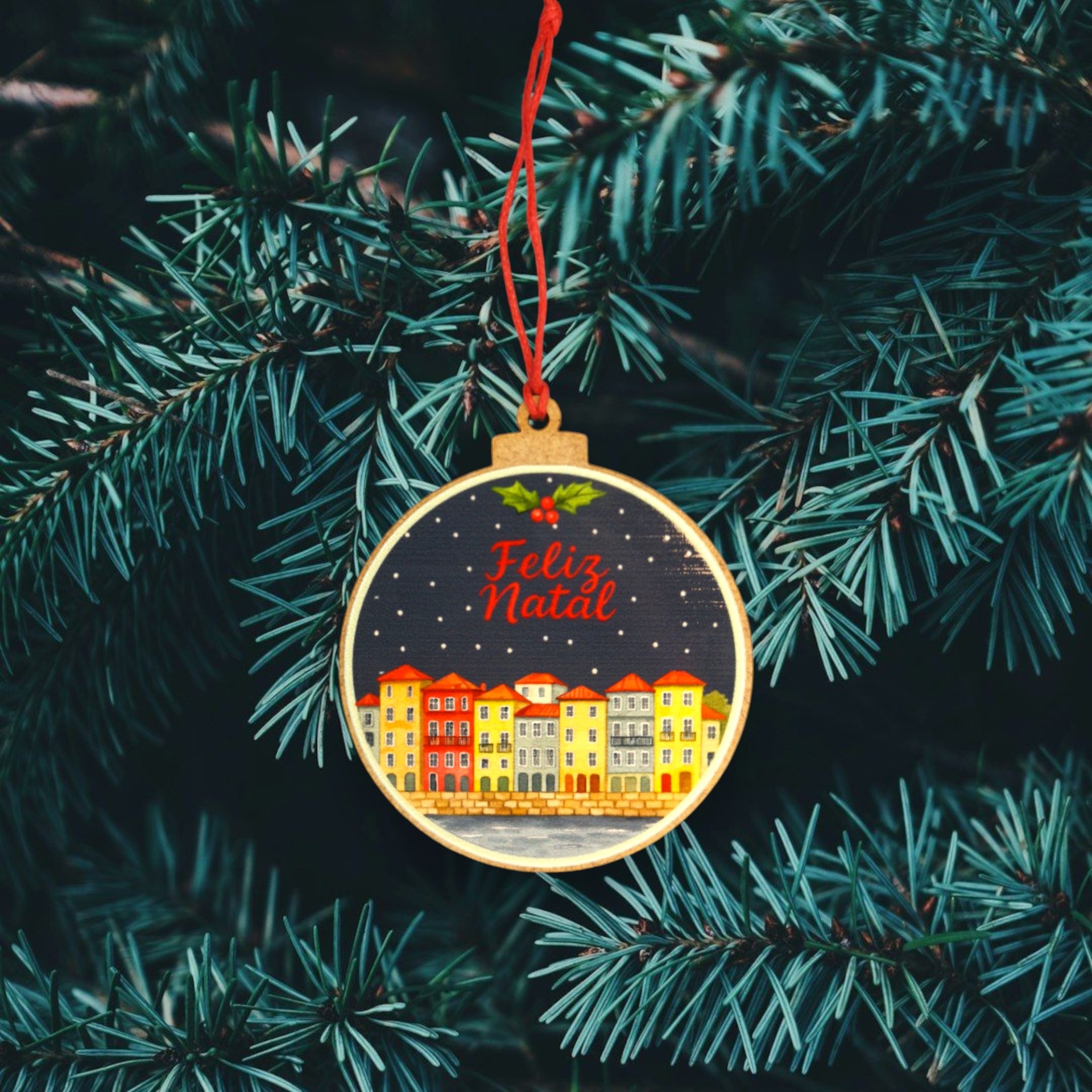 Bola de Natal em MDF reciclado inspirada na Ribeira do Porto, com design artesanal e a mensagem “Feliz Natal”. Um toque sustentável e tradicional para a tua árvore.