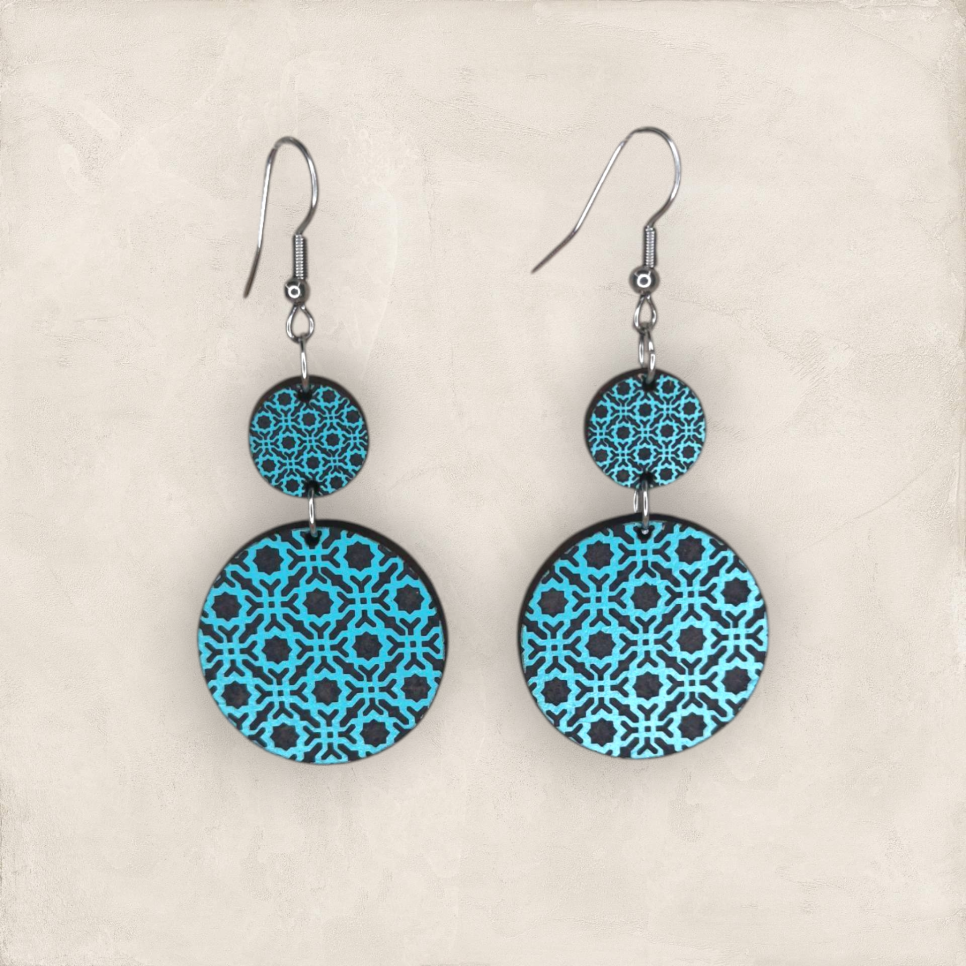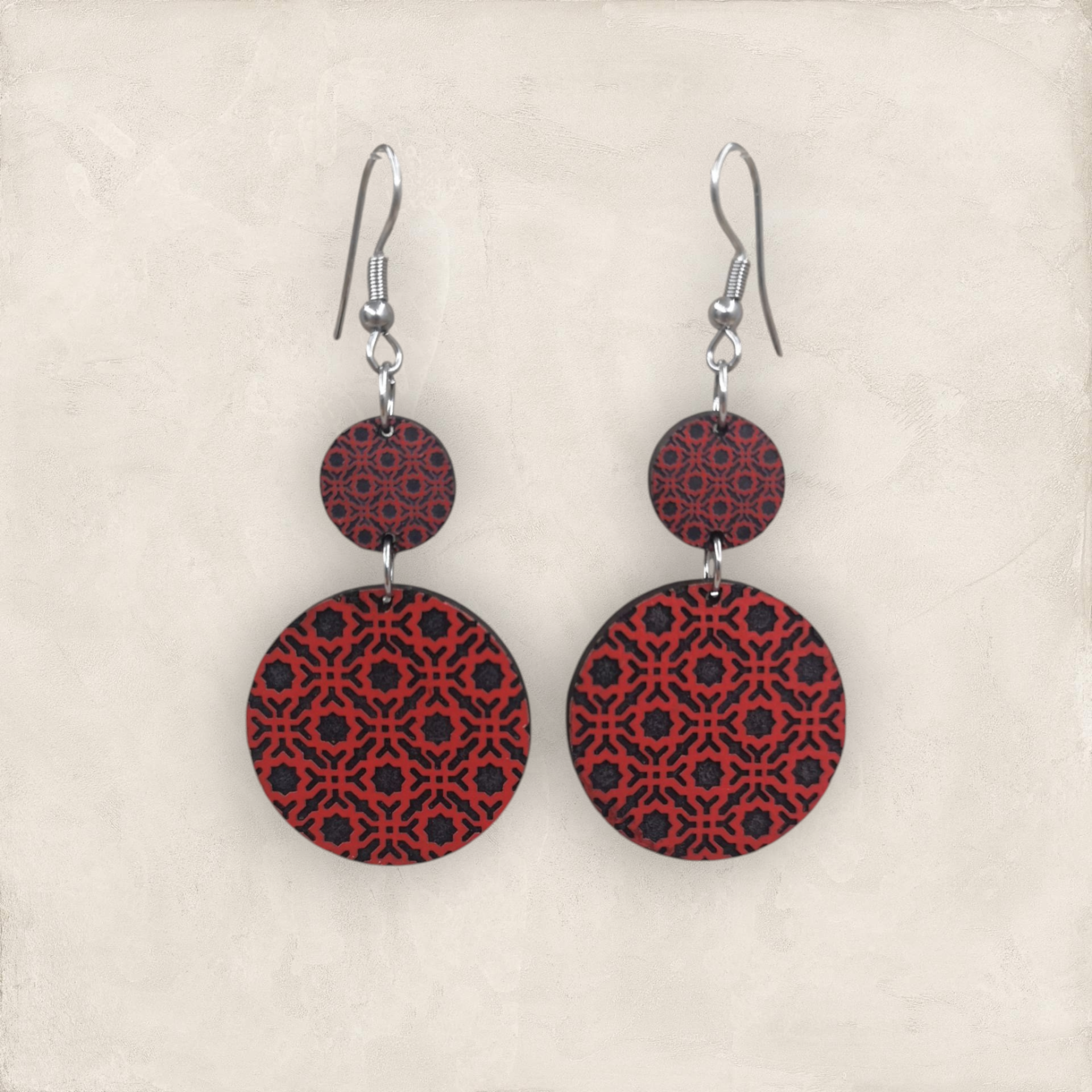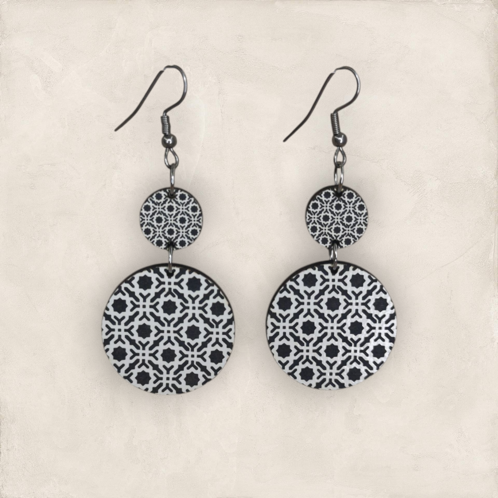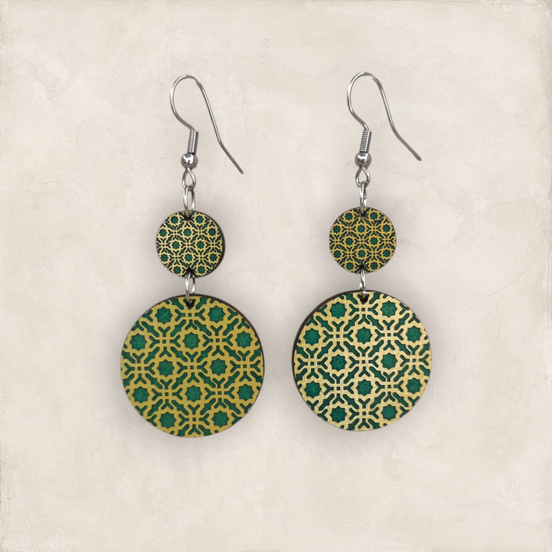Brincos inspirados nos padrões geométricos da Alhambra, em Granada, produzidos em madeira MDF reciclada e pintados com tintas à base de água.