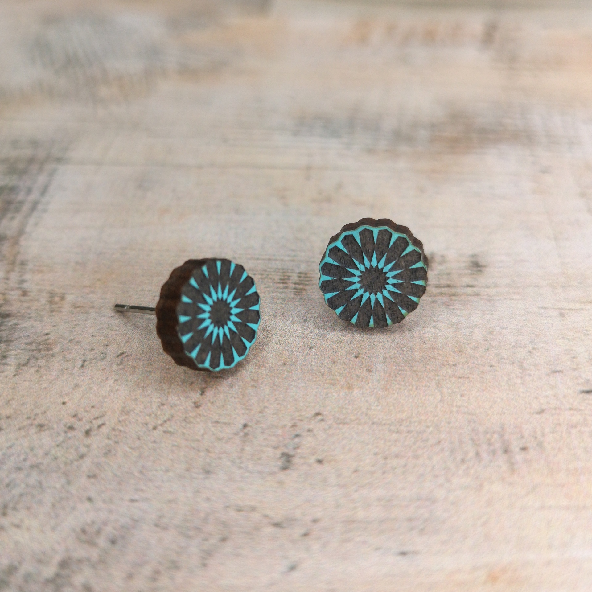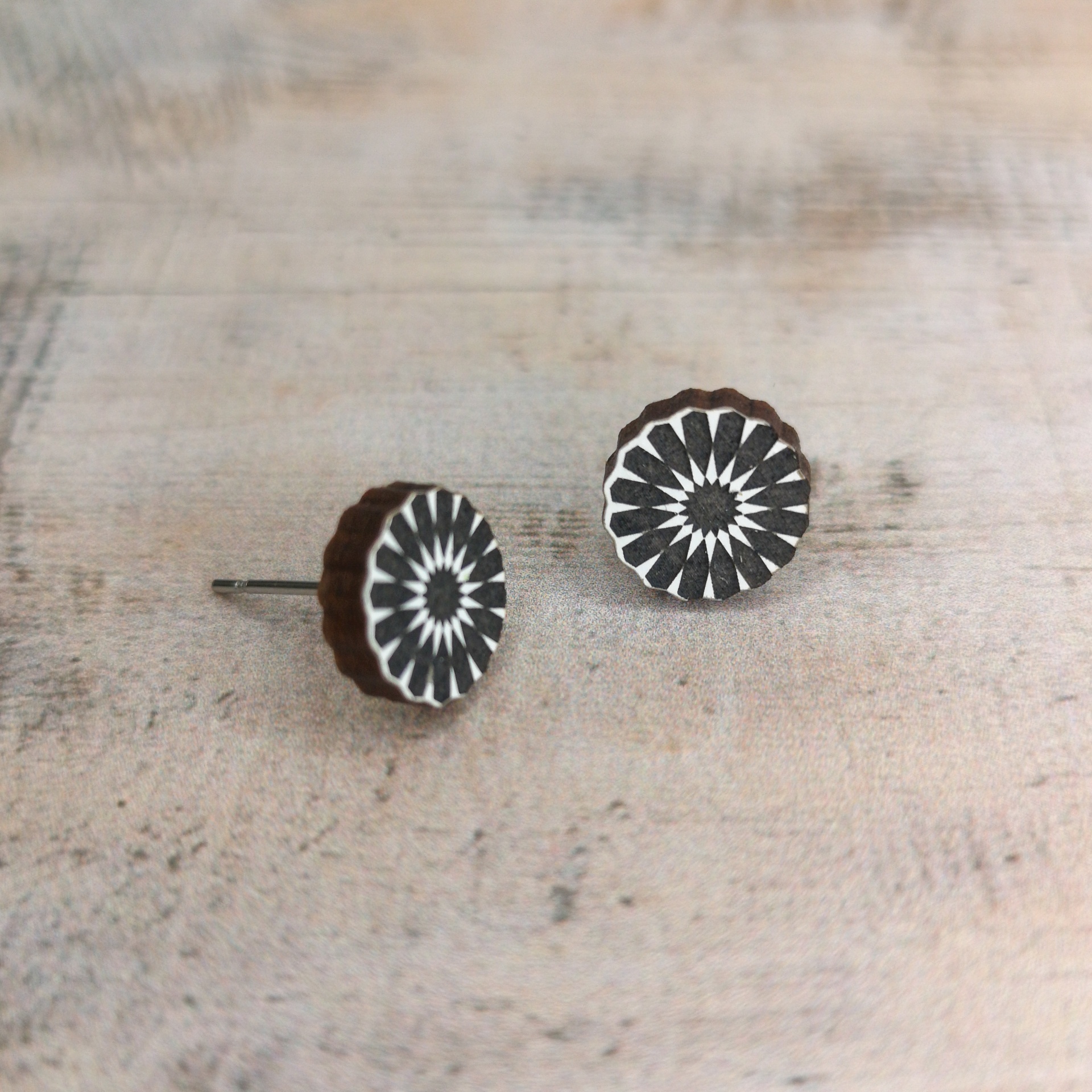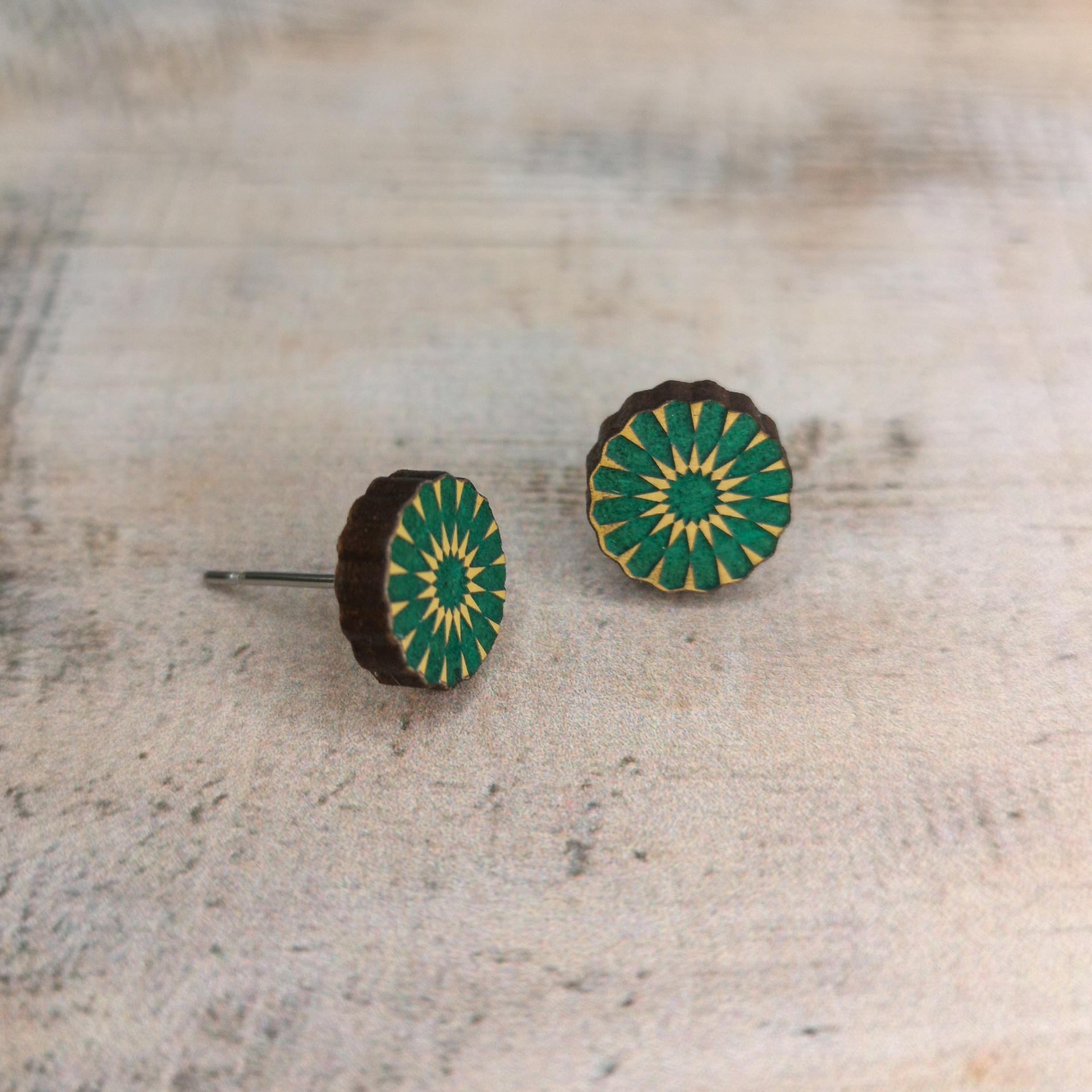 Brincos inspirados nos padrões geométricos da Alhambra, em Granada, produzidos em madeira MDF reciclada e pintados com tintas à base de água.