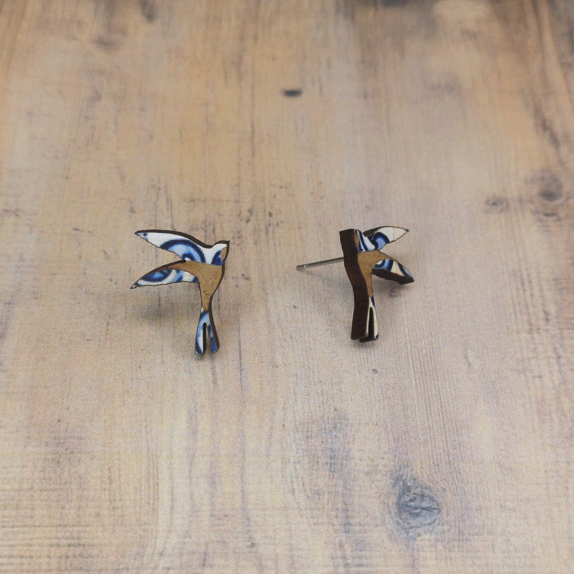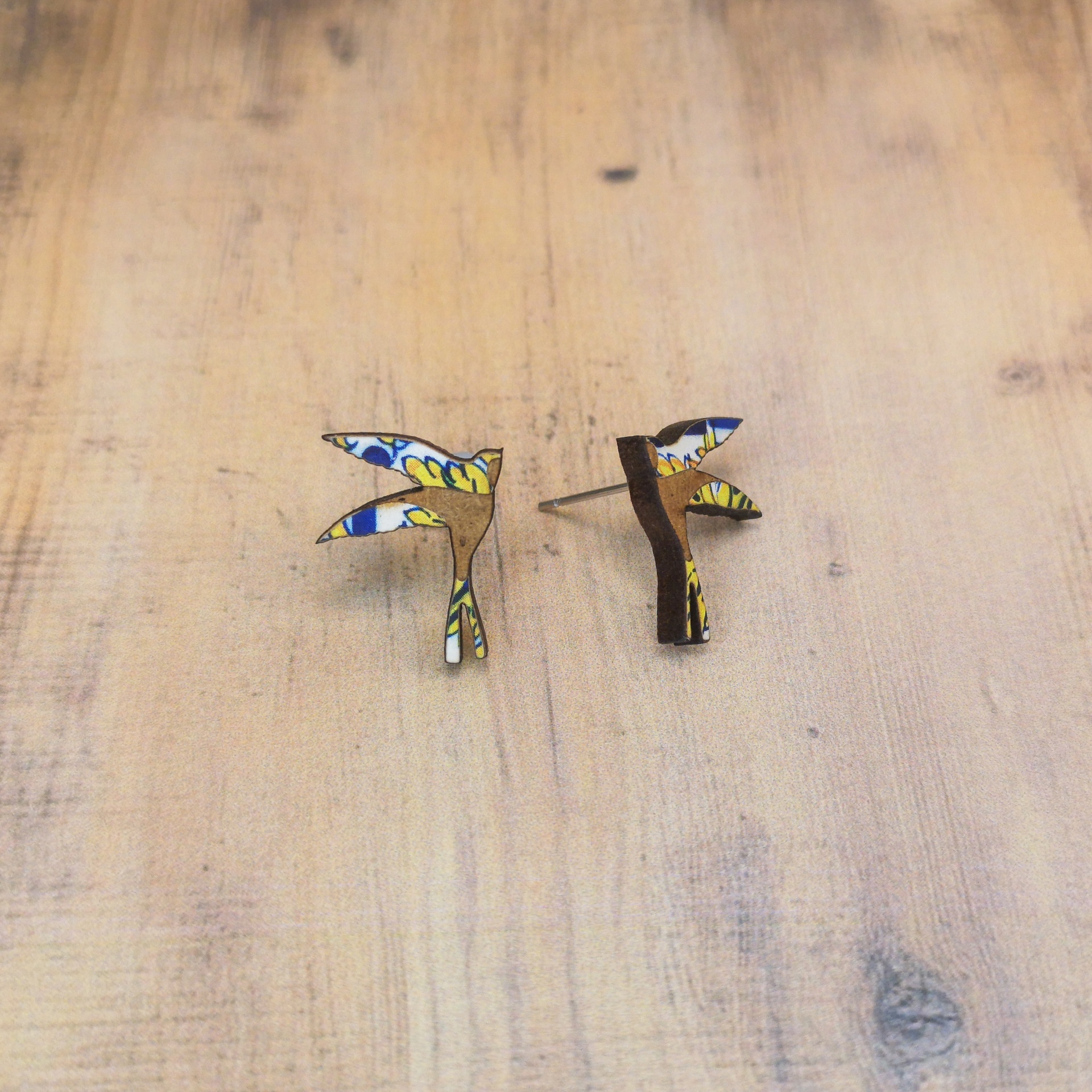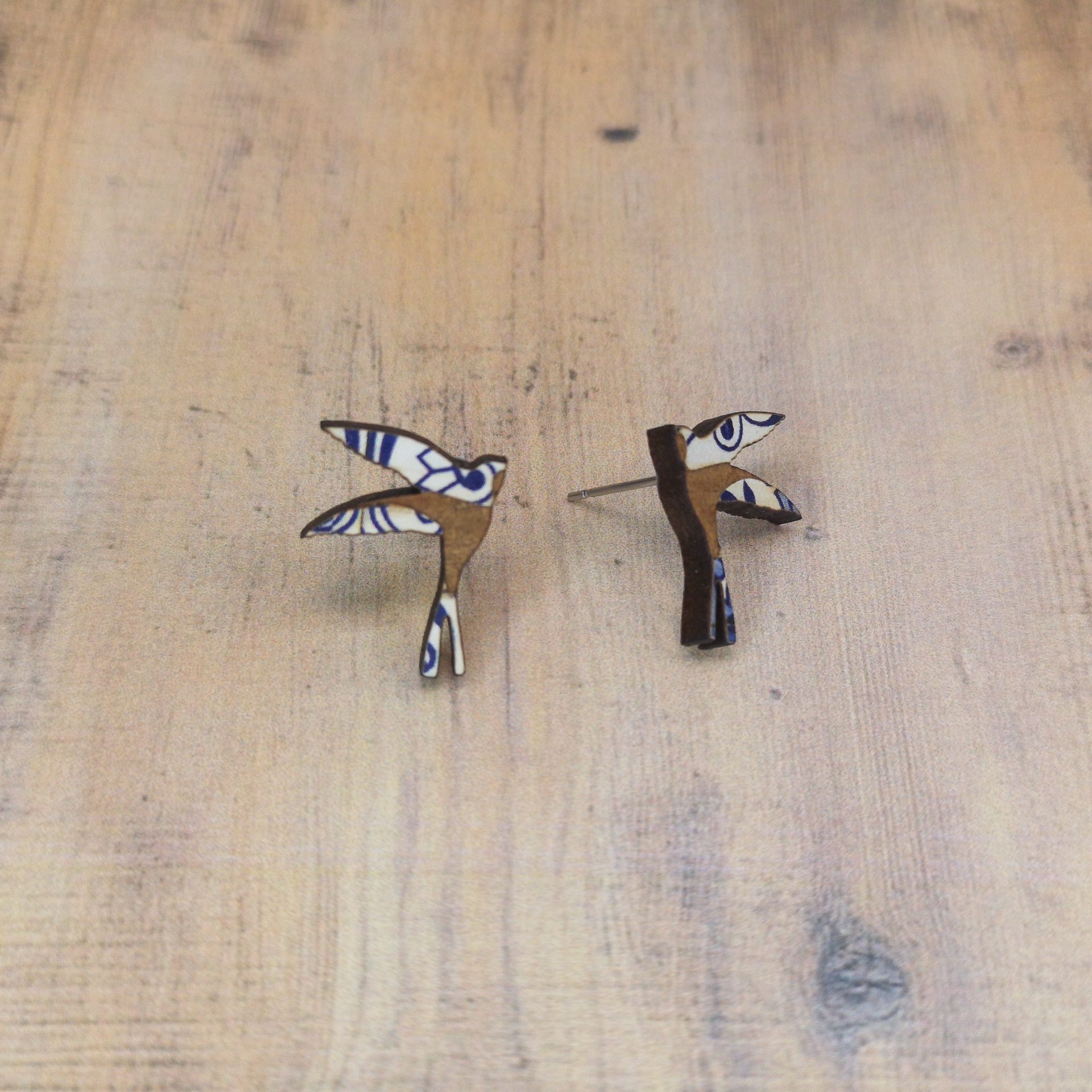 Brinco em forma de andorinha com padrão de azulejos, feito em madeira reciclada. Peça leve, artesanal e sustentável, inspirada na cultura portuguesa.
