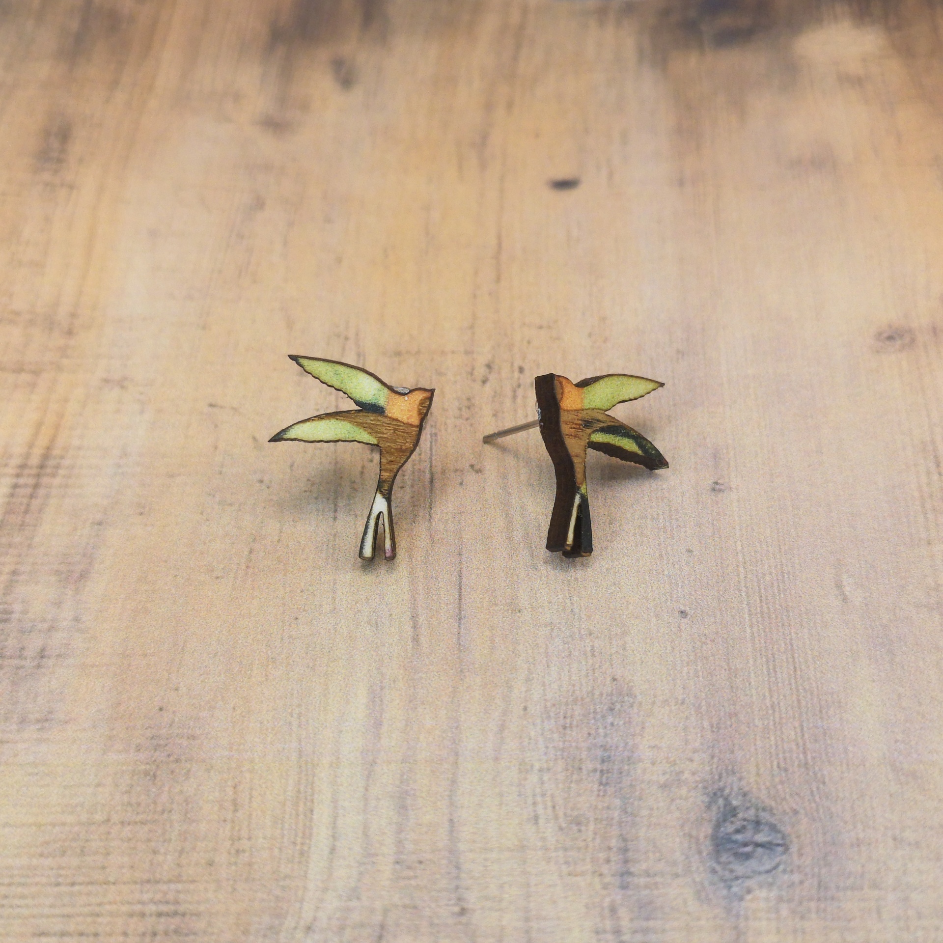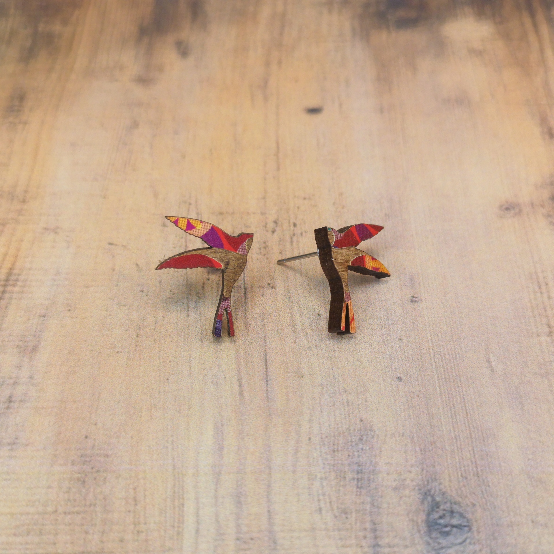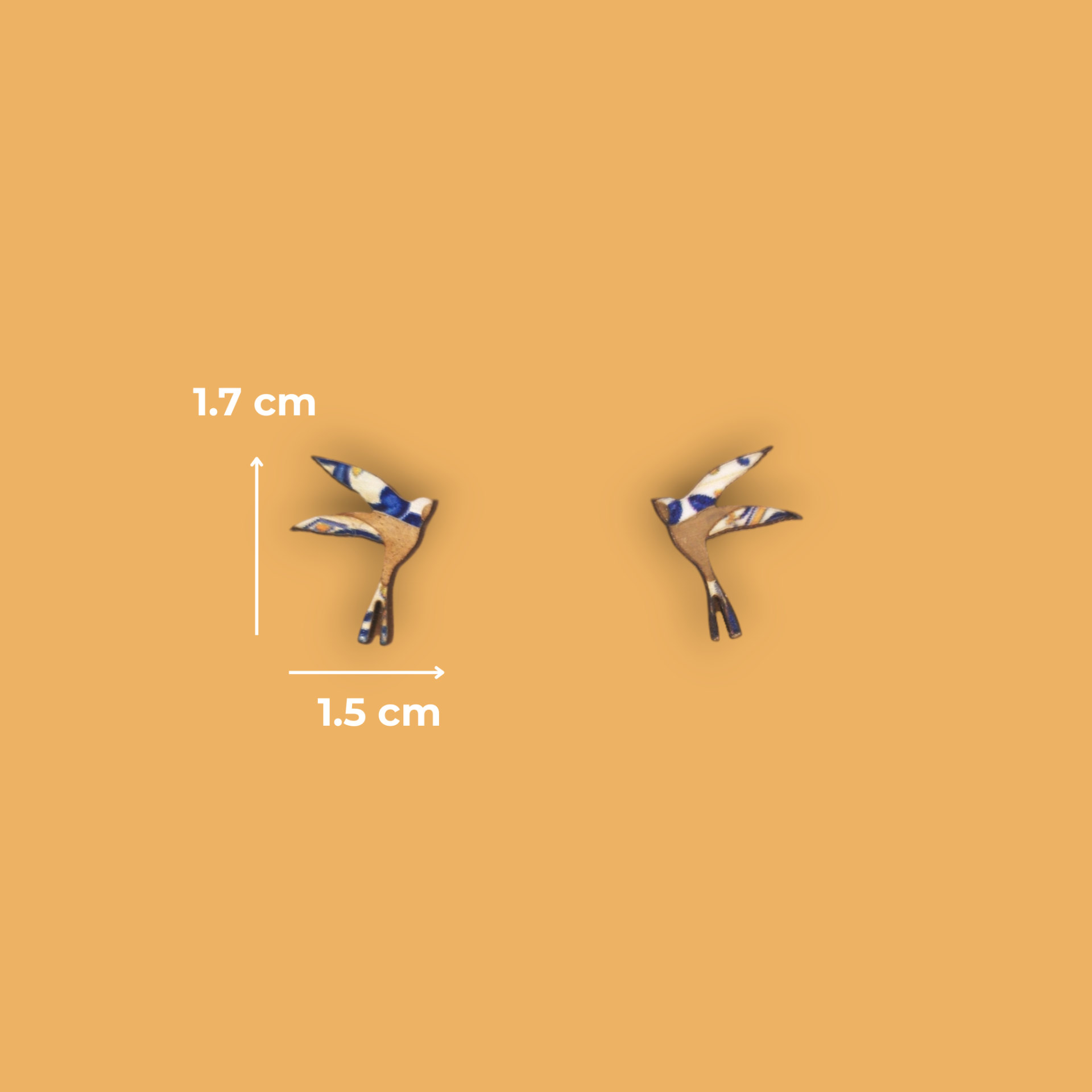 Brinco em forma de andorinha com padrão de azulejos, feito em madeira reciclada. Peça leve, artesanal e sustentável, inspirada na cultura portuguesa.