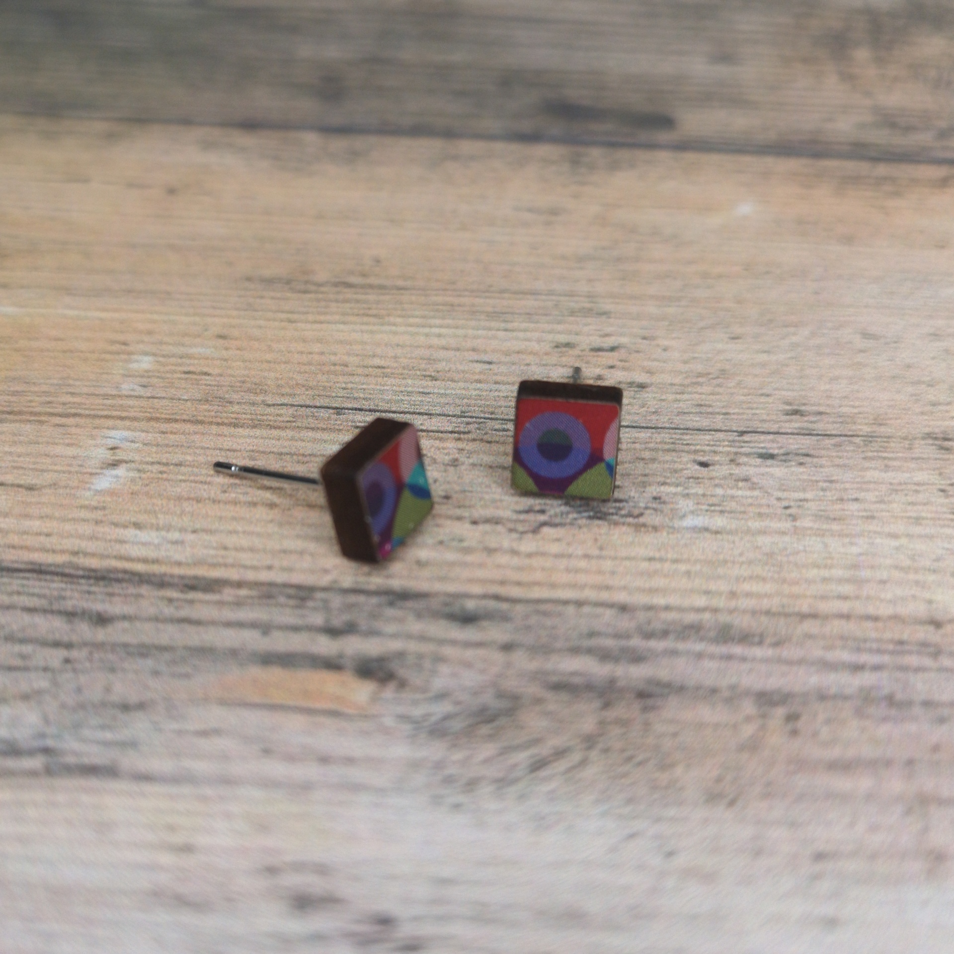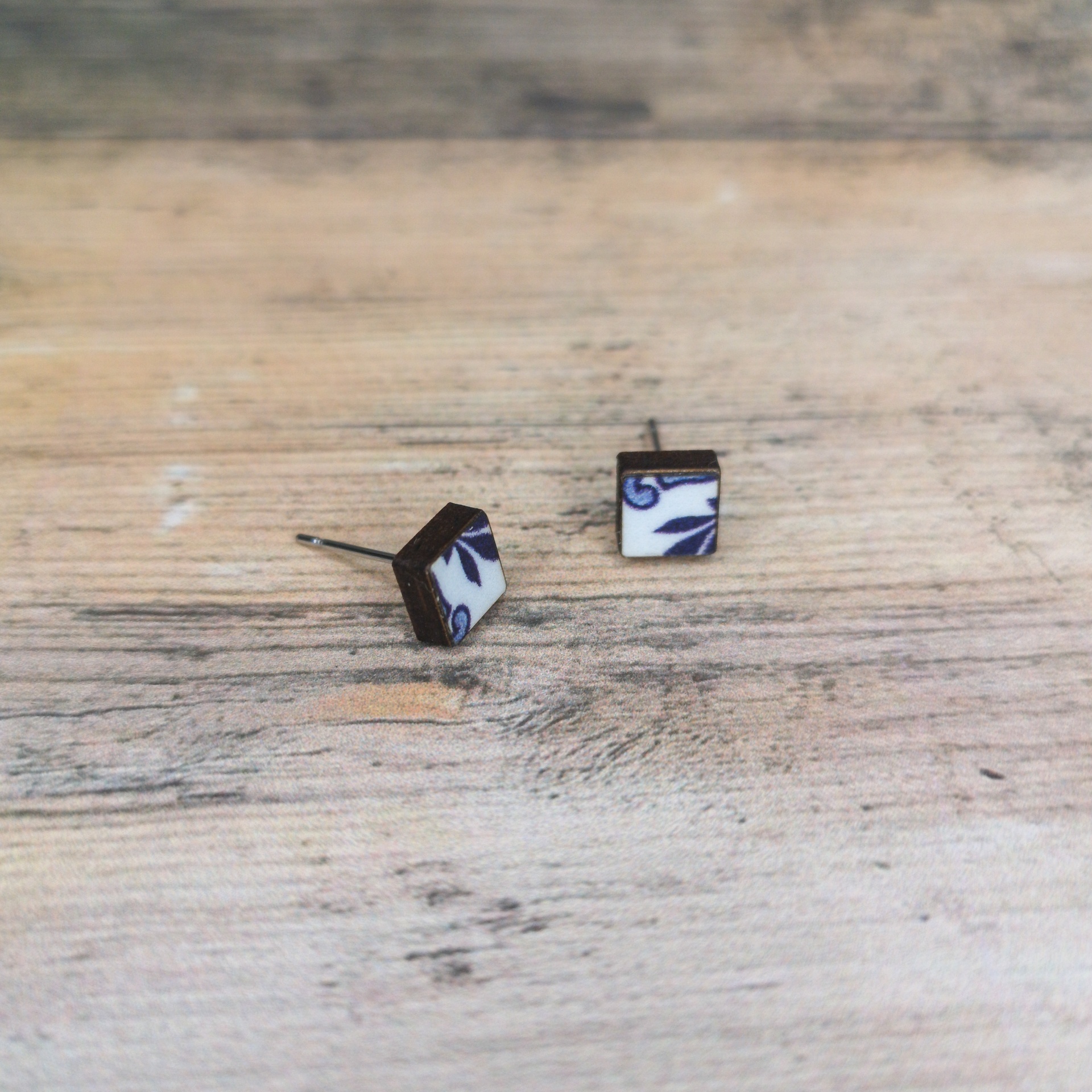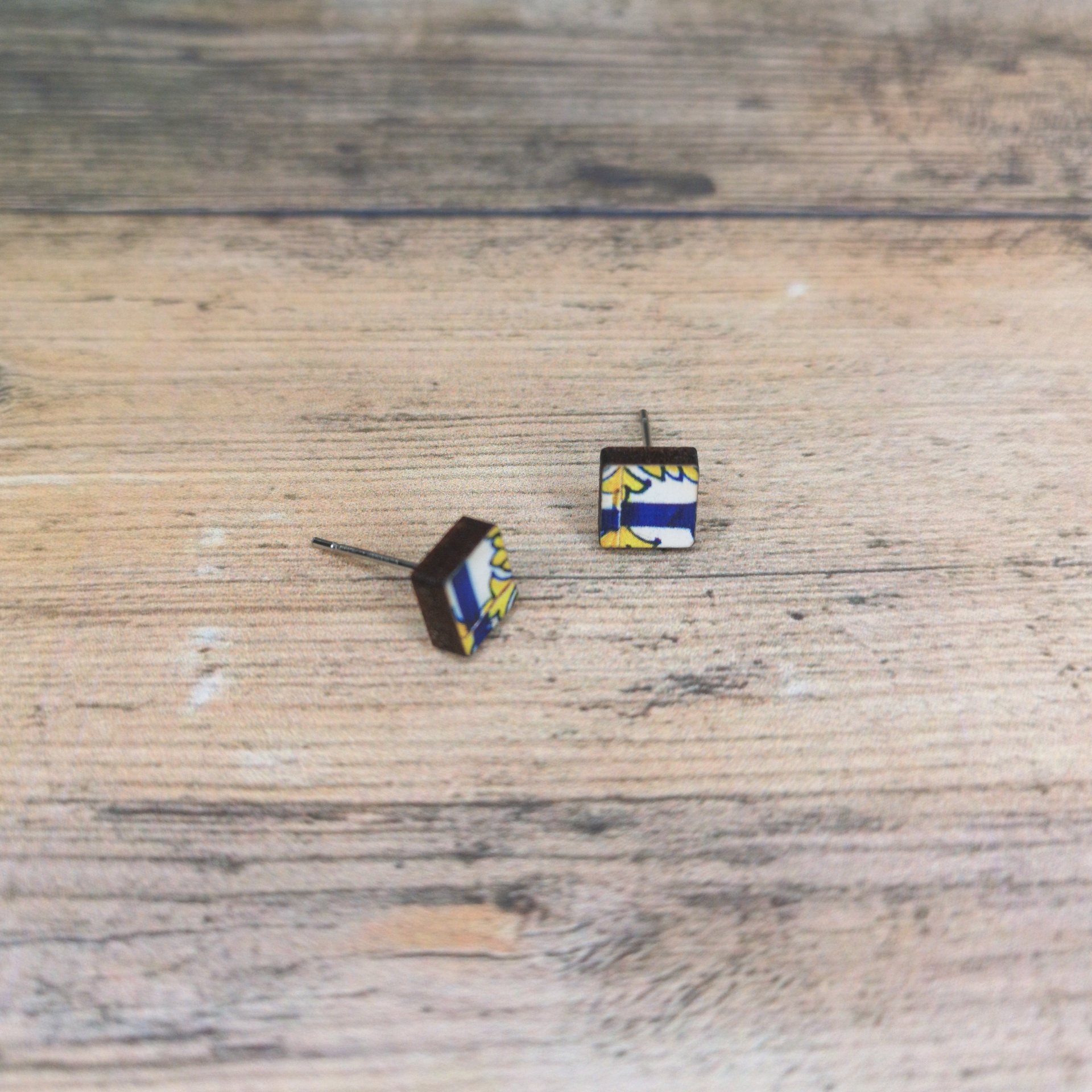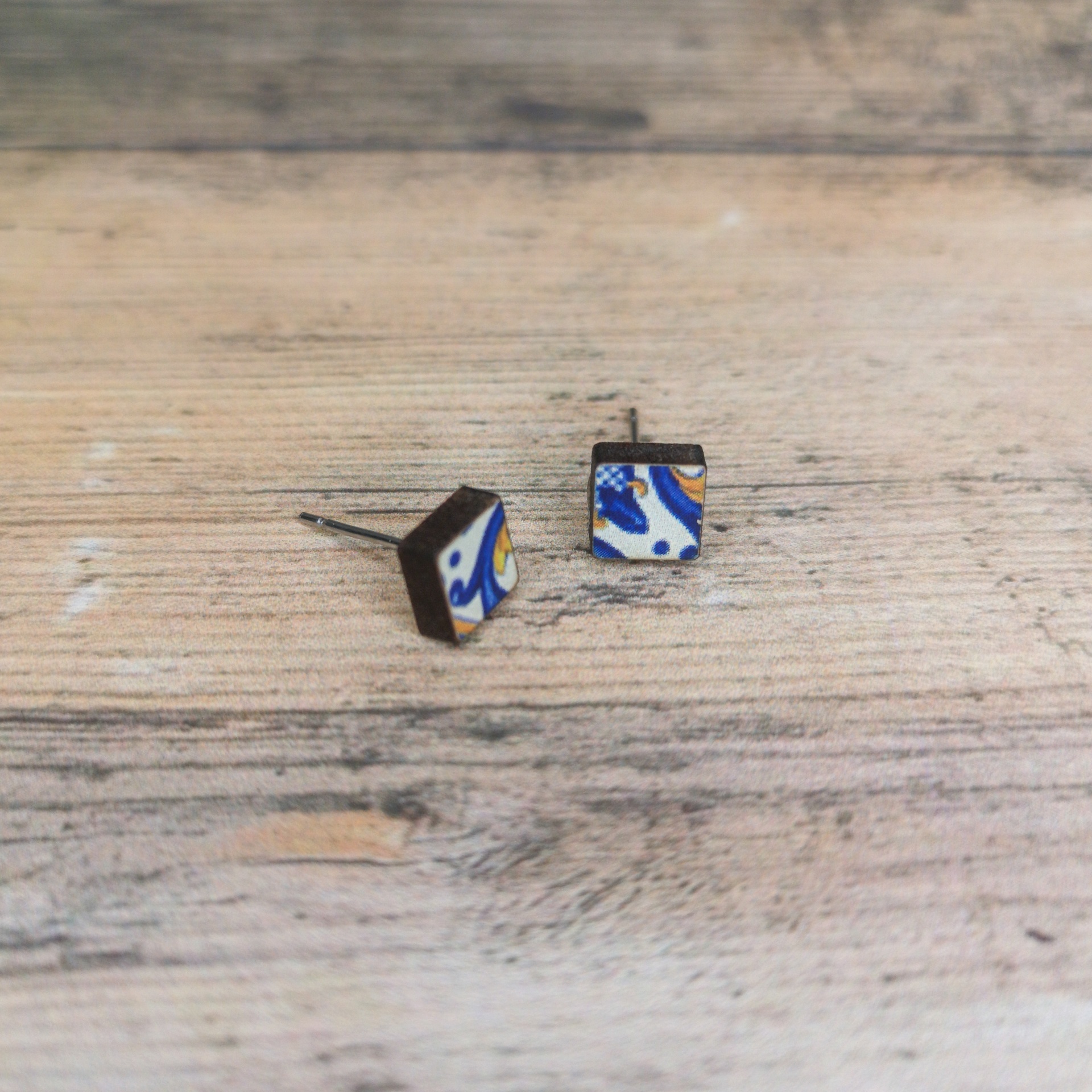 Brinco pequeno em madeira reciclada com padrão inspirado nos azulejos portugueses. Peça artesanal, ecológica e discreta, perfeita para quem aprecia acessórios sustentáveis com identidade cultural.