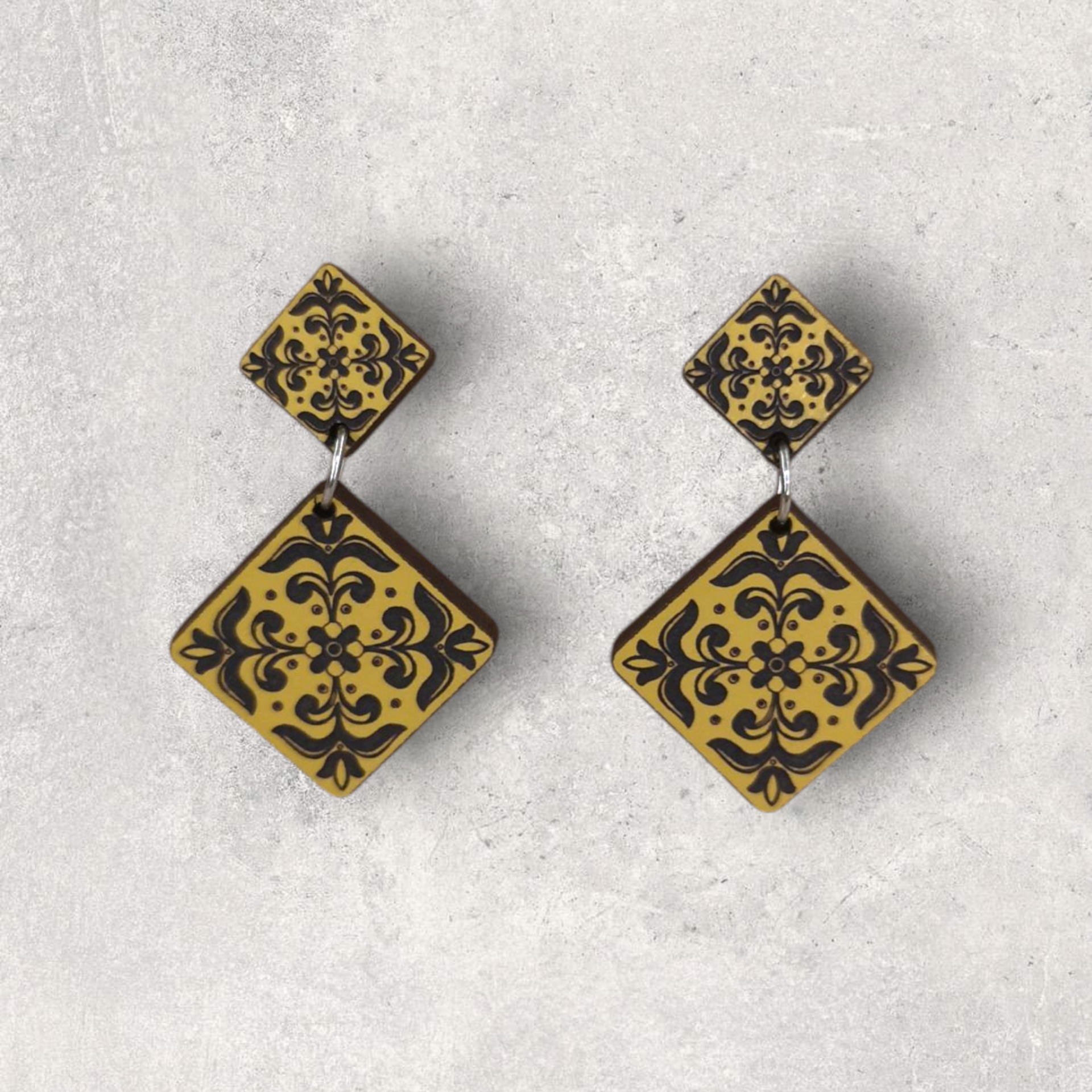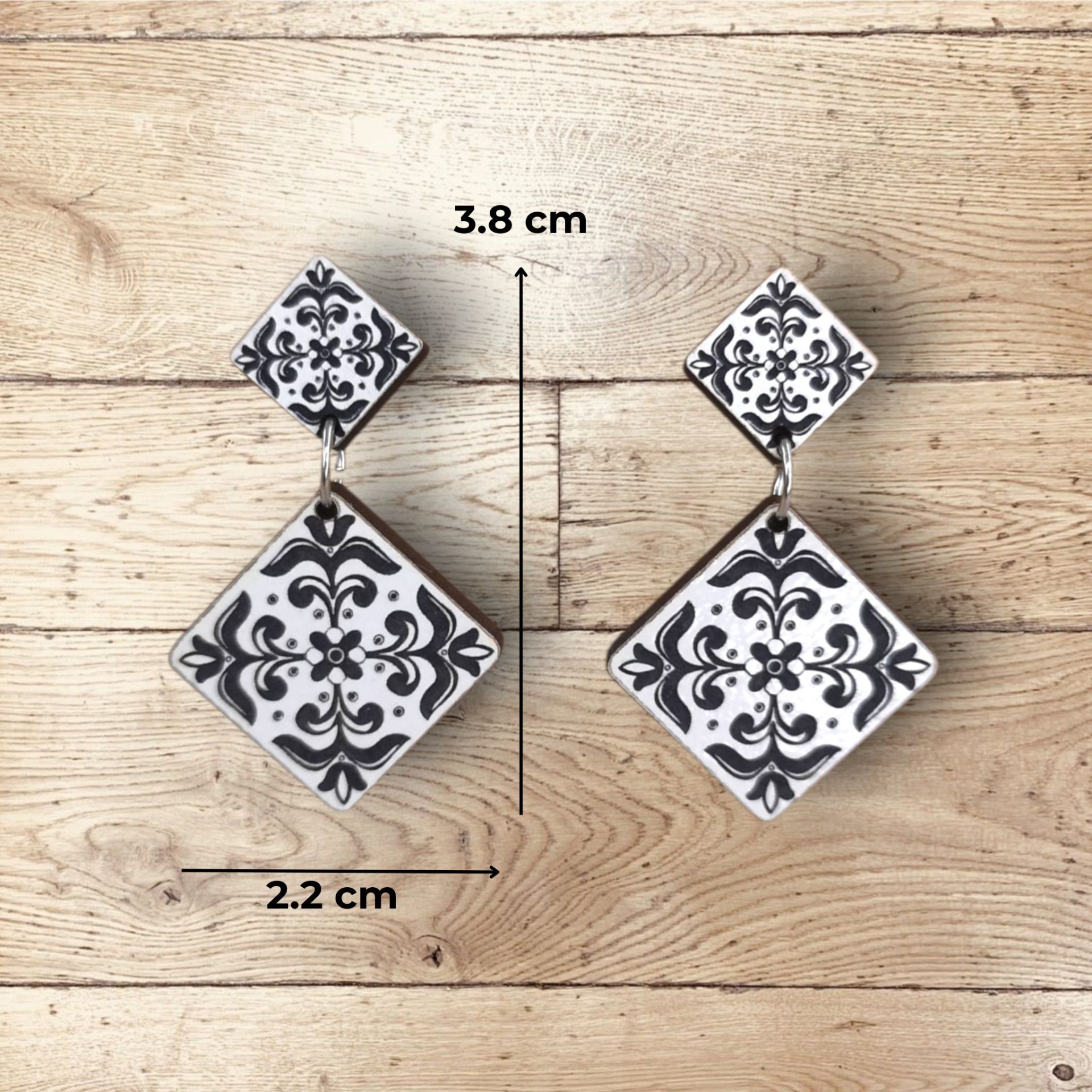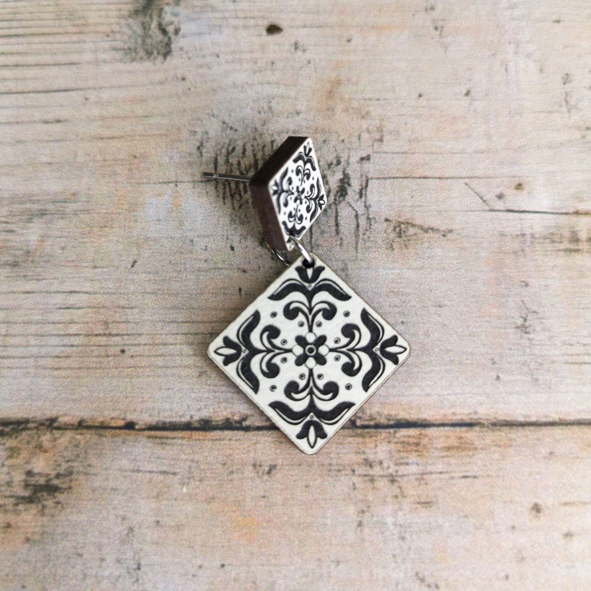 Brincos inspirados nos azulejos portugueses, produzidos em MDF reciclado e pintados com tintas à base de água. Sustentáveis, leves e cheios de elegância artesanal.