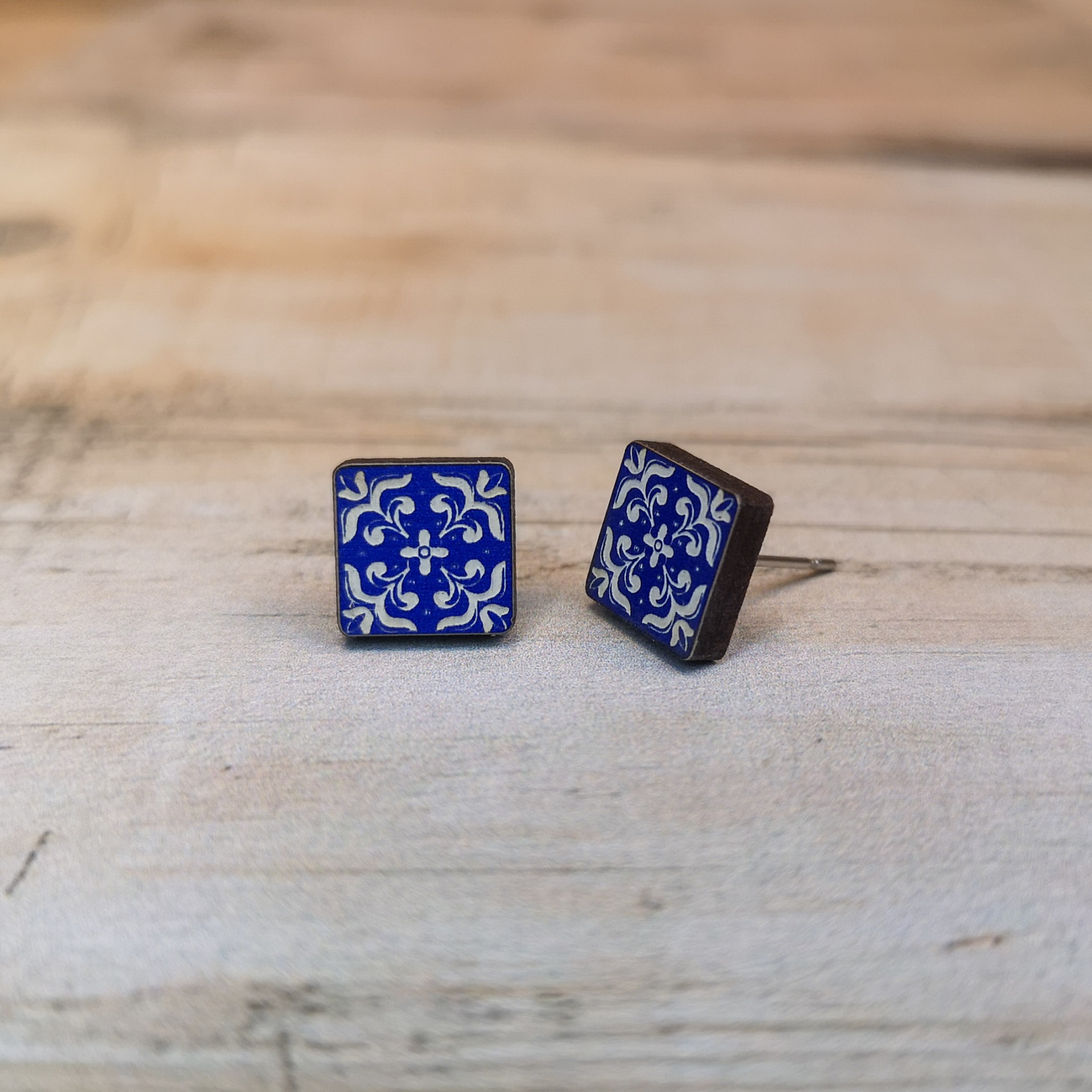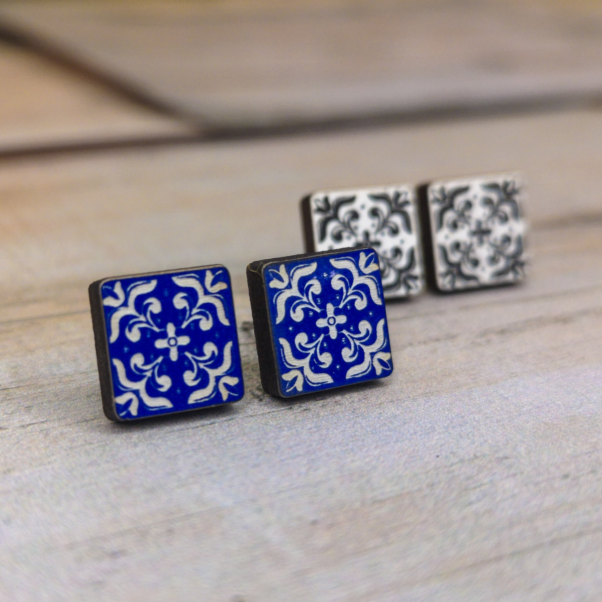 Brincos inspirados nos azulejos portugueses, produzidos em MDF reciclado e pintados com tintas à base de água. Sustentáveis, leves e cheios de elegância artesanal.