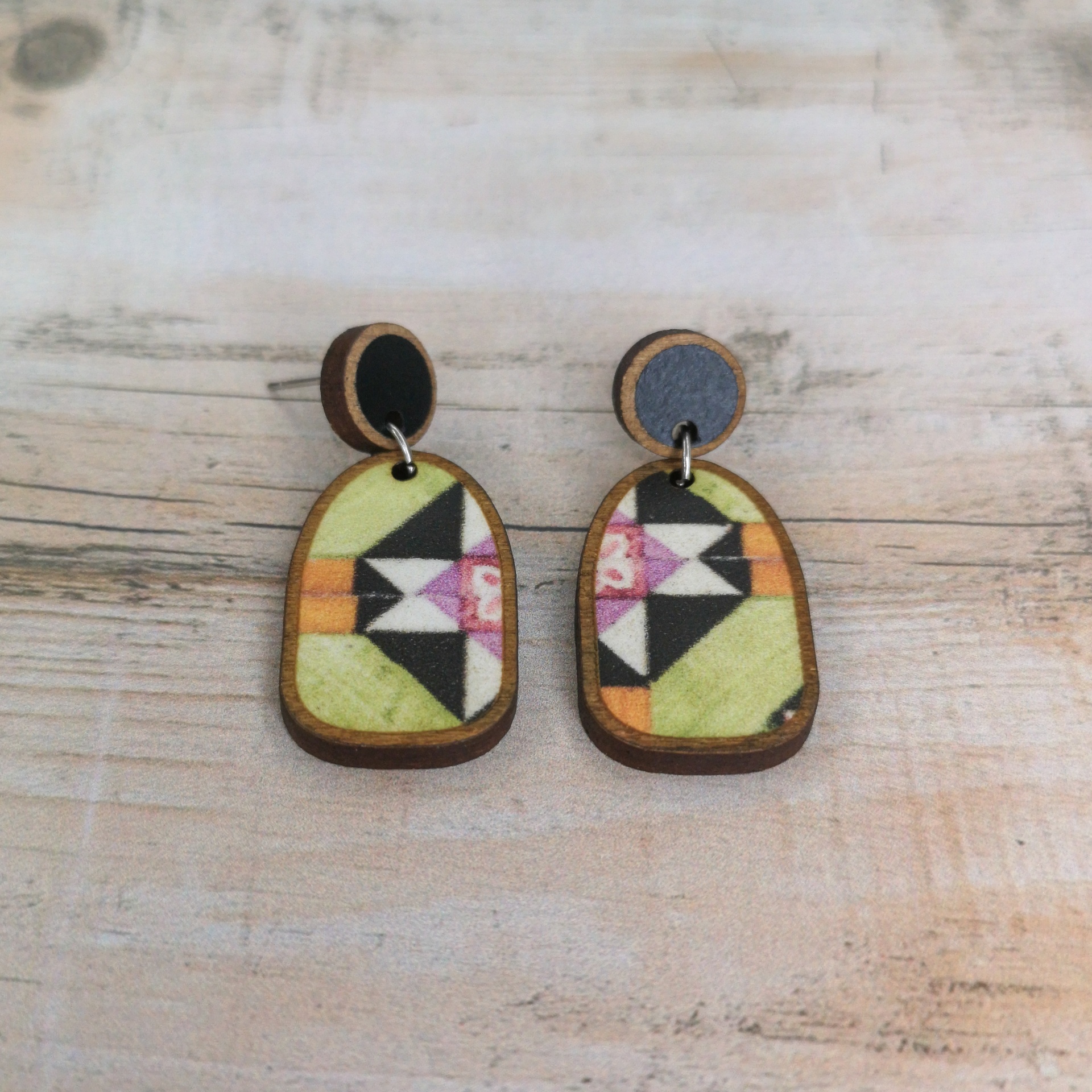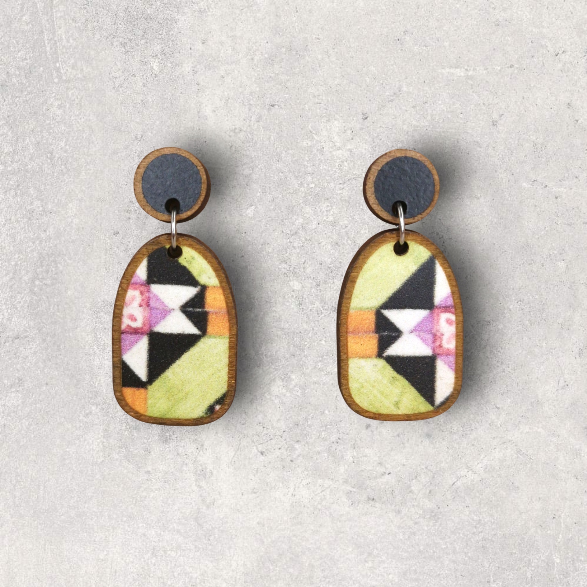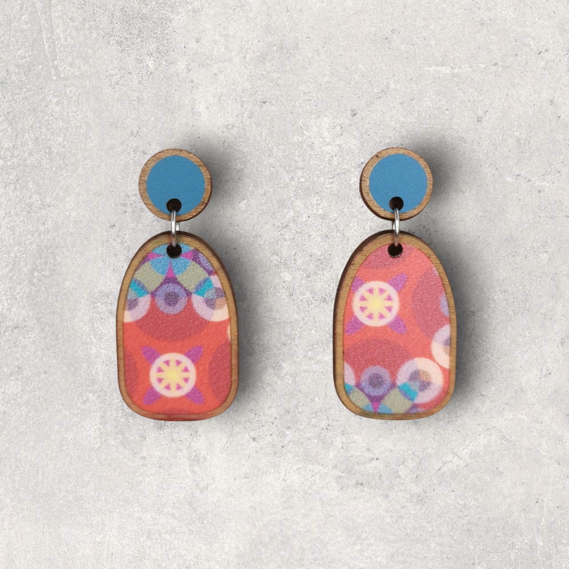 Brincos em estilo boho inspirados nos padrões tradicionais portugueses, produzidos em madeira MDF reciclada e pintados com tintas à base de água.