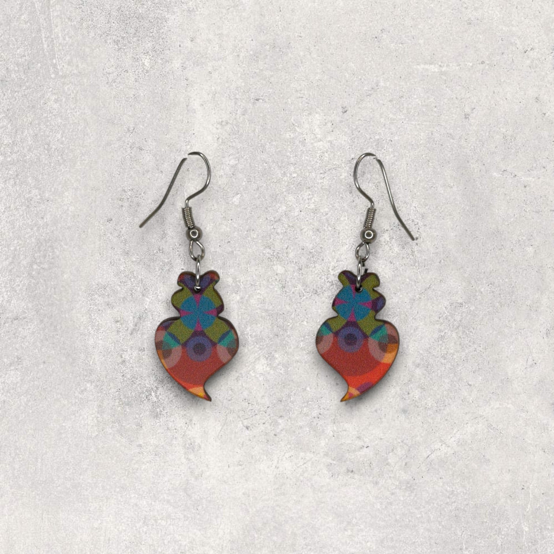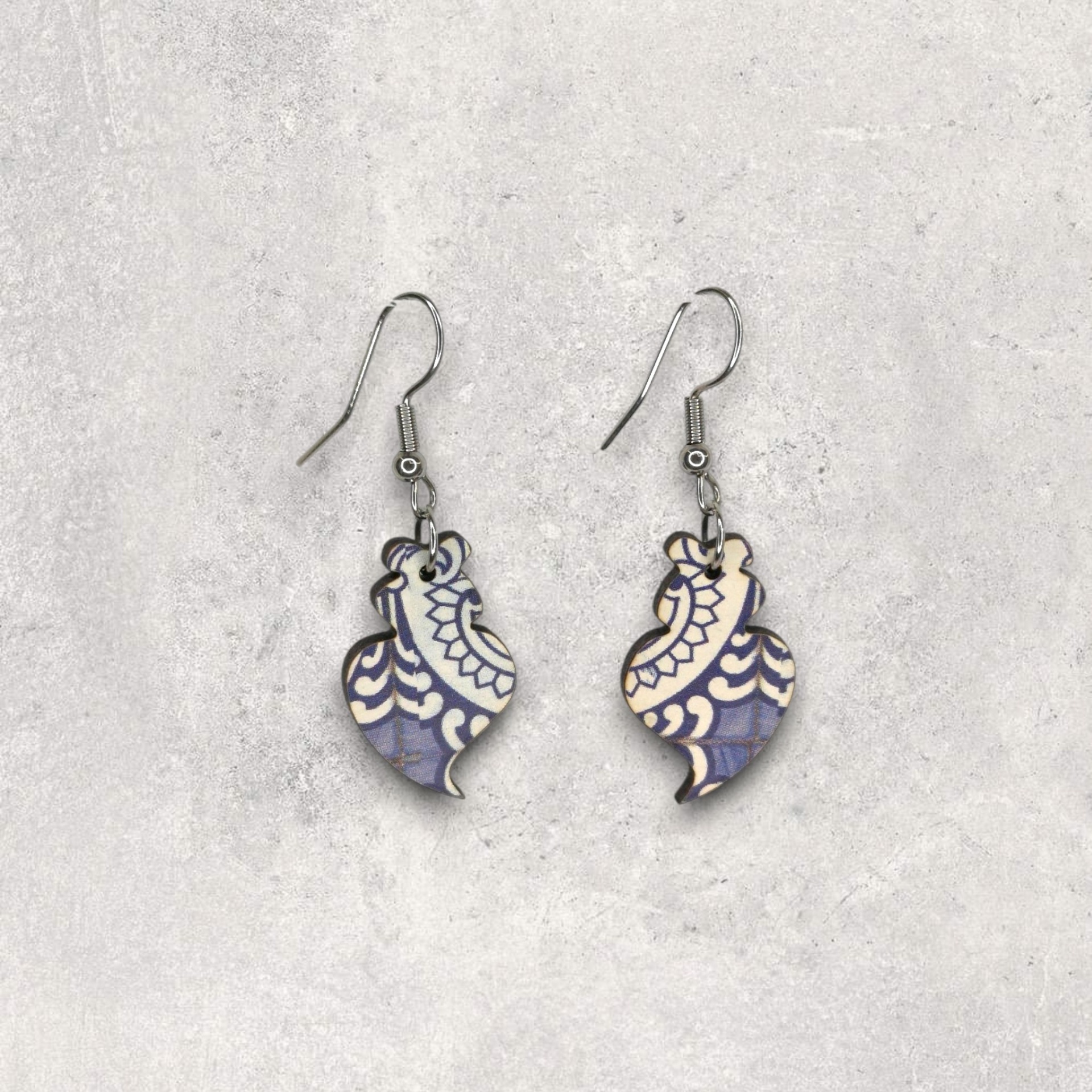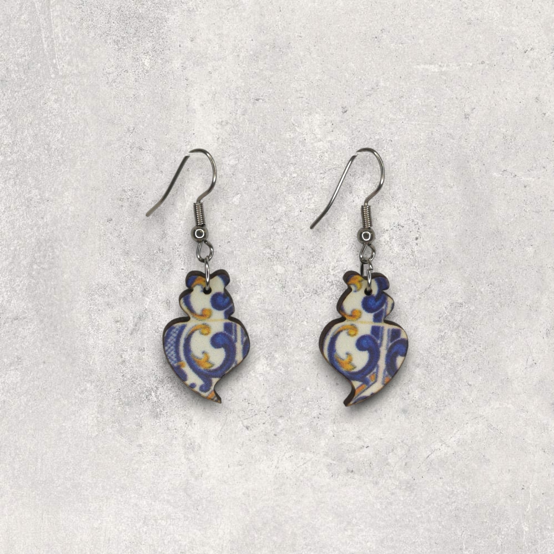 Brincos em madeira MDF reciclada em formato de Coração de Viana com padrão inspirado nos tradicionais azulejos portugueses. Acessórios artesanais que unem tradição, cultura e design português.