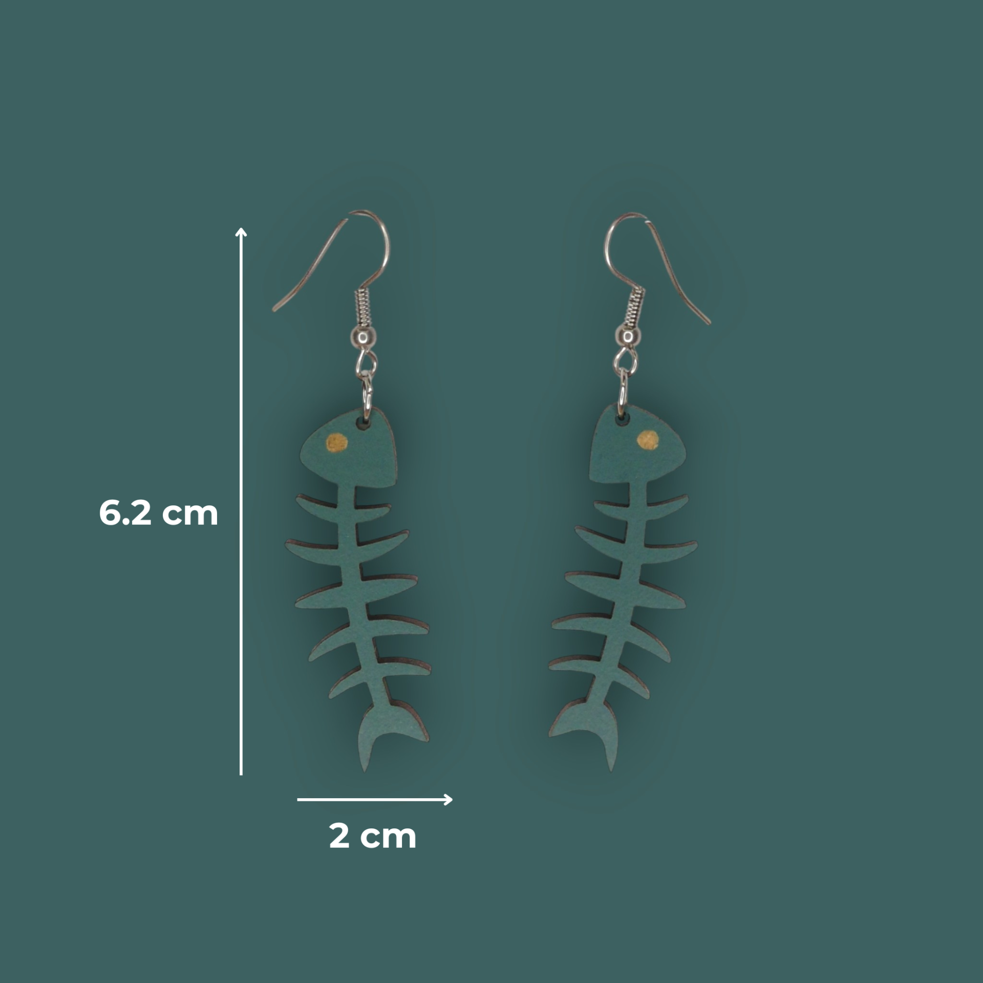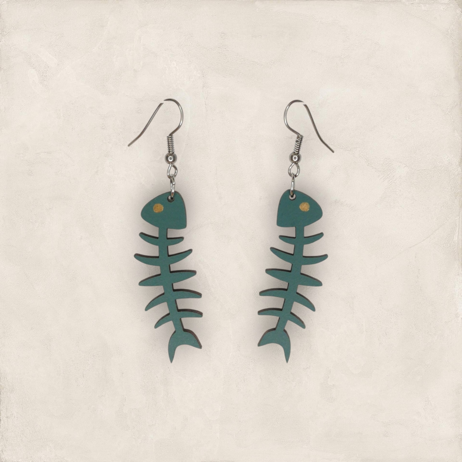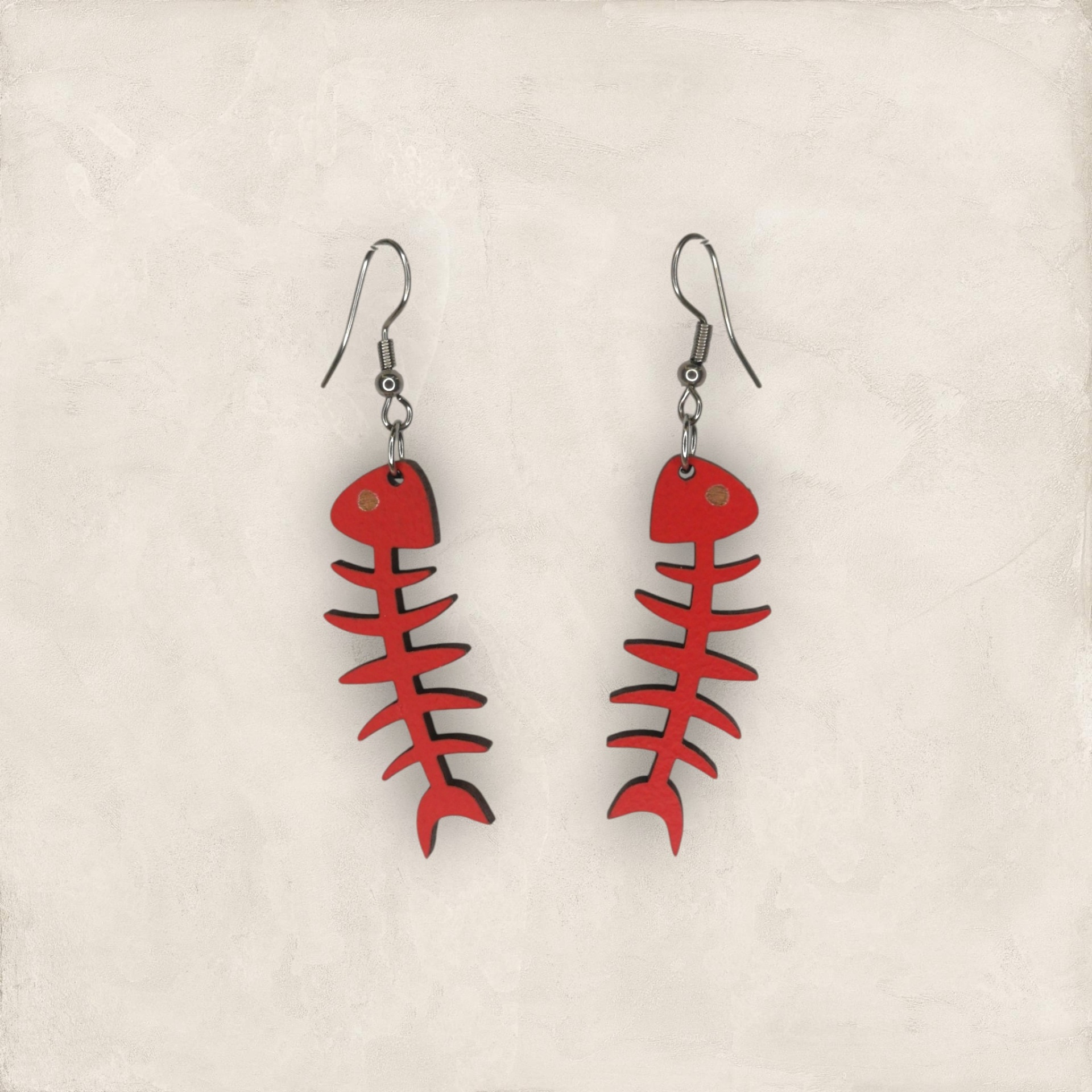 Brincos em formato de espinha de peixe, feitos em madeira reciclada e pintados com tintas à base de água. Artesanais, leves e sustentáveis.