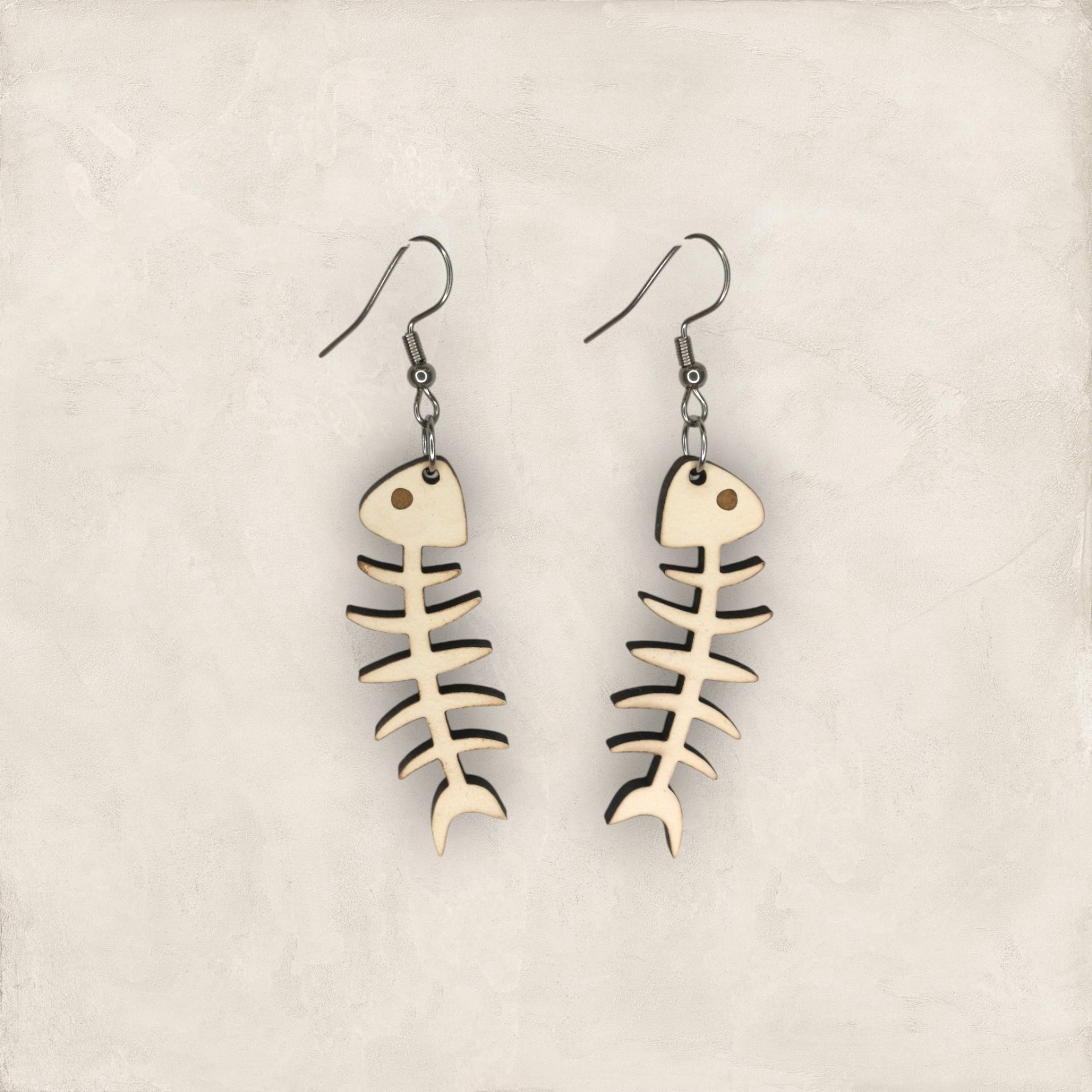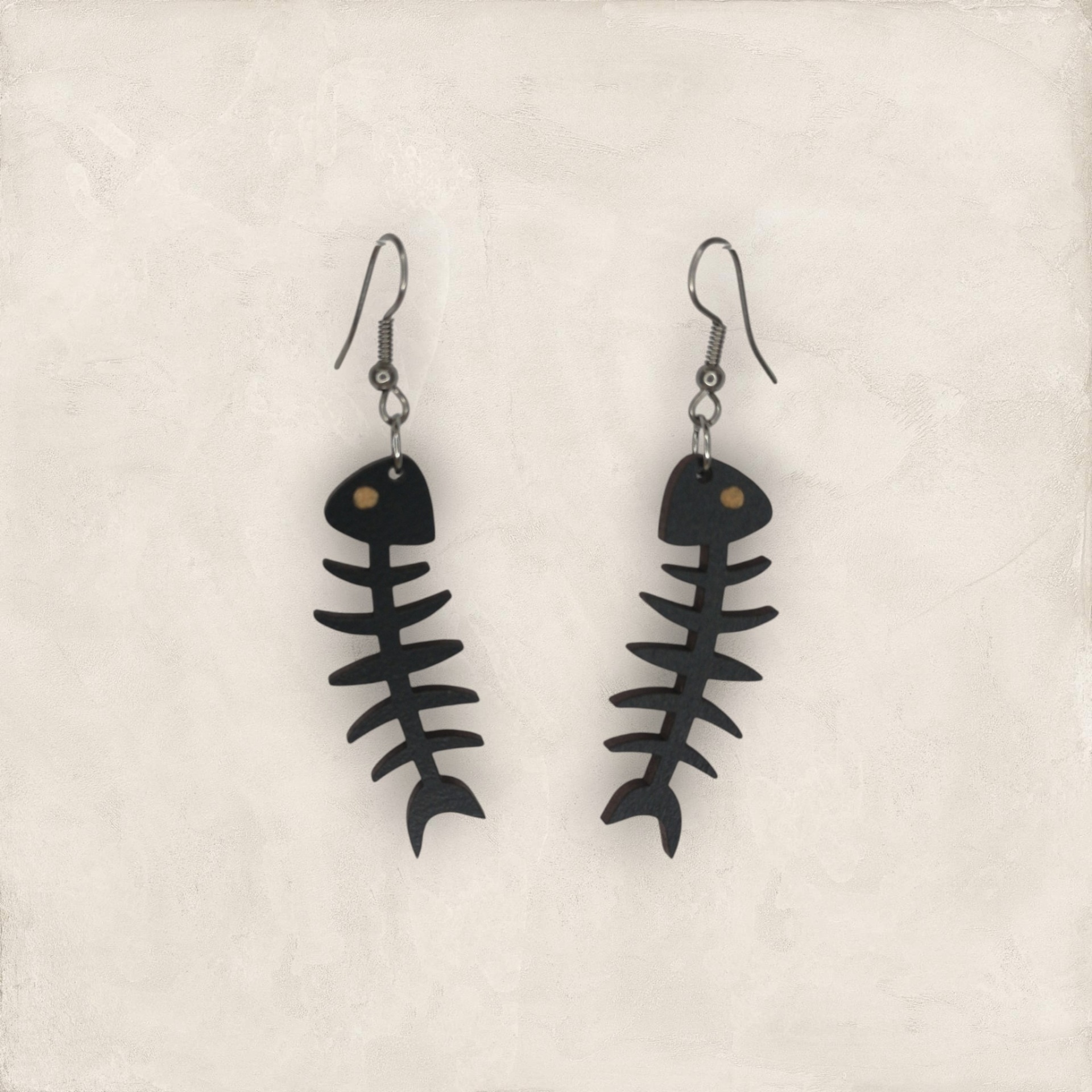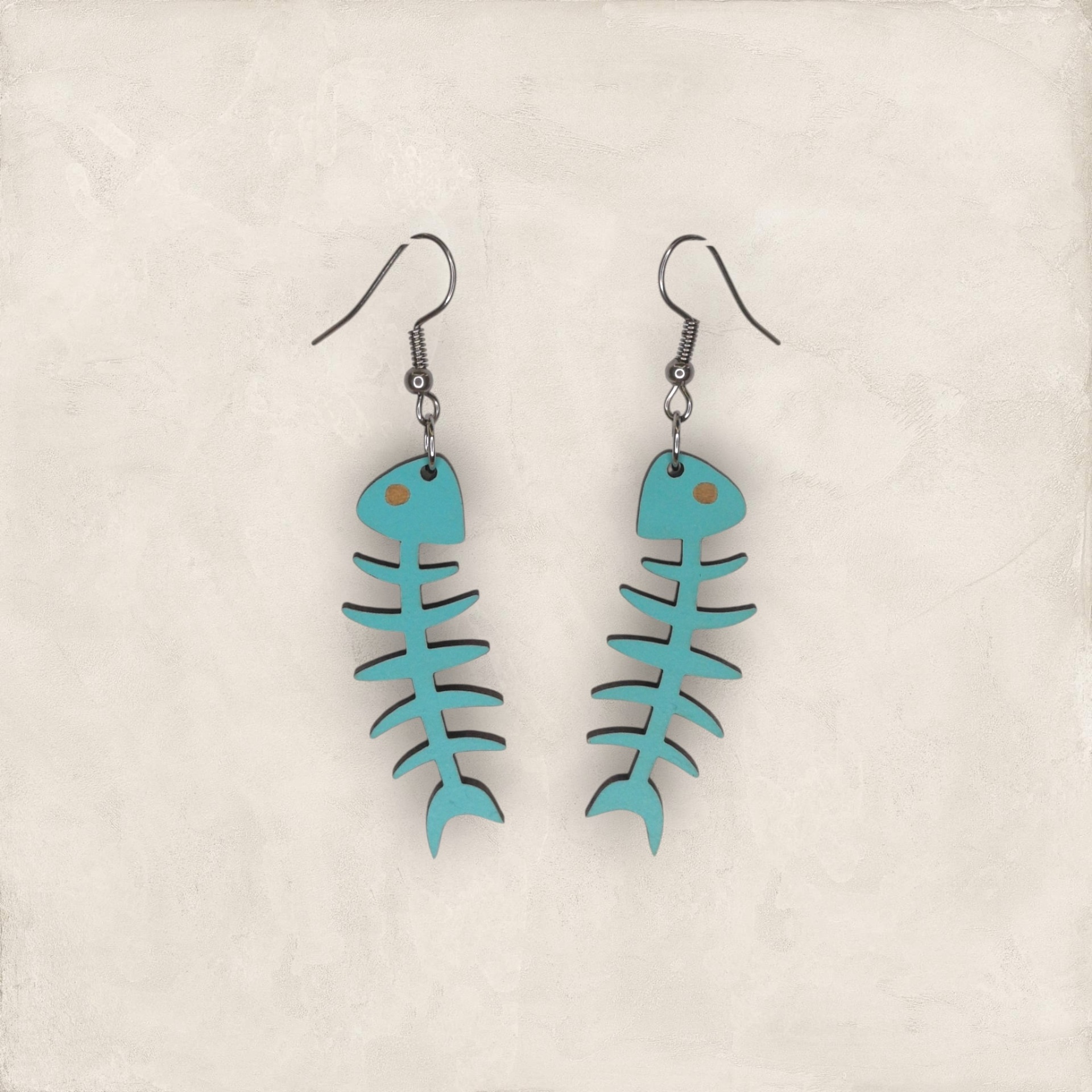 Brincos em formato de espinha de peixe, feitos em madeira reciclada e pintados com tintas à base de água. Artesanais, leves e sustentáveis.