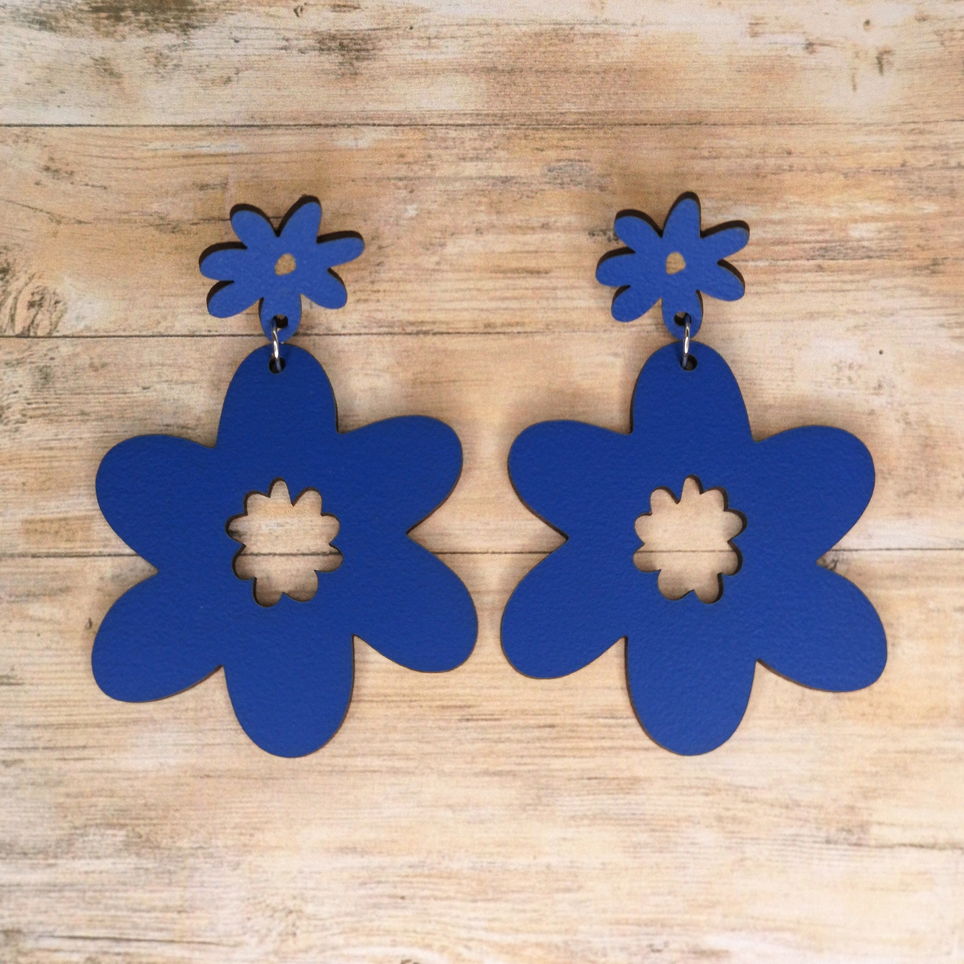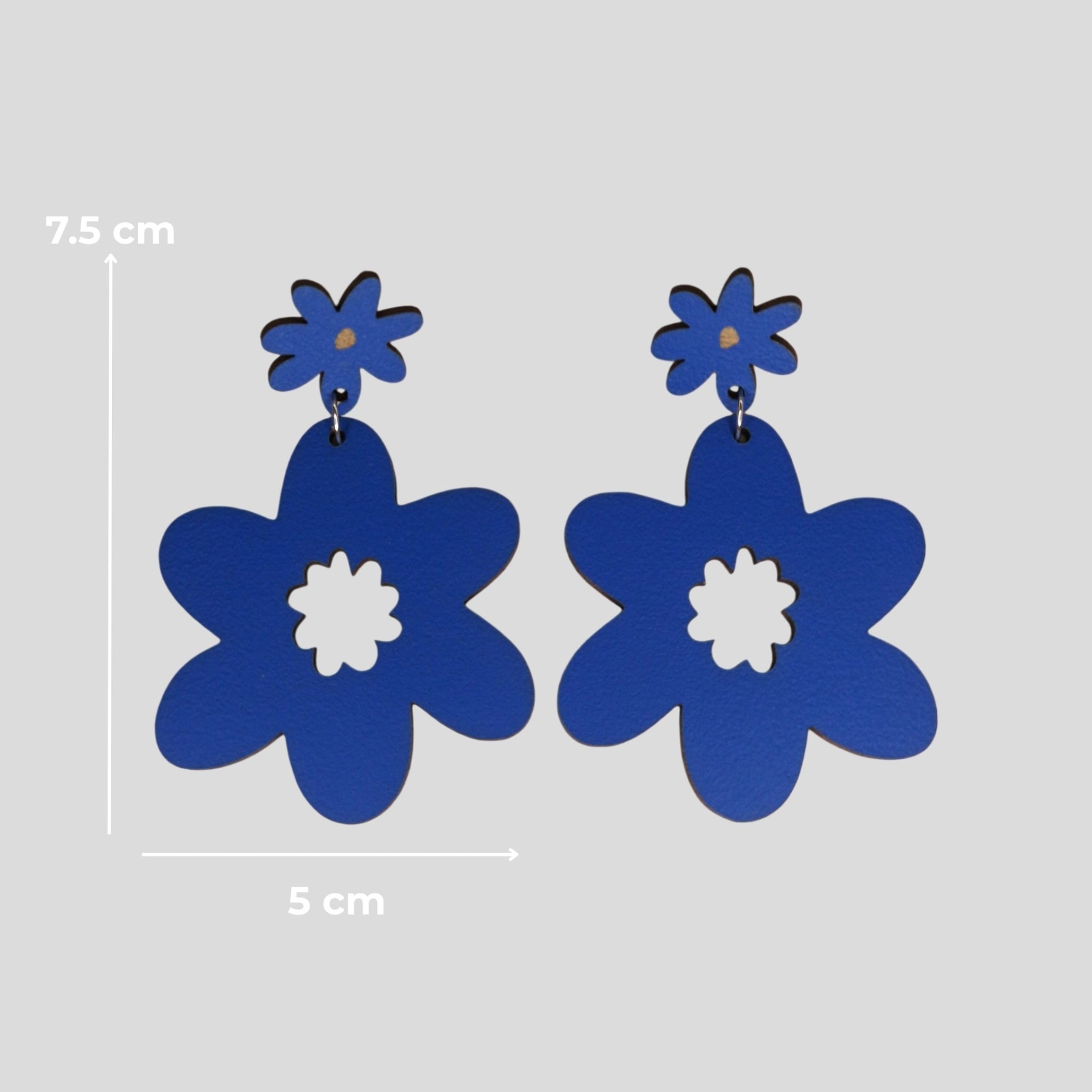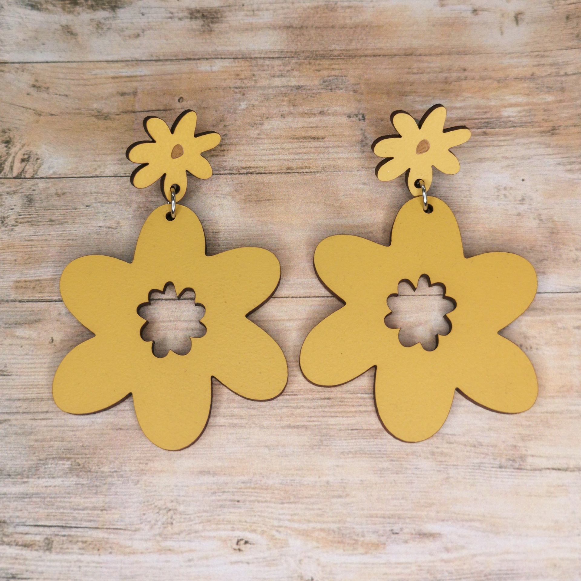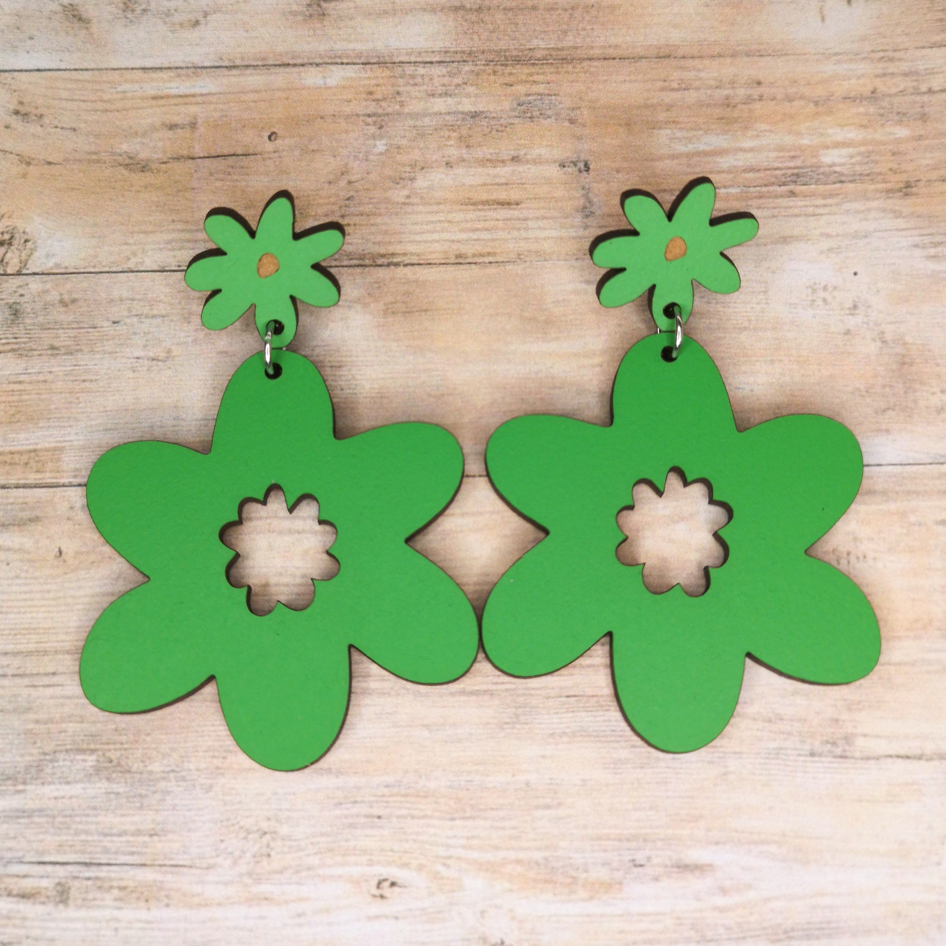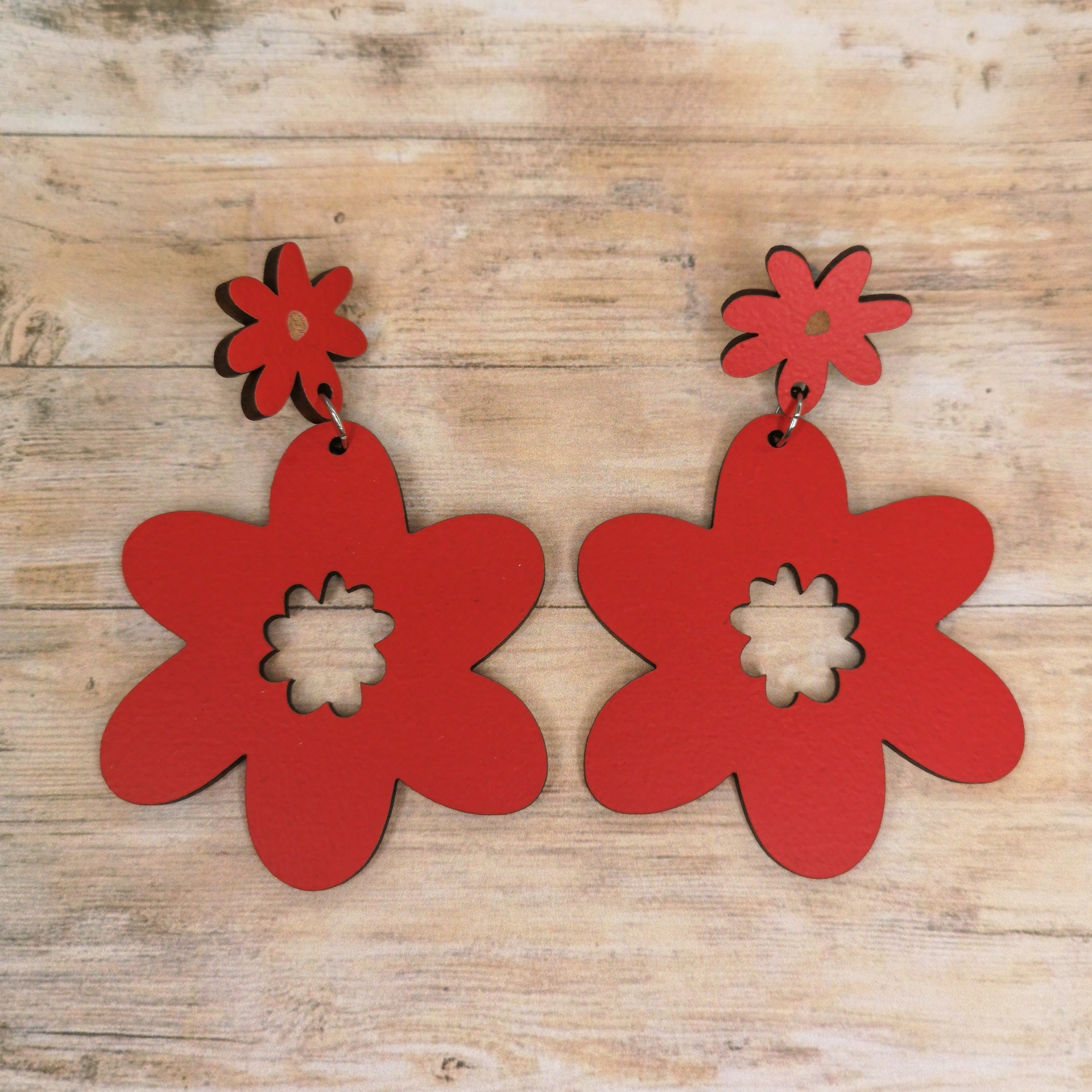 Brinco grande em flor dupla, feito em madeira reciclada e pintado com tintas à base de água.