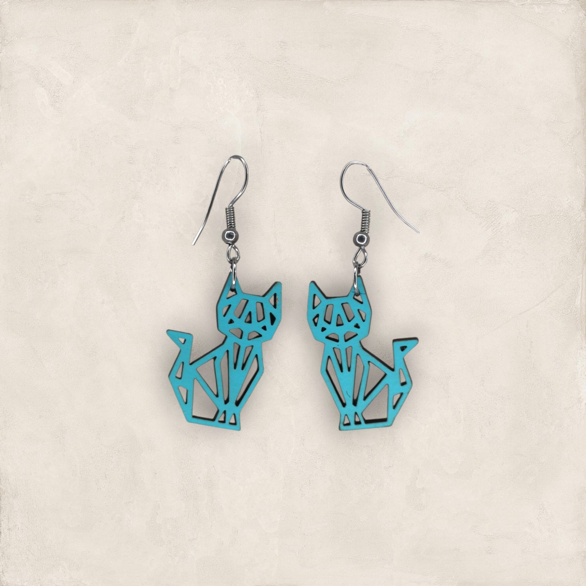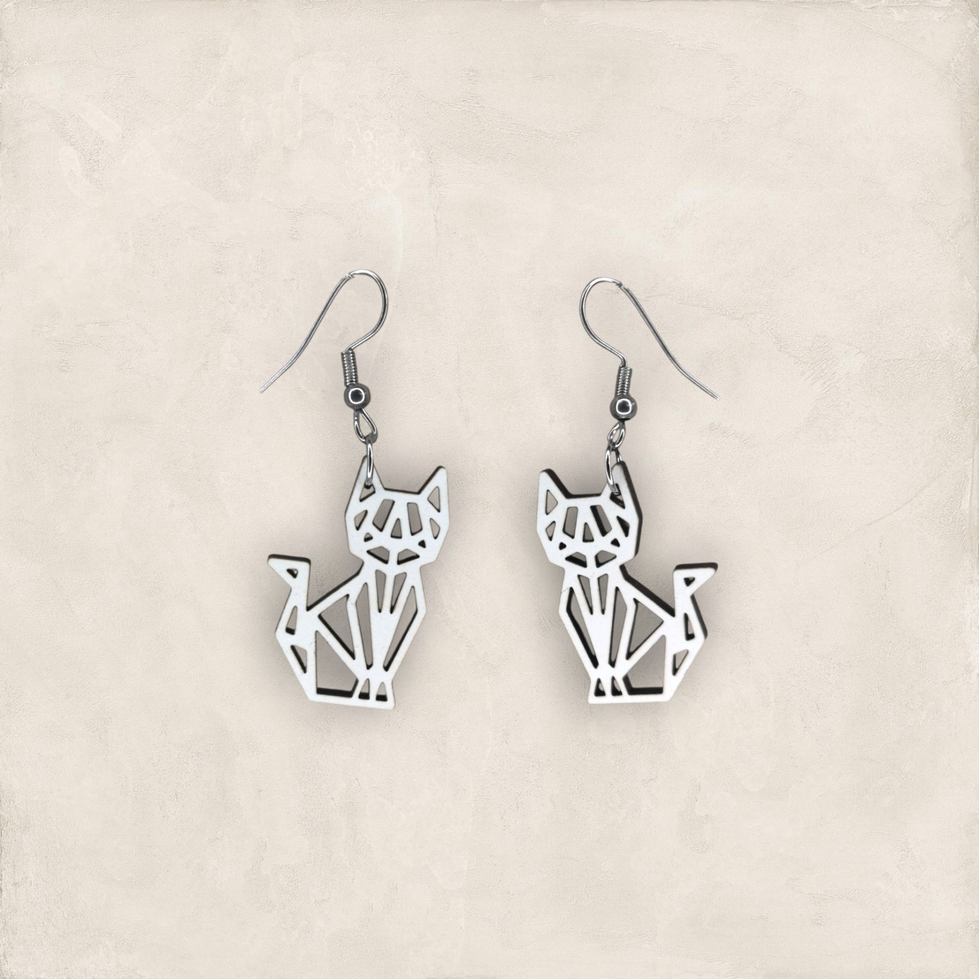 Brincos em formato de gato origami feito em Portugal com madeira reciclada e tintas à base de água. Sustentável, delicado e cheio de estilo.