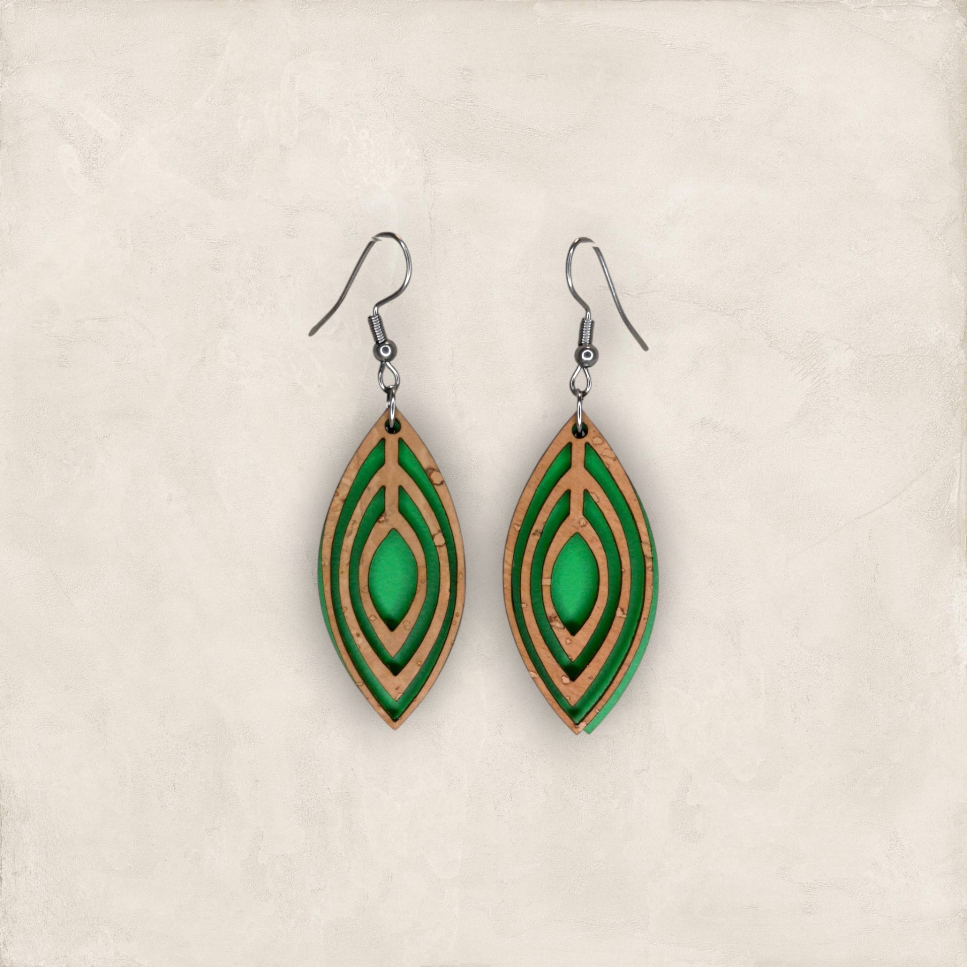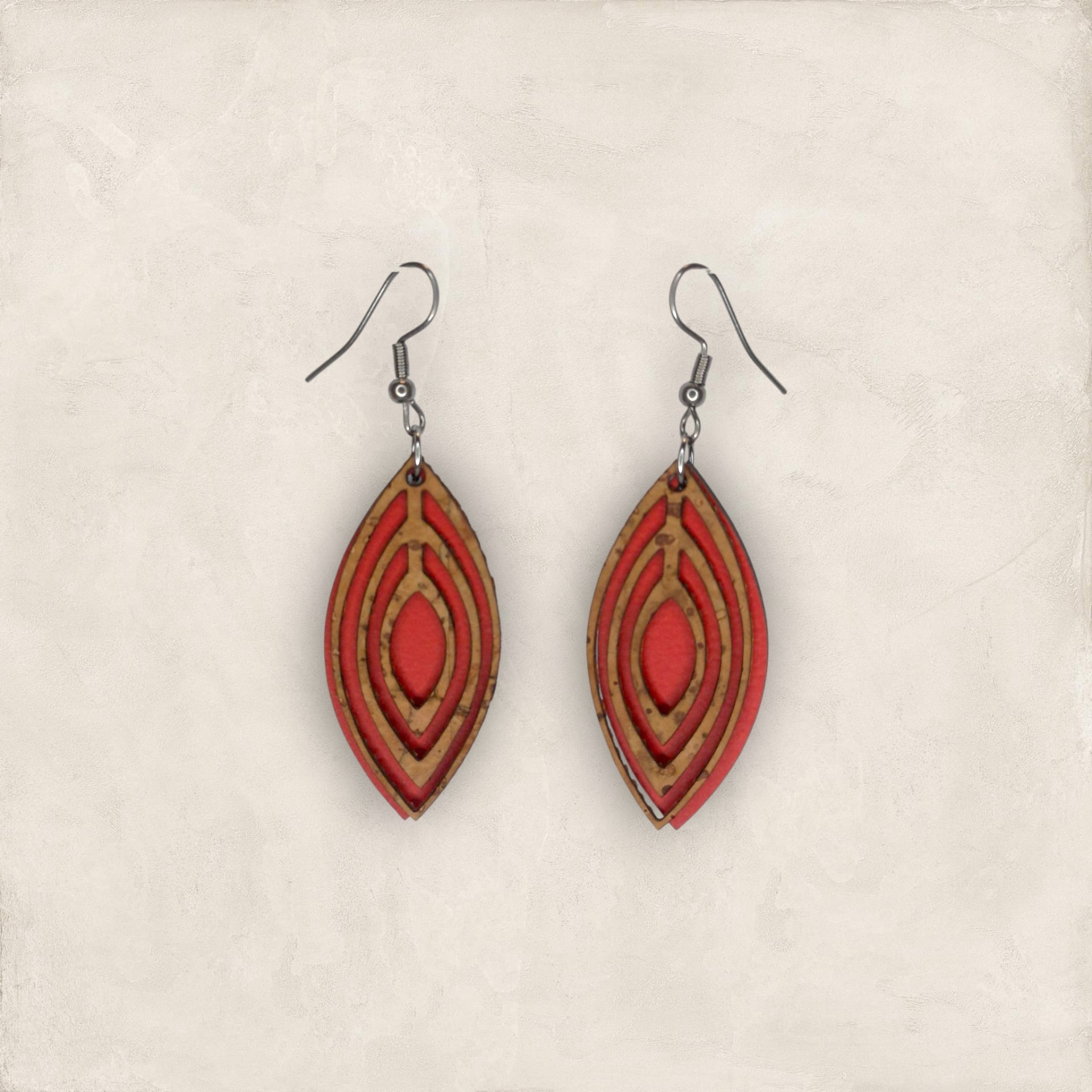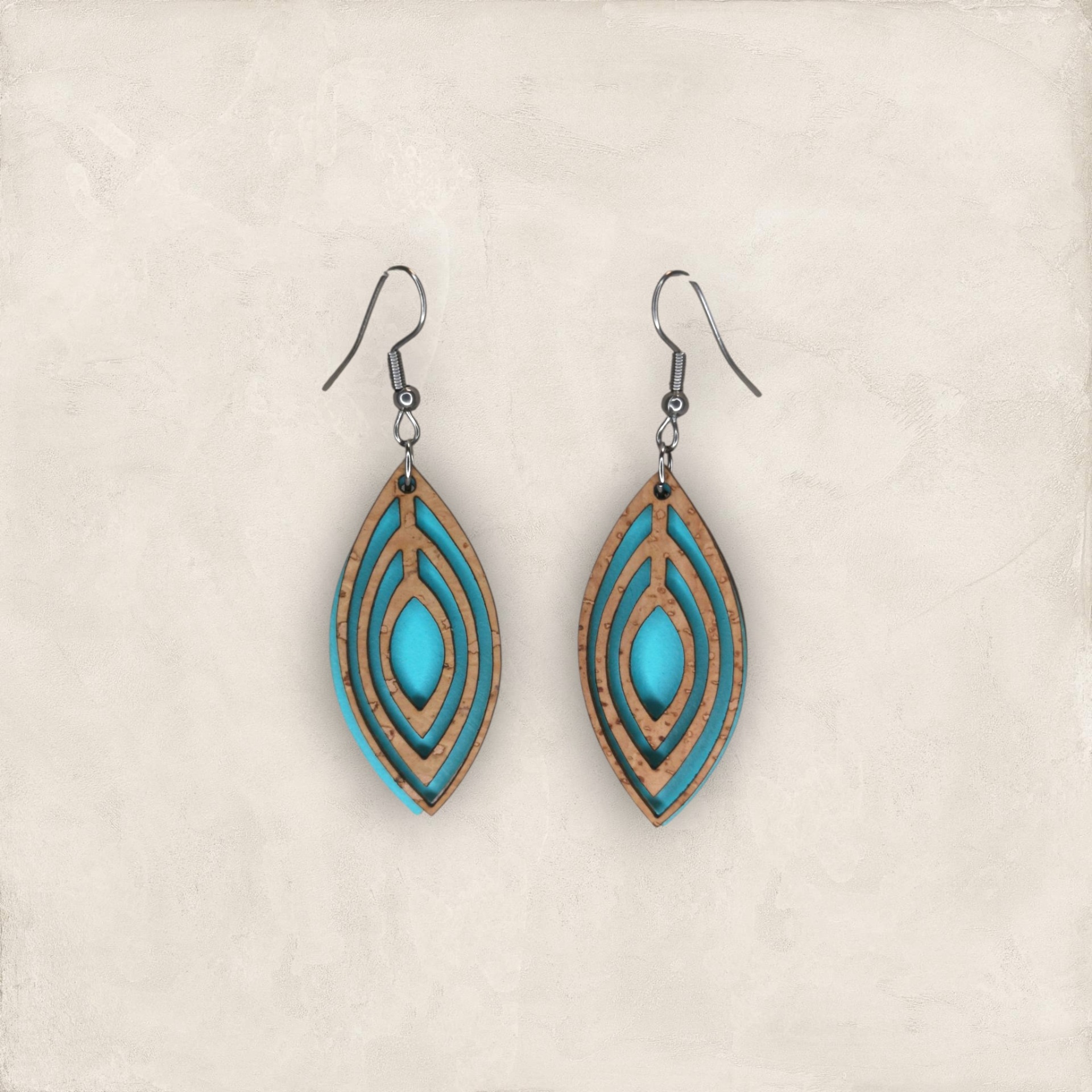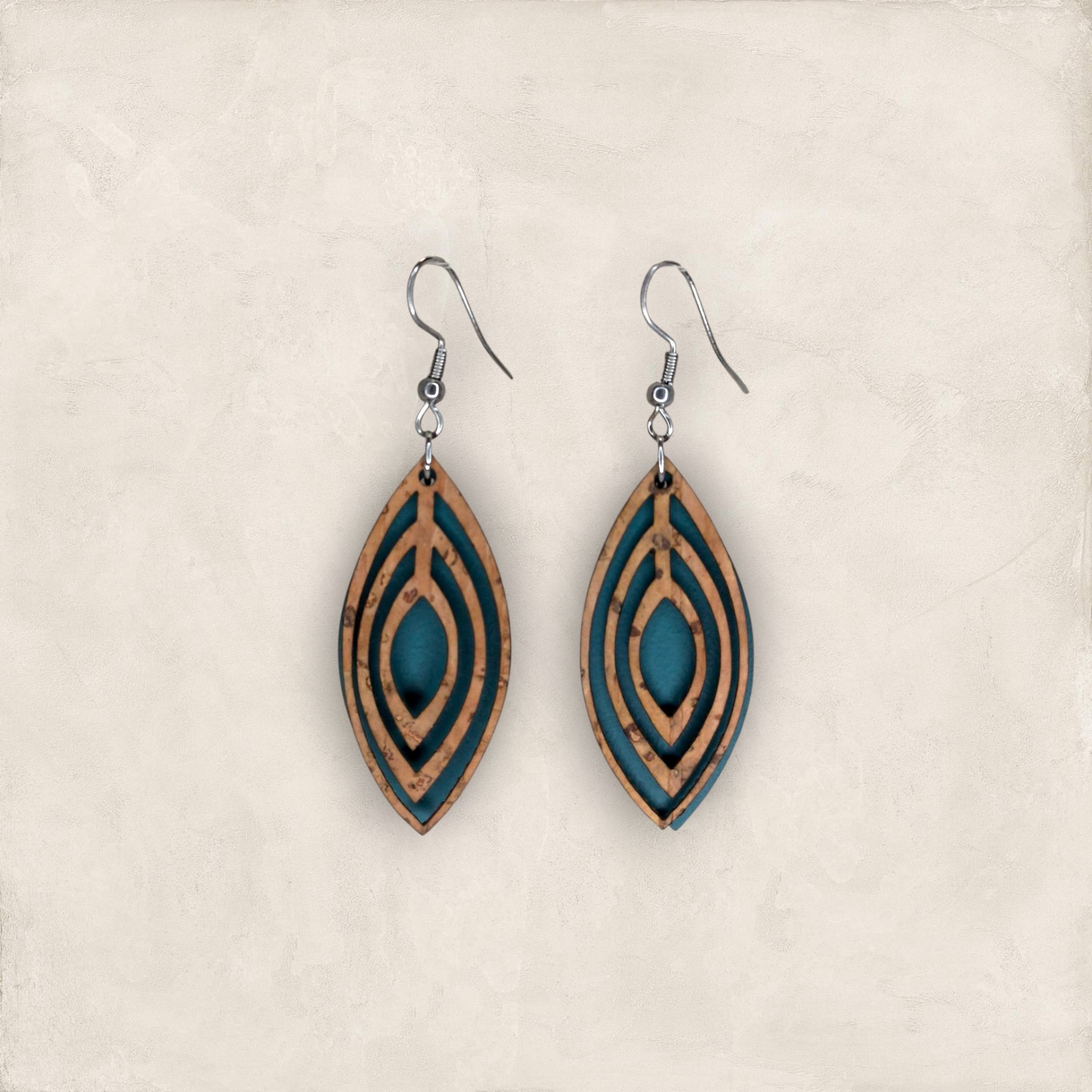 Brinco artesanal em forma de gota, feito em madeira reciclada com tintas à base de água e detalhes em cortiça.