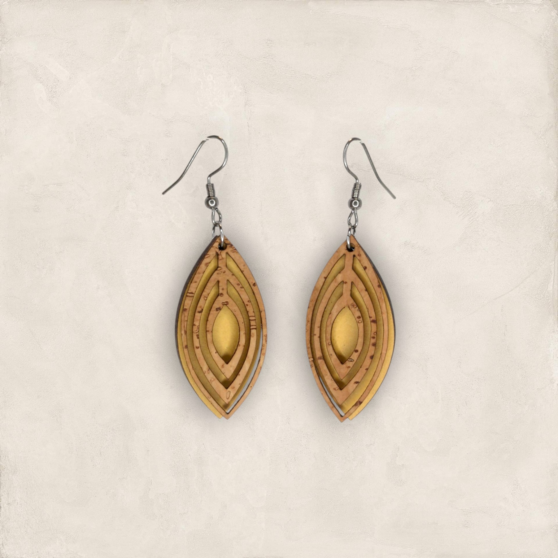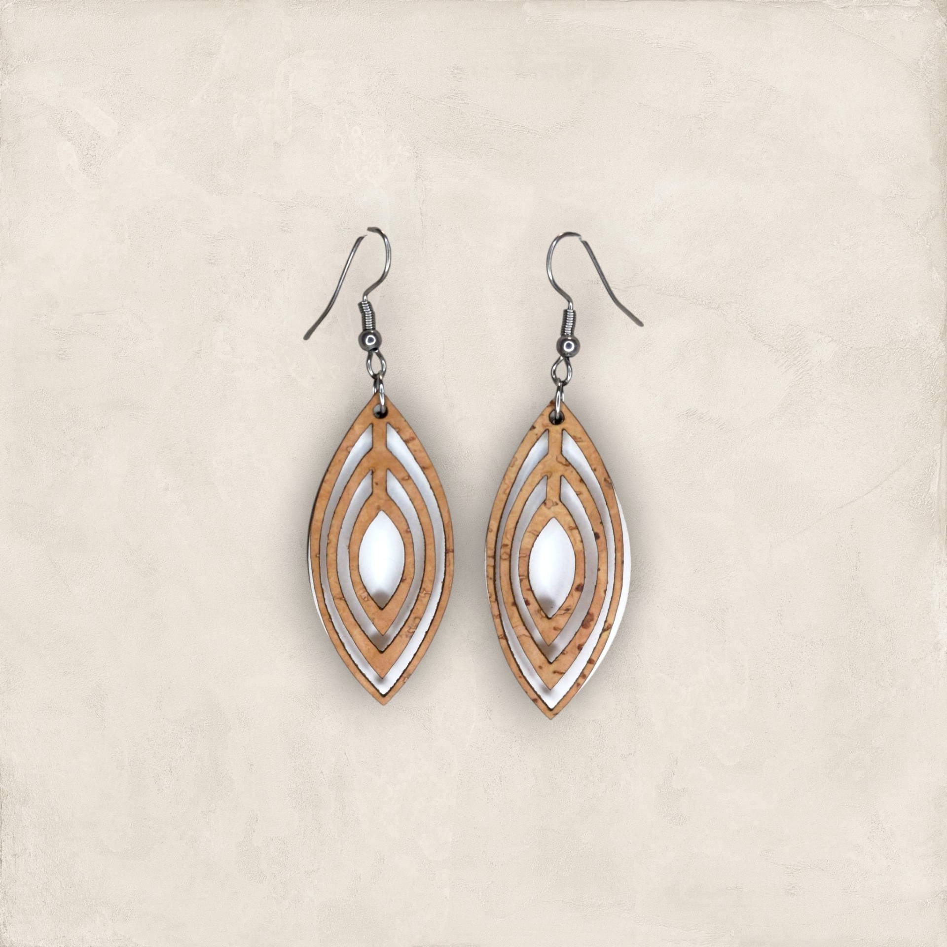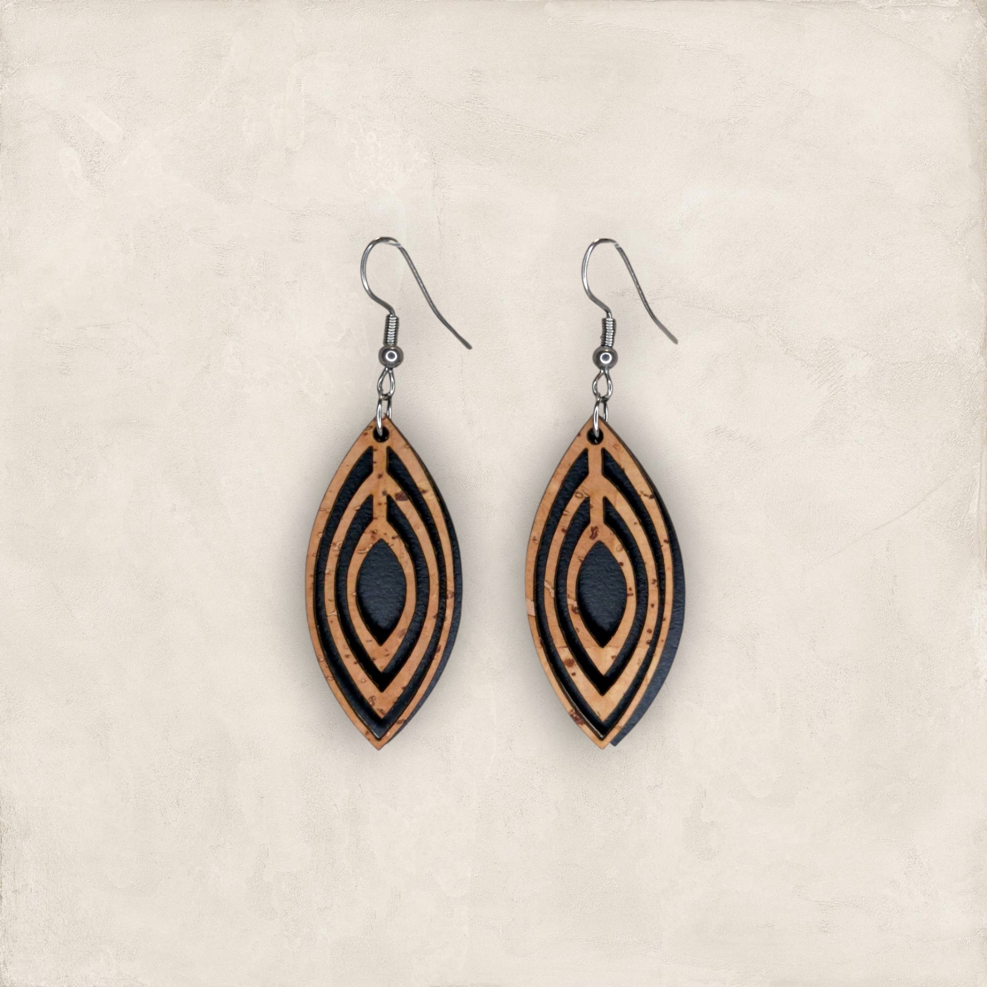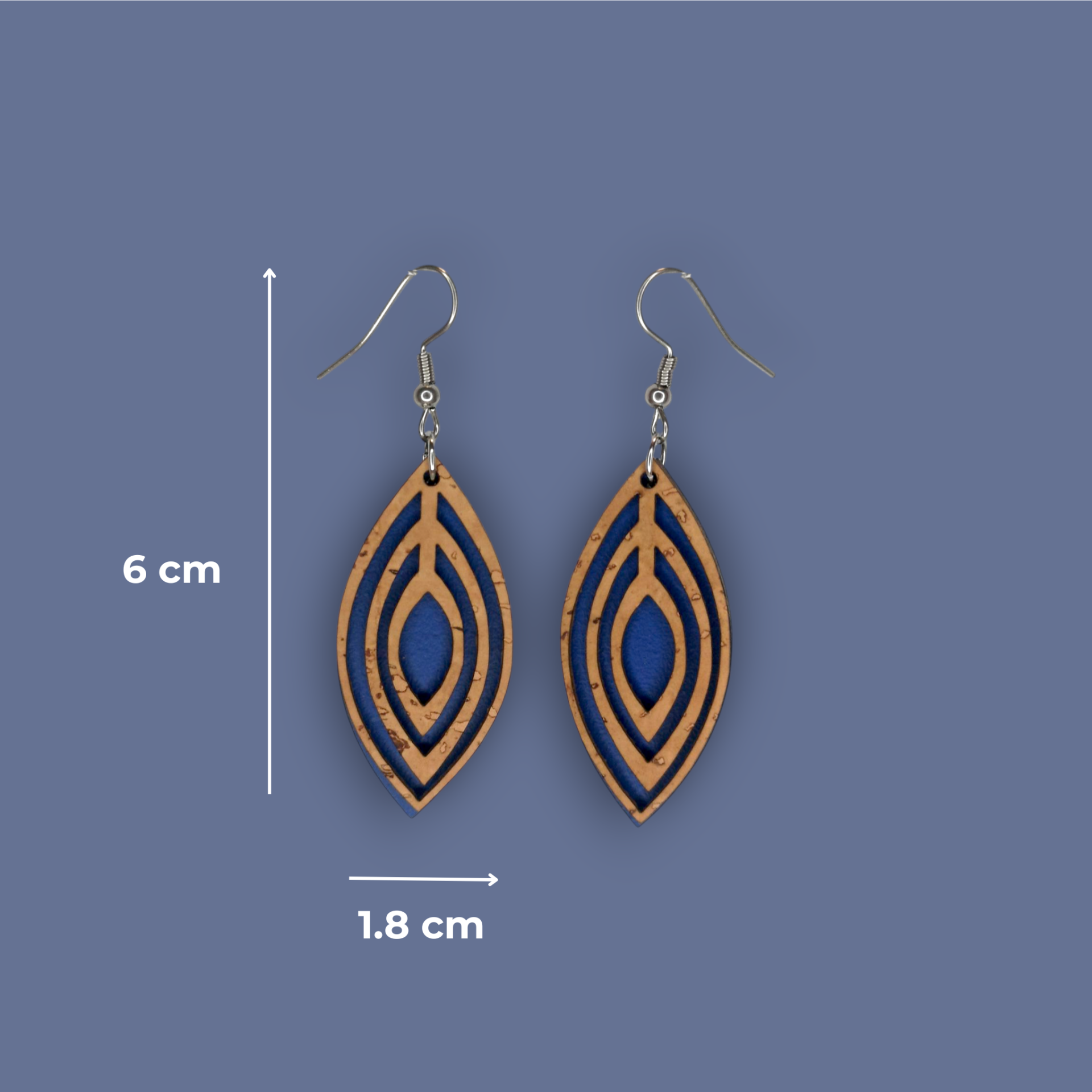 Brinco artesanal em forma de gota, feito em madeira reciclada com tintas à base de água e detalhes em cortiça.
