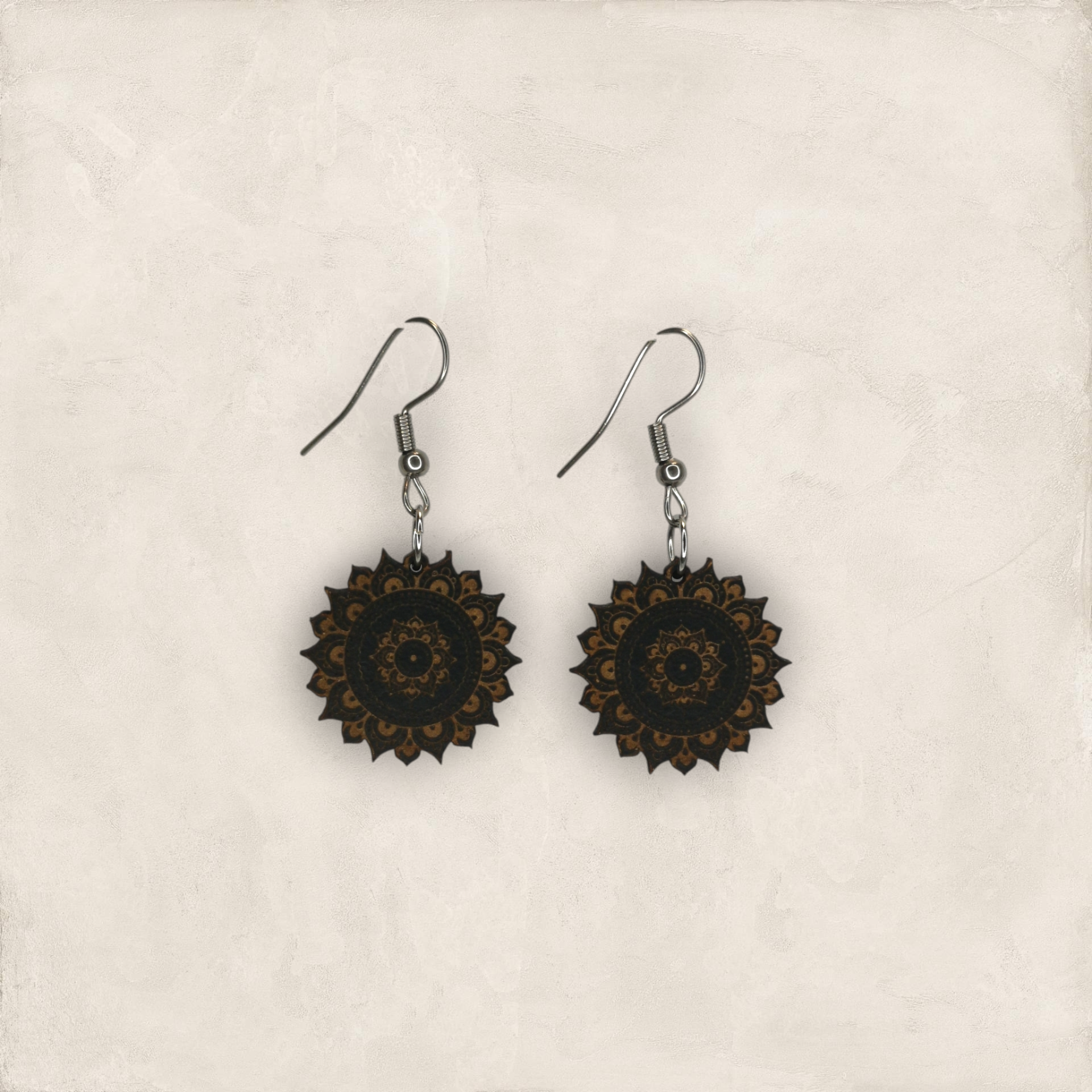 Brinco pendente em formato de mandala, com detalhes gravados em madeira reciclada pintada à mão com tintas à base de água.