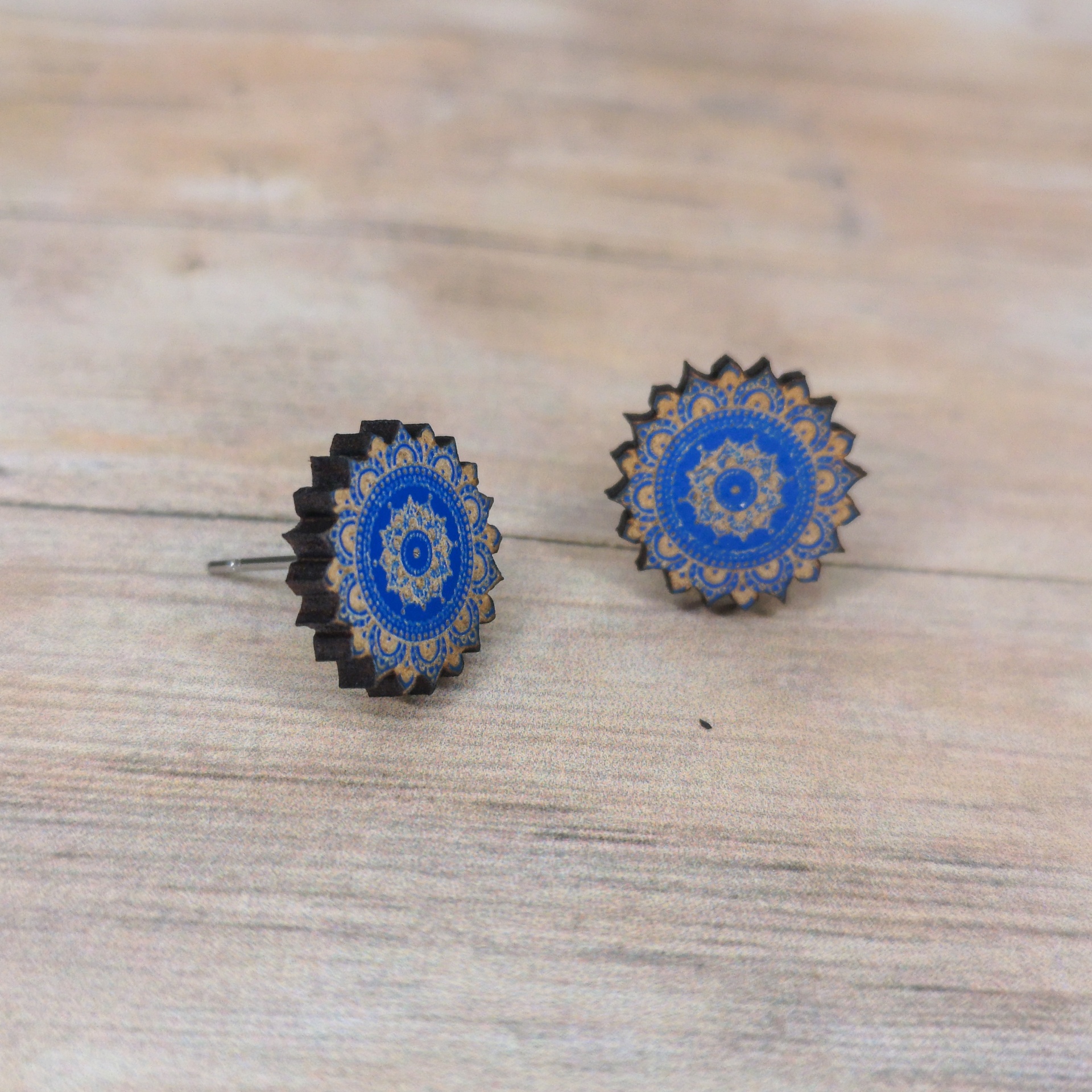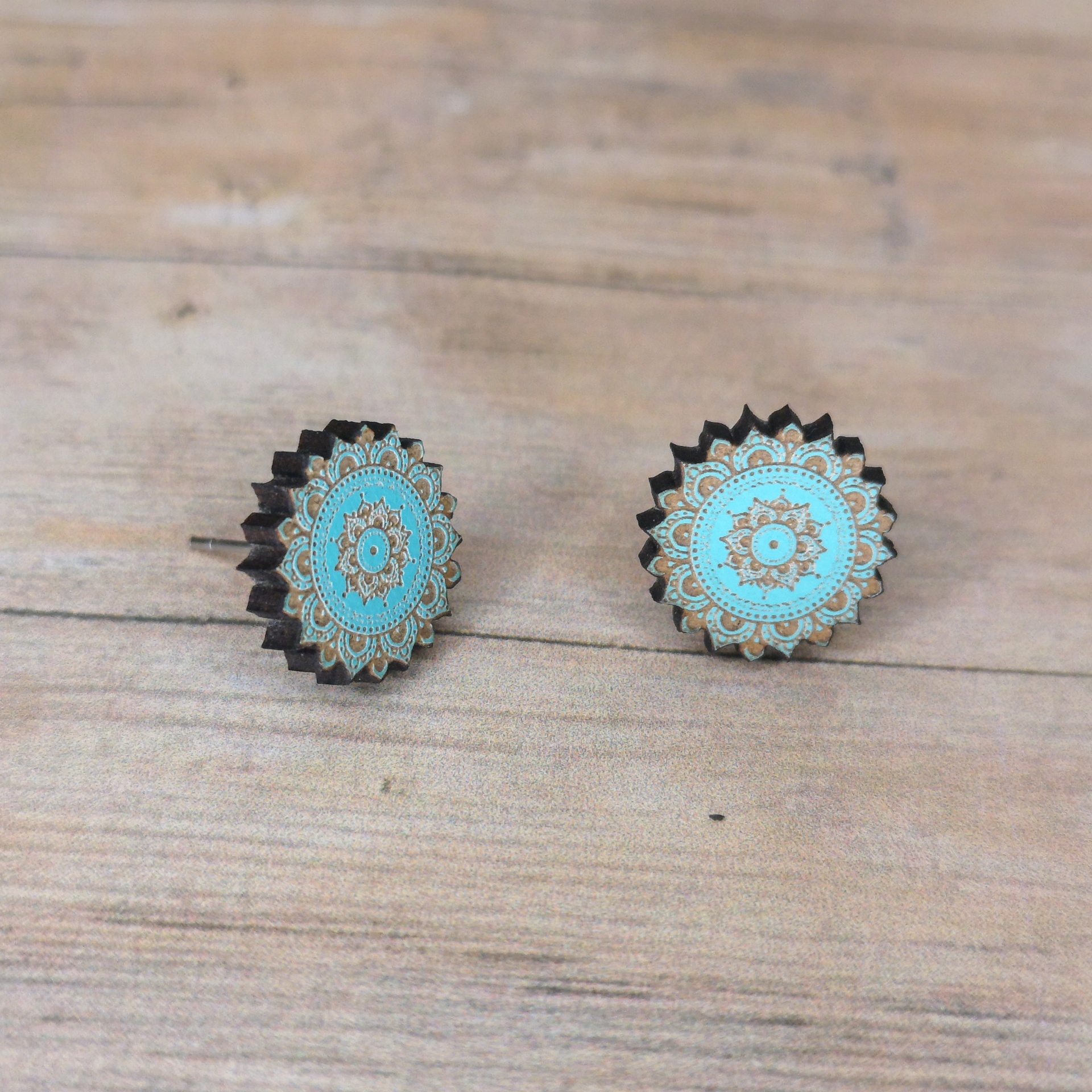 Brinco pendente em formato de mandala, com detalhes gravados em madeira reciclada pintada com tintas à base de água.