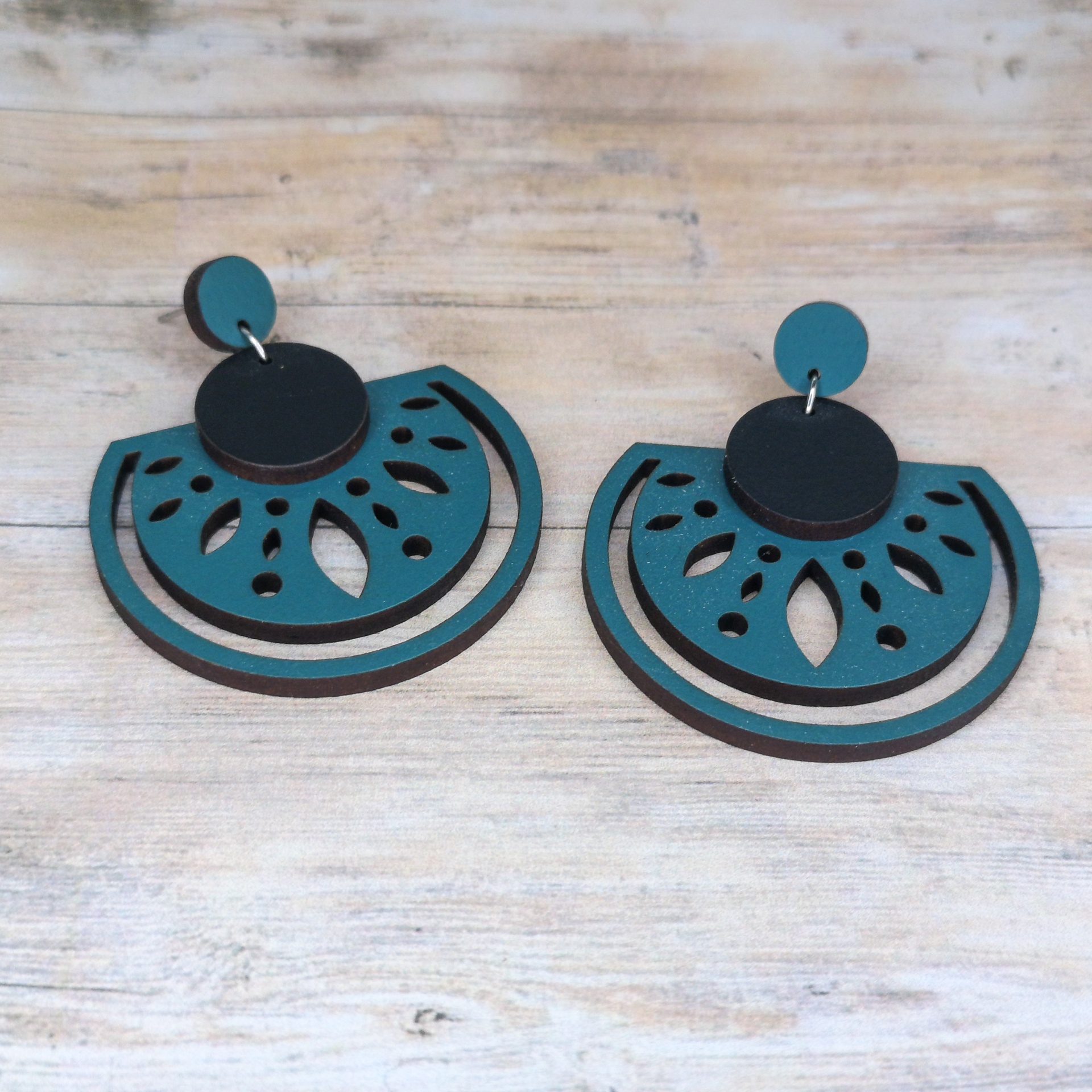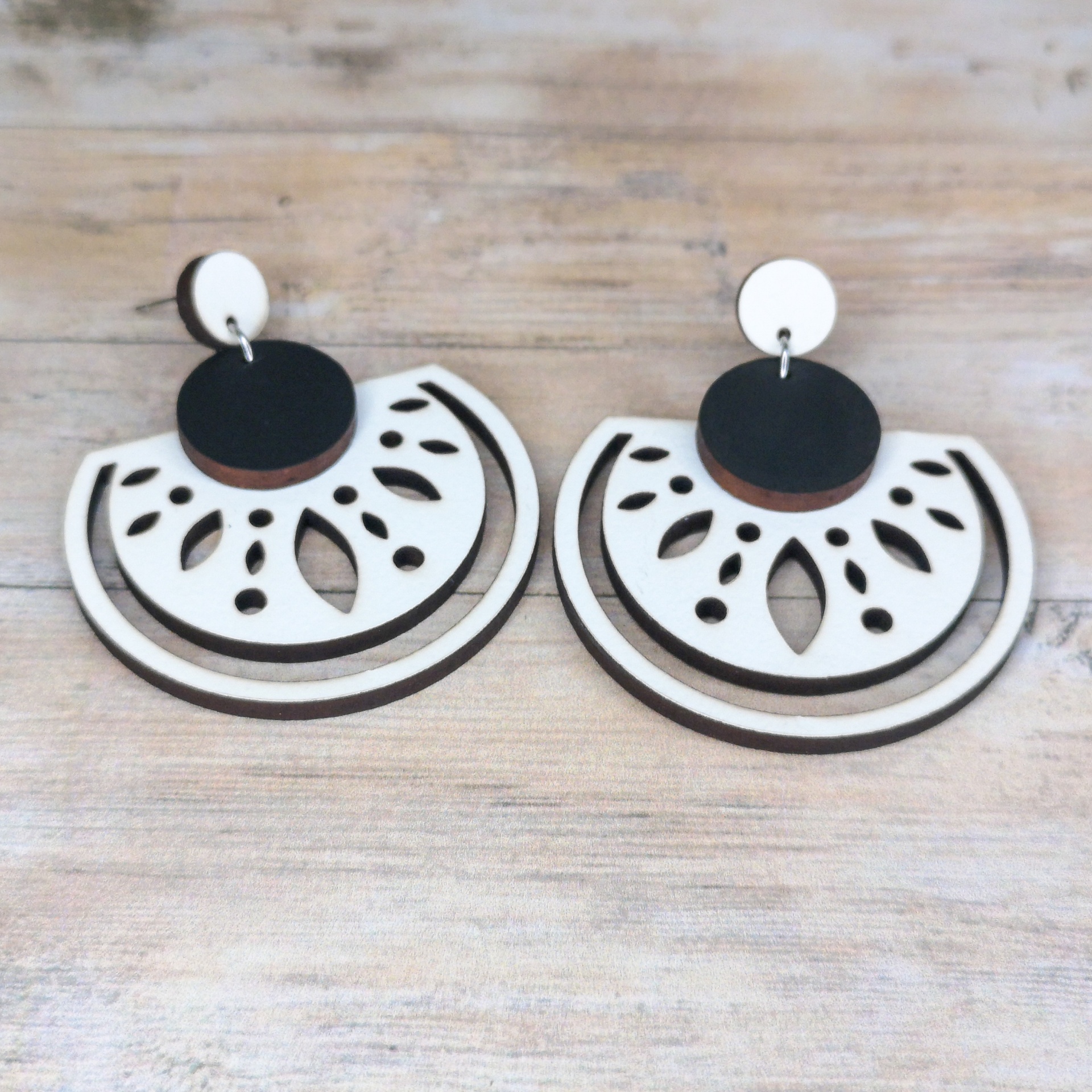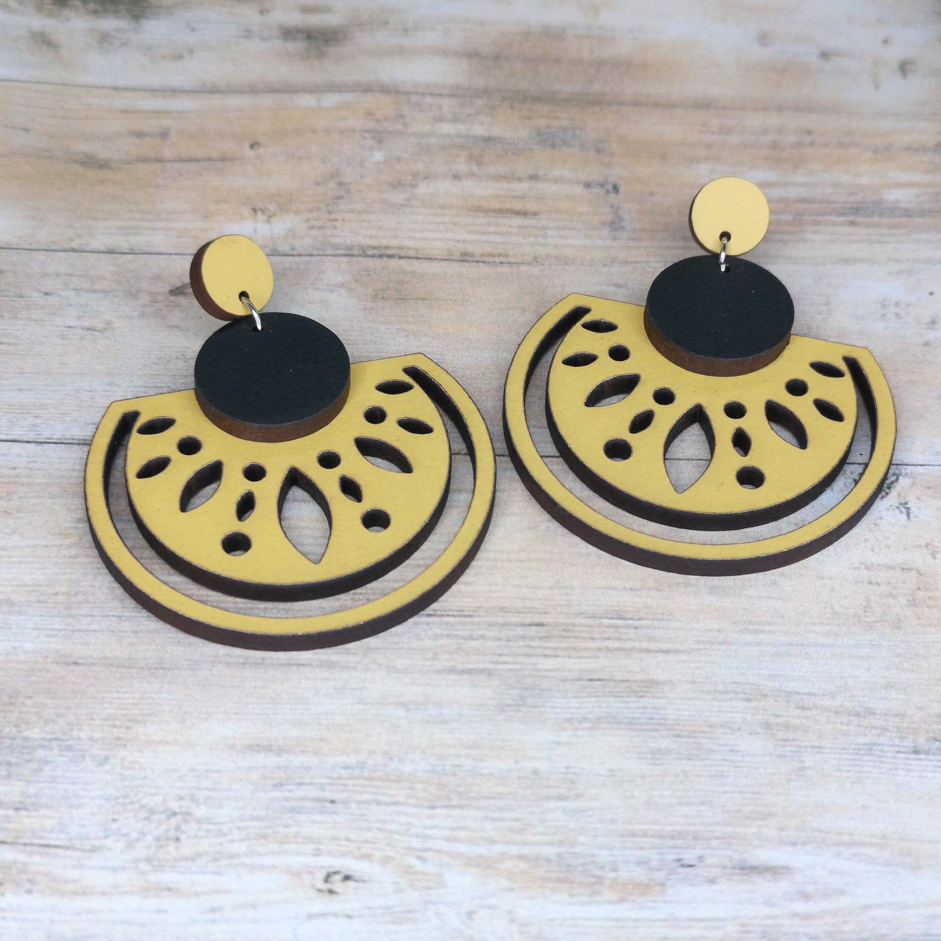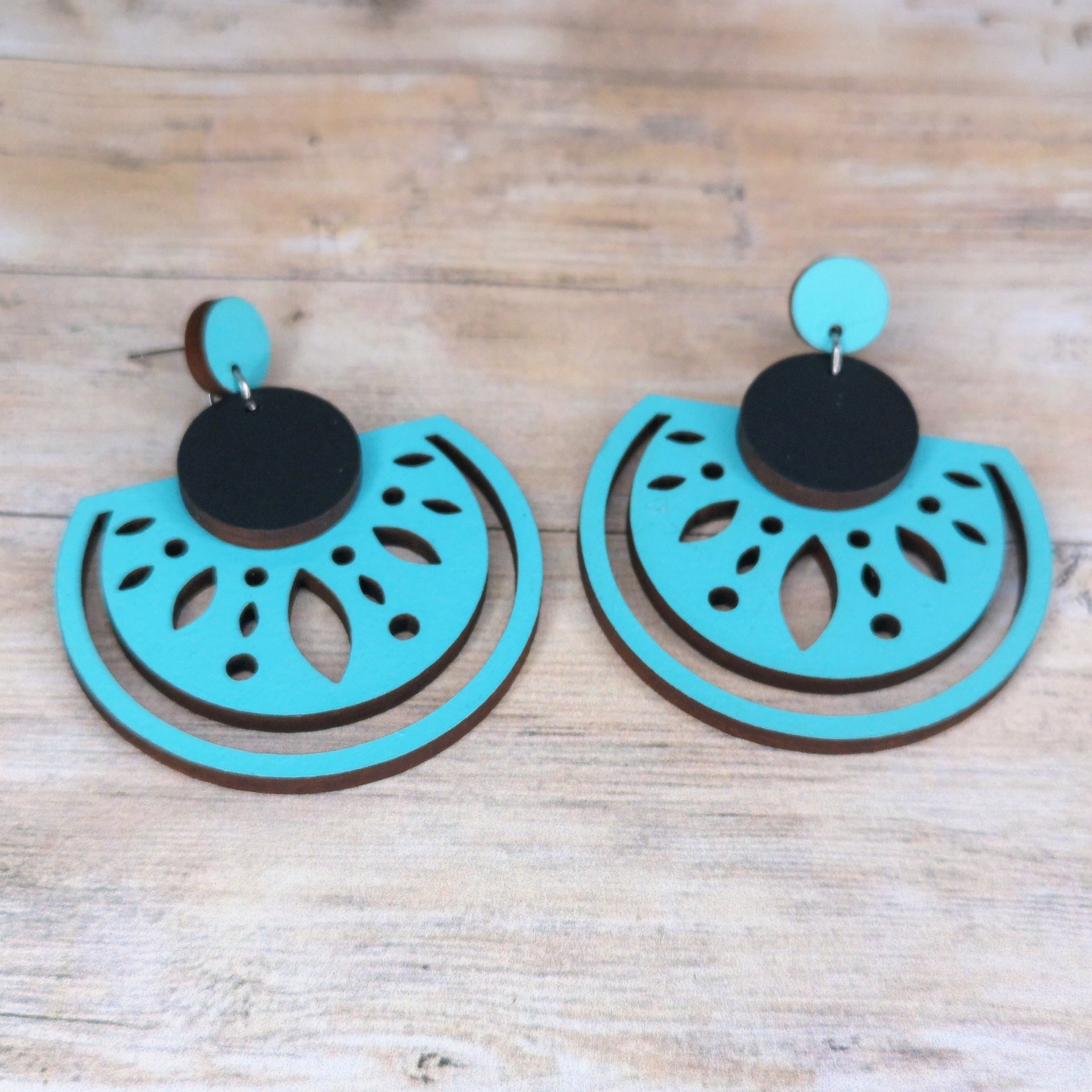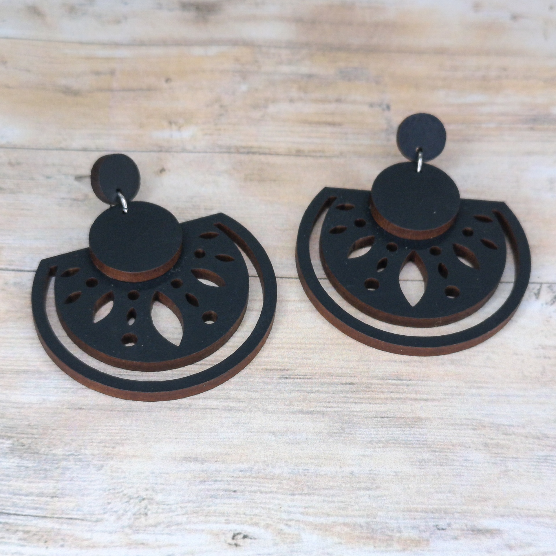 Brinco em formato de meia-lua, feito em madeira reciclada e pintado à mão com tintas à base de água — uma peça sustentável, leve e cheia de estilo.