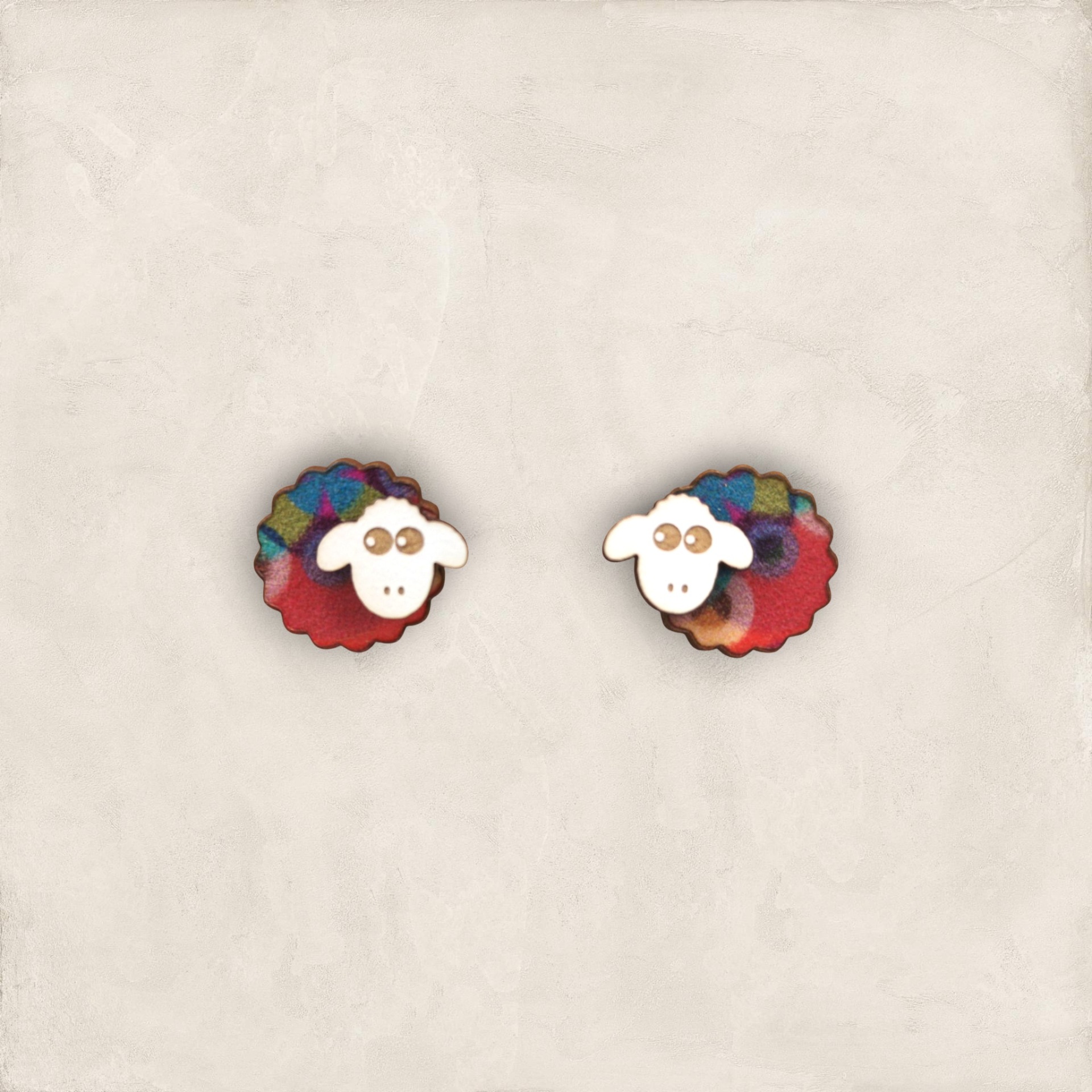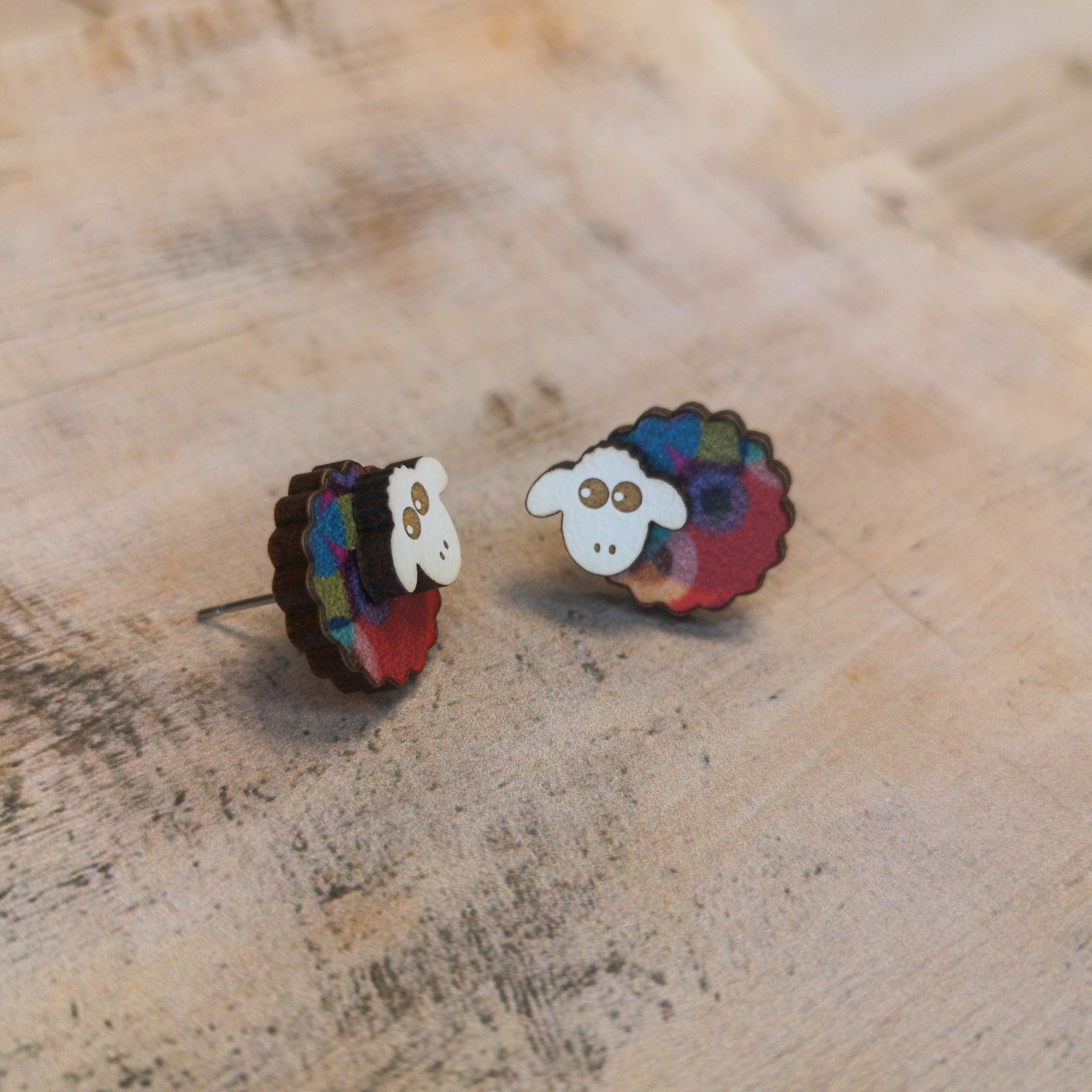 Brincos em forma de ovelha, feitos em madeira reciclada e pintados com tinta à base de água. Sustentáveis, divertidos e ideais para oferecer.