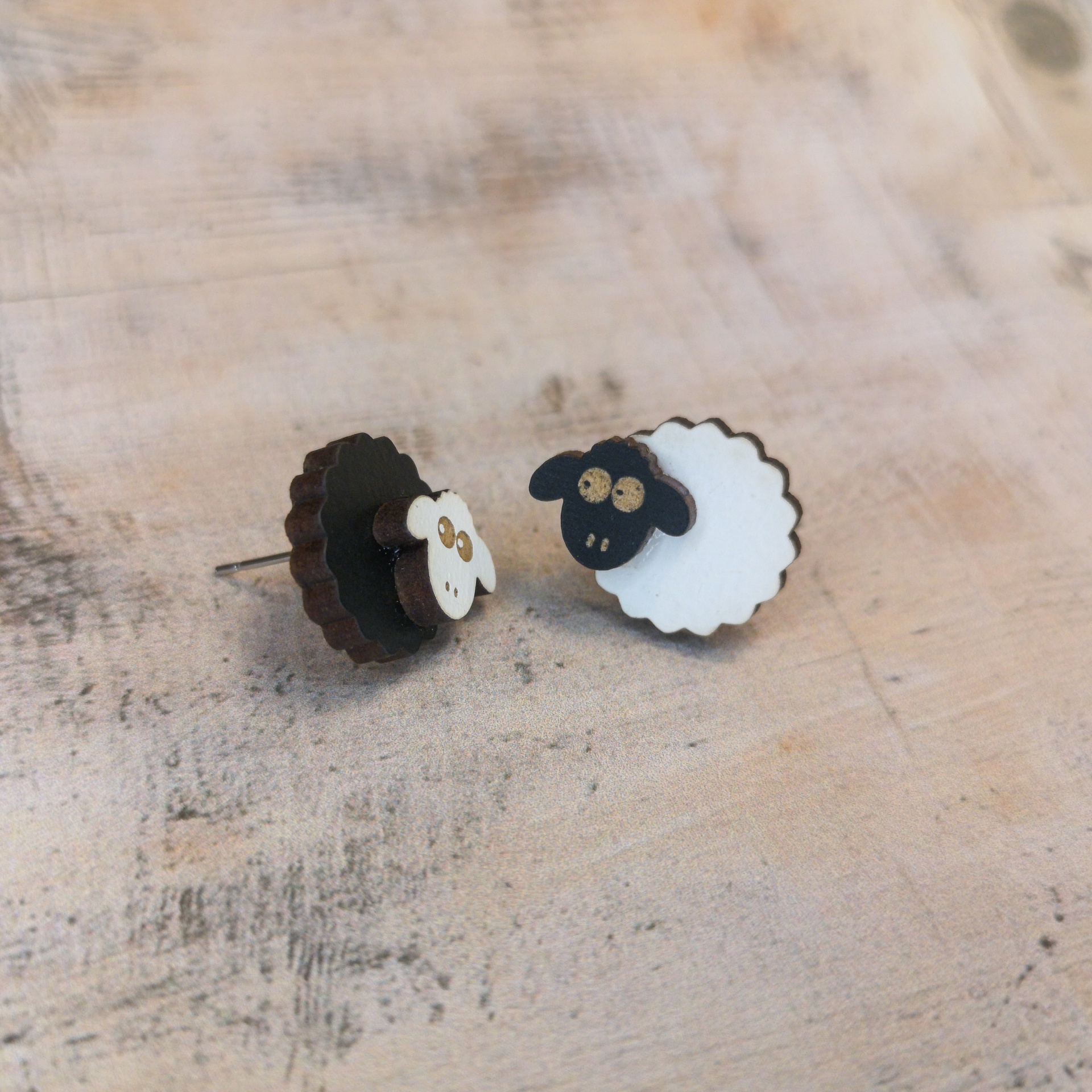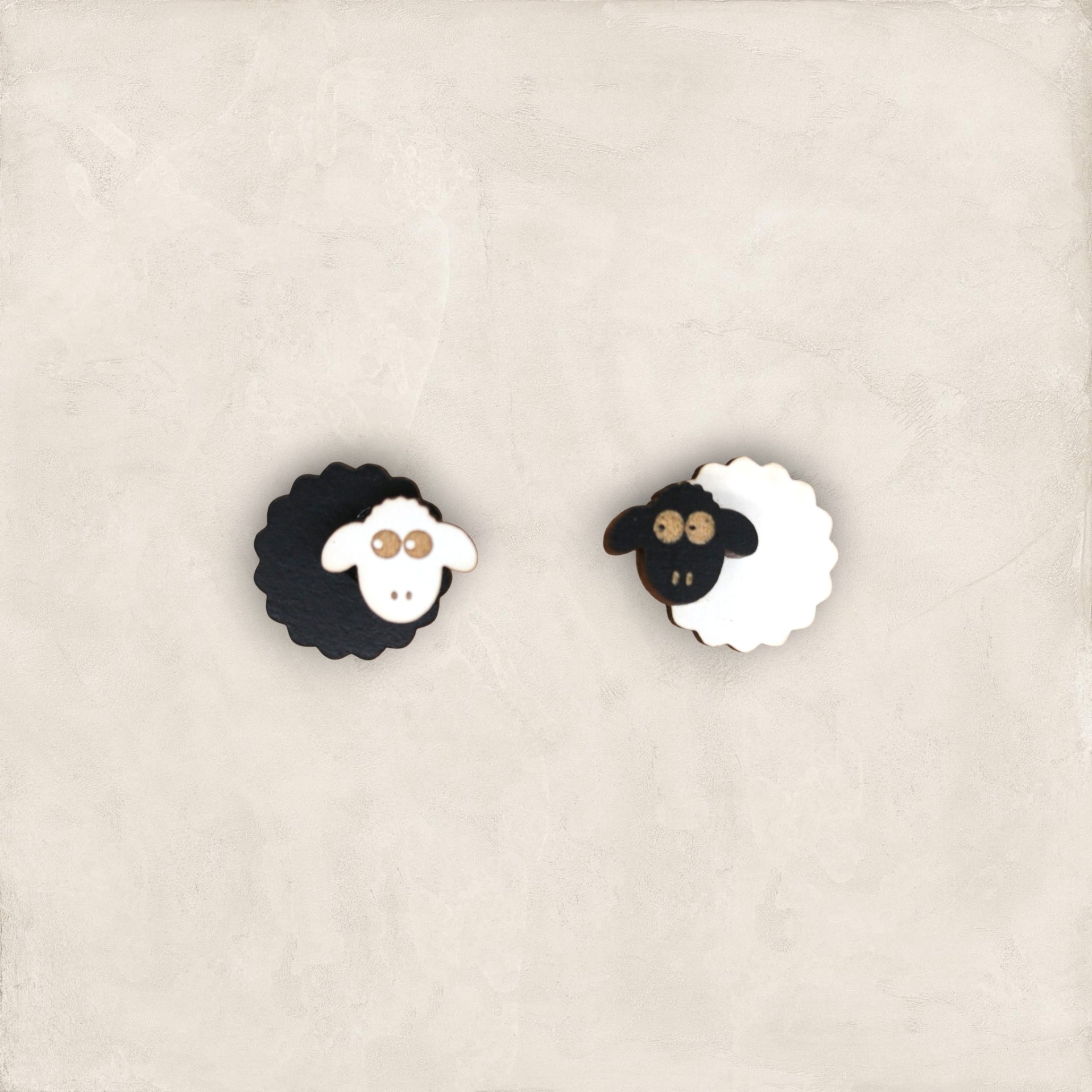 Brincos em forma de ovelha, feitos em madeira reciclada e pintados com tinta à base de água. Sustentáveis, divertidos e ideais para oferecer.