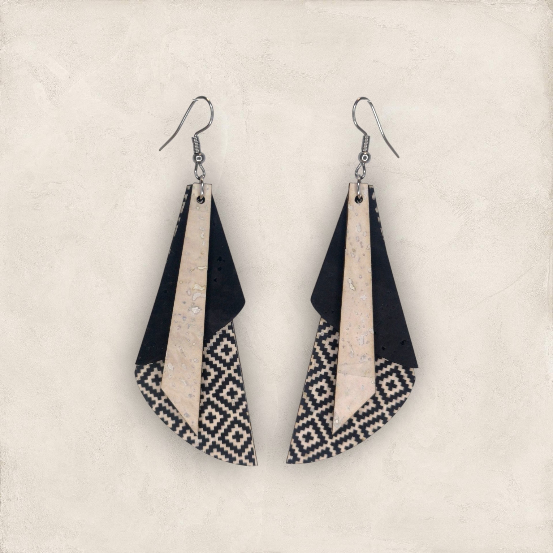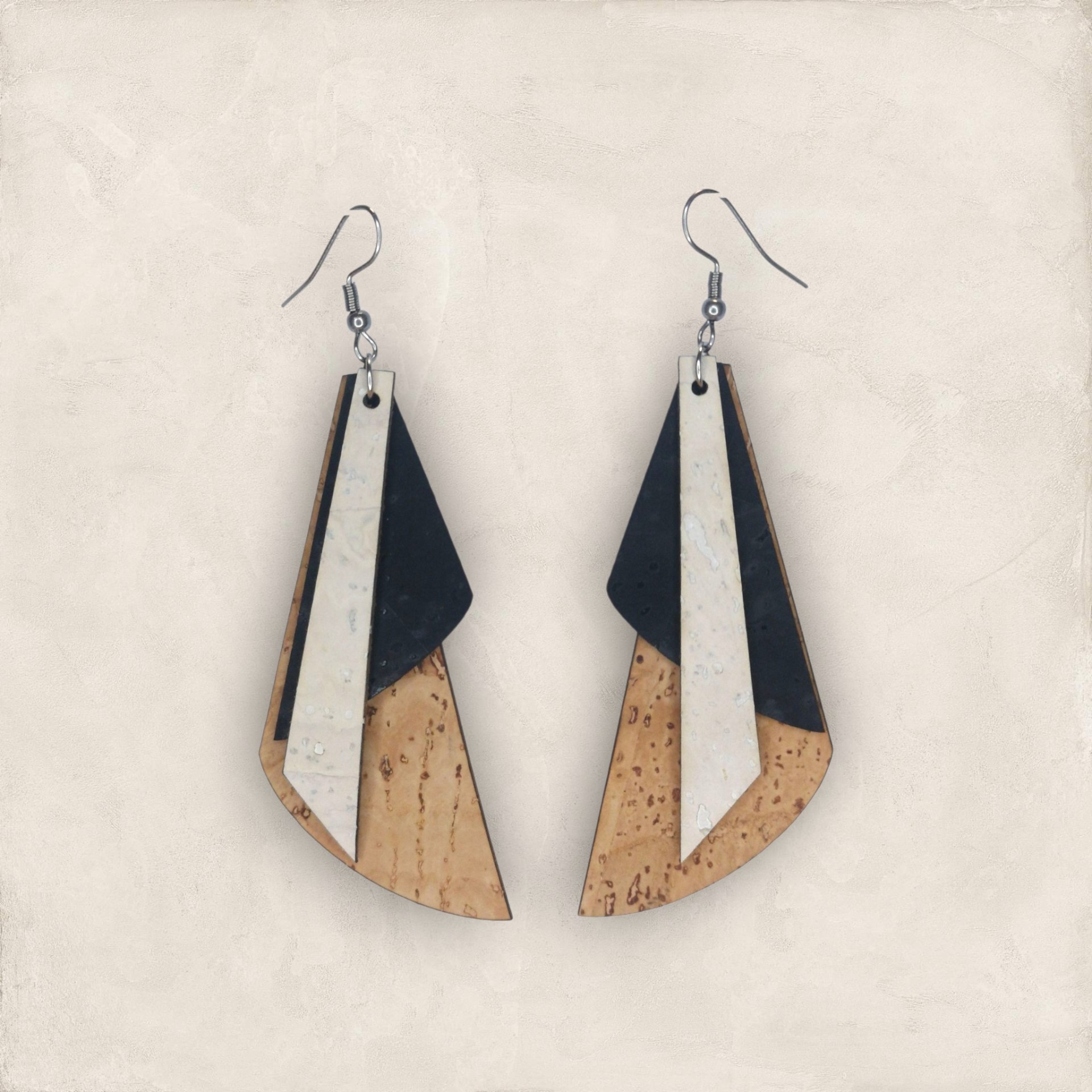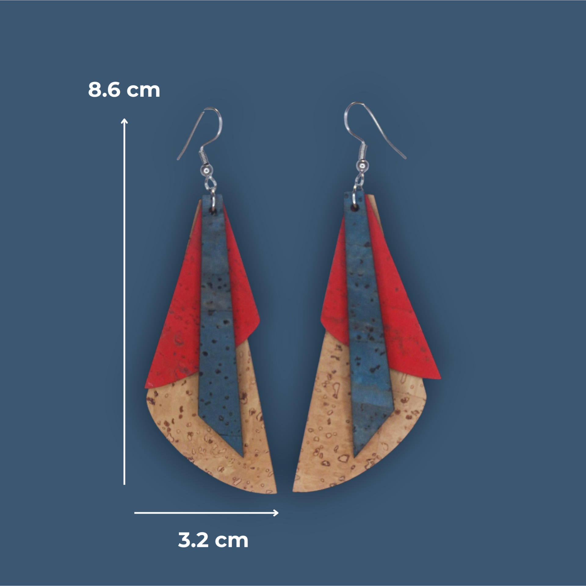 Brincos Picasso produzidos em cortiça portuguesa e pintados com tintas à base de água, são longos e apresentam três camadas coloridas que criam um movimento leve e fluido.