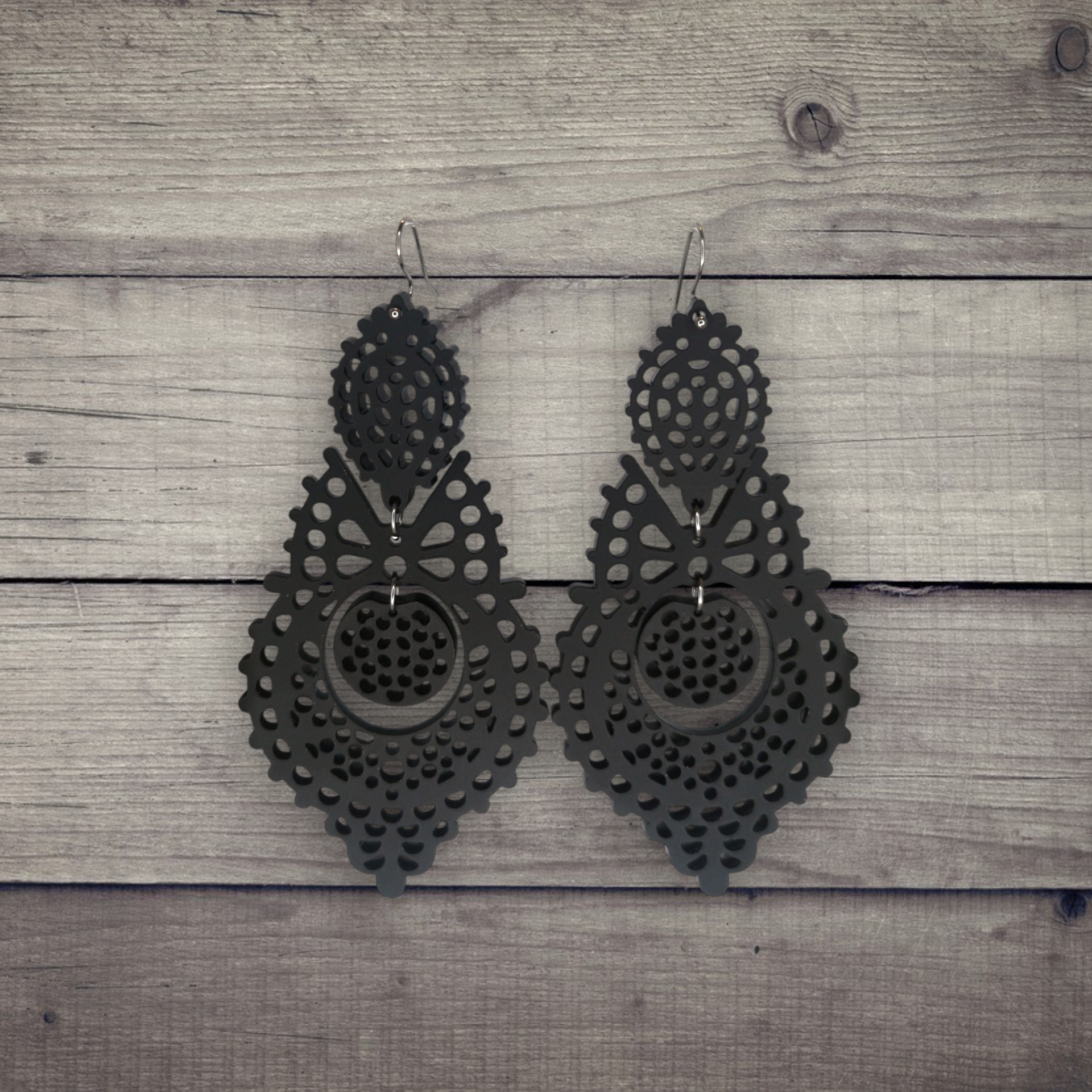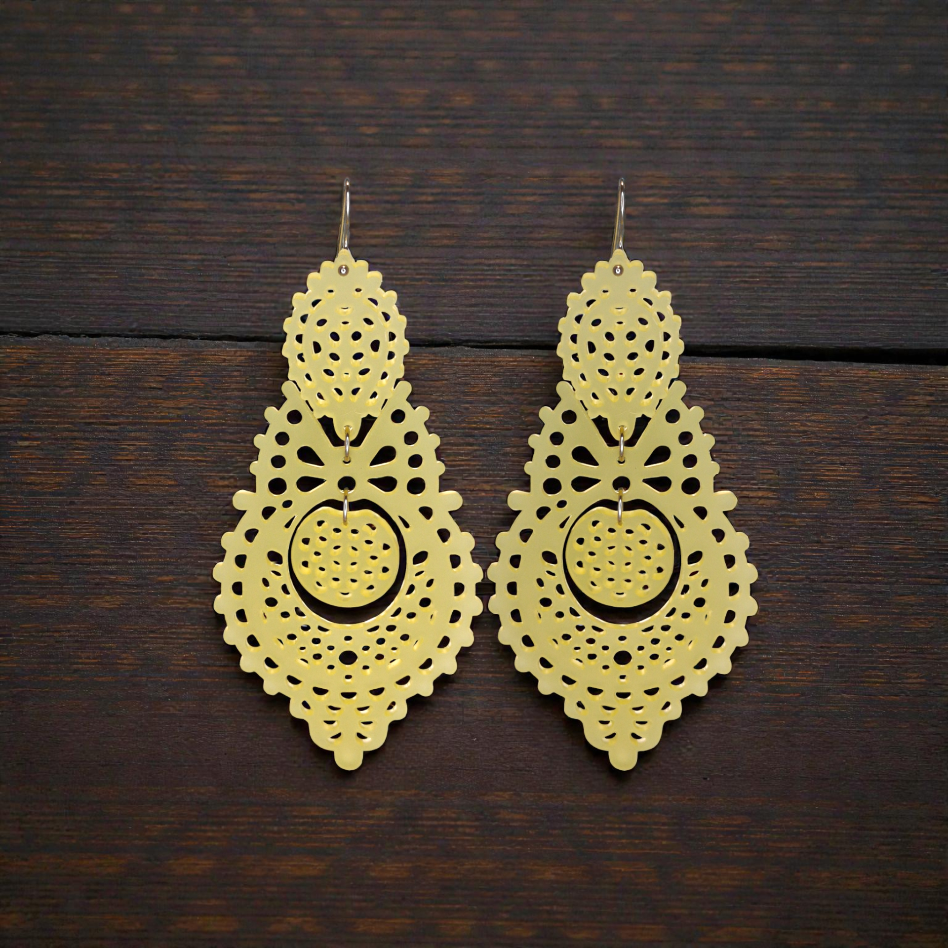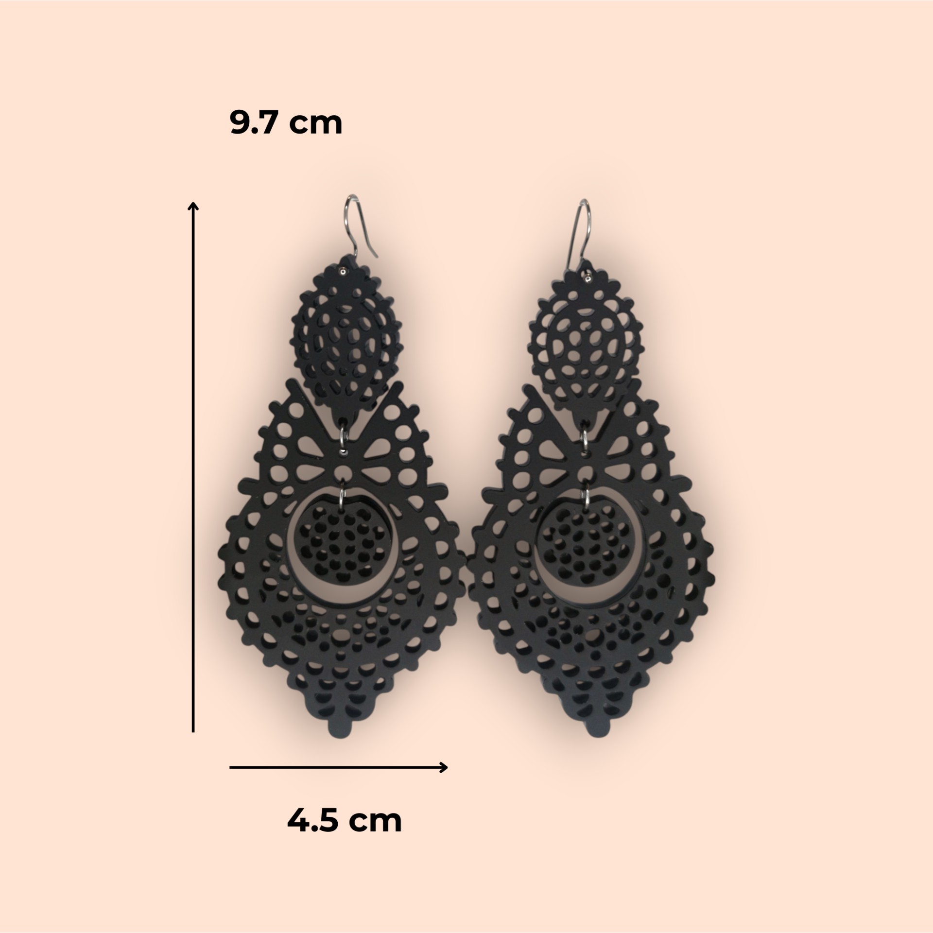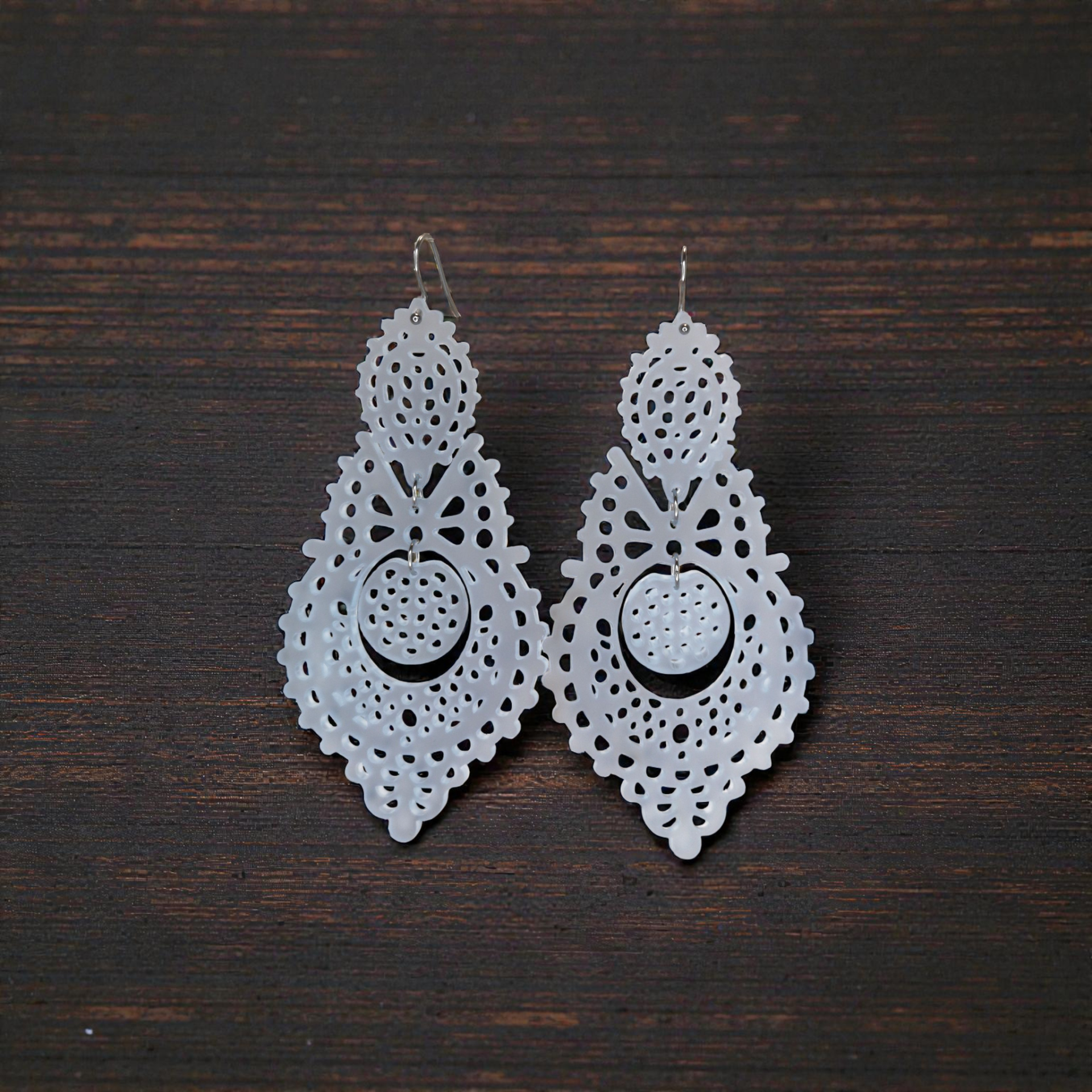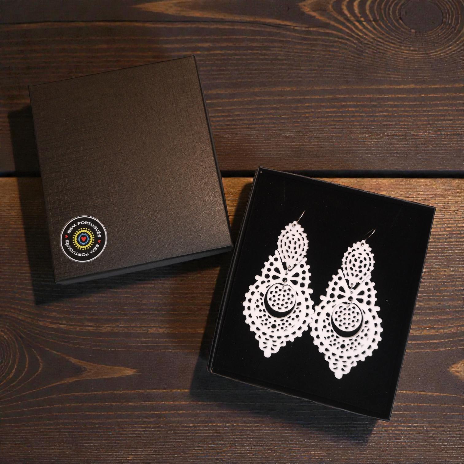 Brincos “Rainha” em acrílico e aço inoxidável, inspirados na filigrana portuguesa. Leves, elegantes e cheios de tradição reinventada.