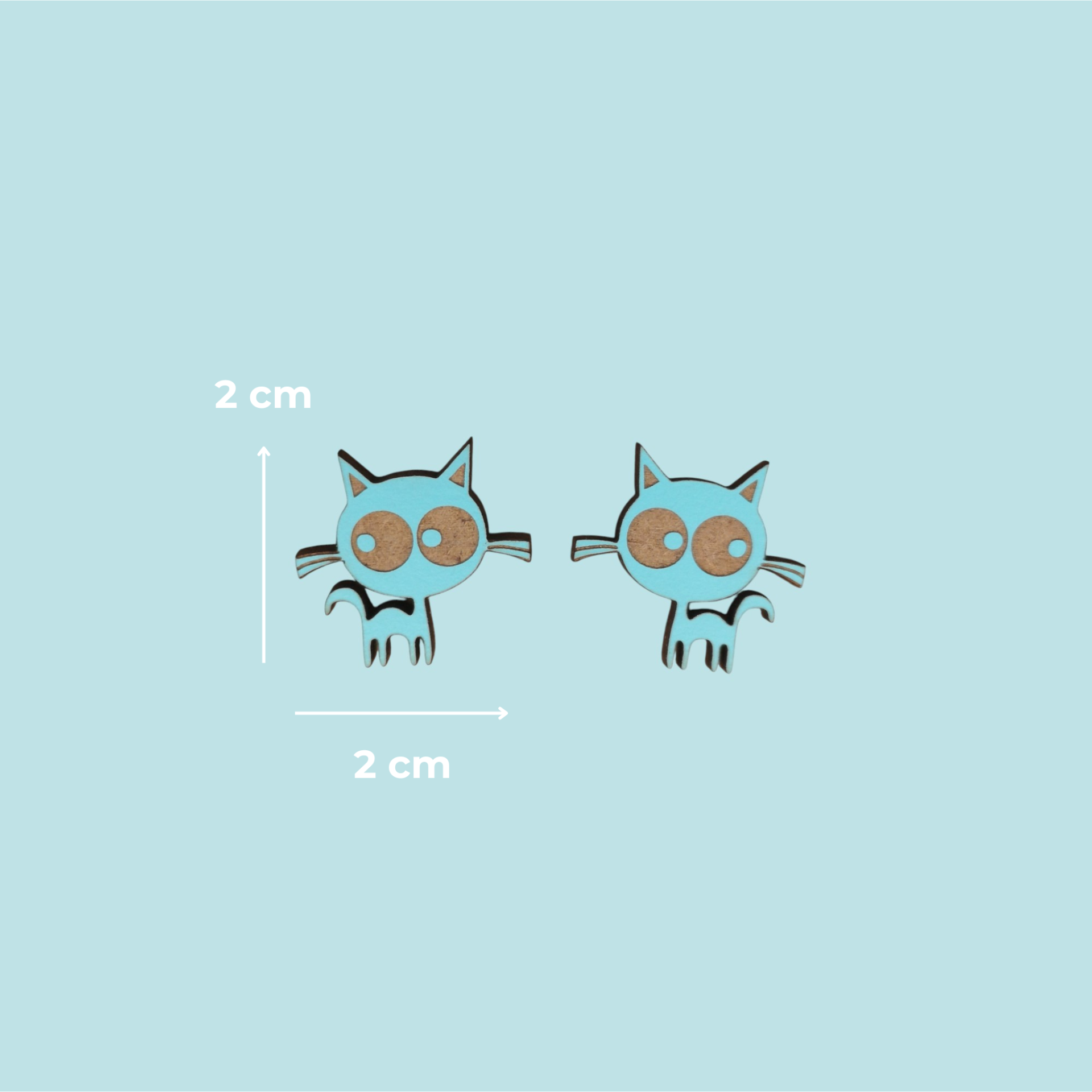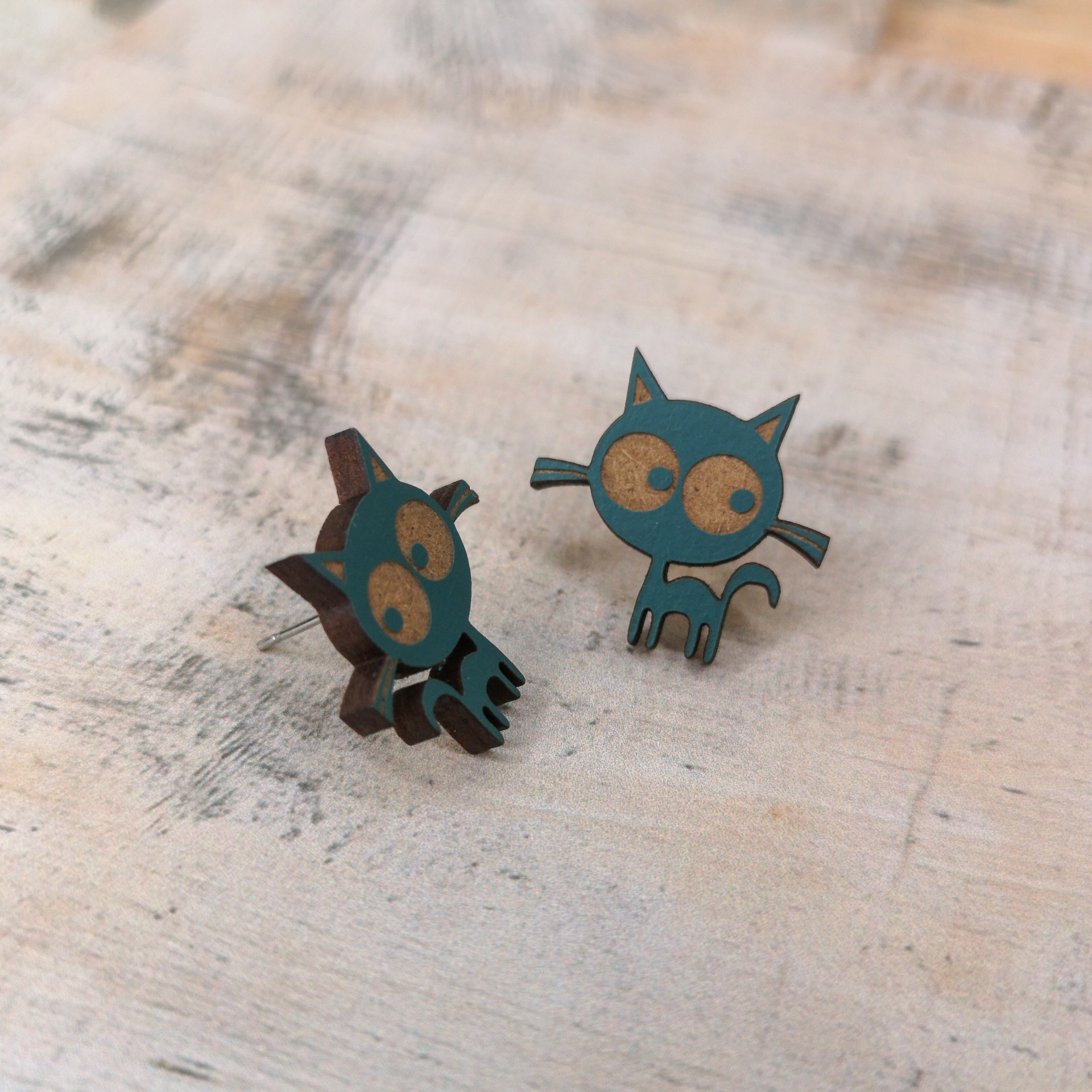 Brincos em forma de gatinho, produzidos em madeira MDF reciclada e pintados com tintas à base de água .