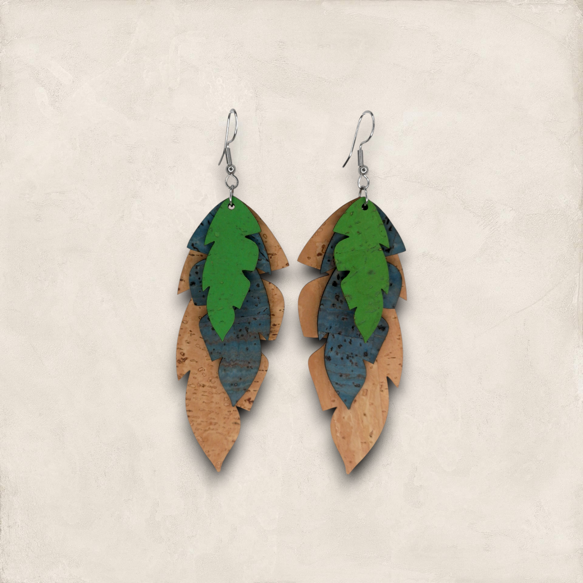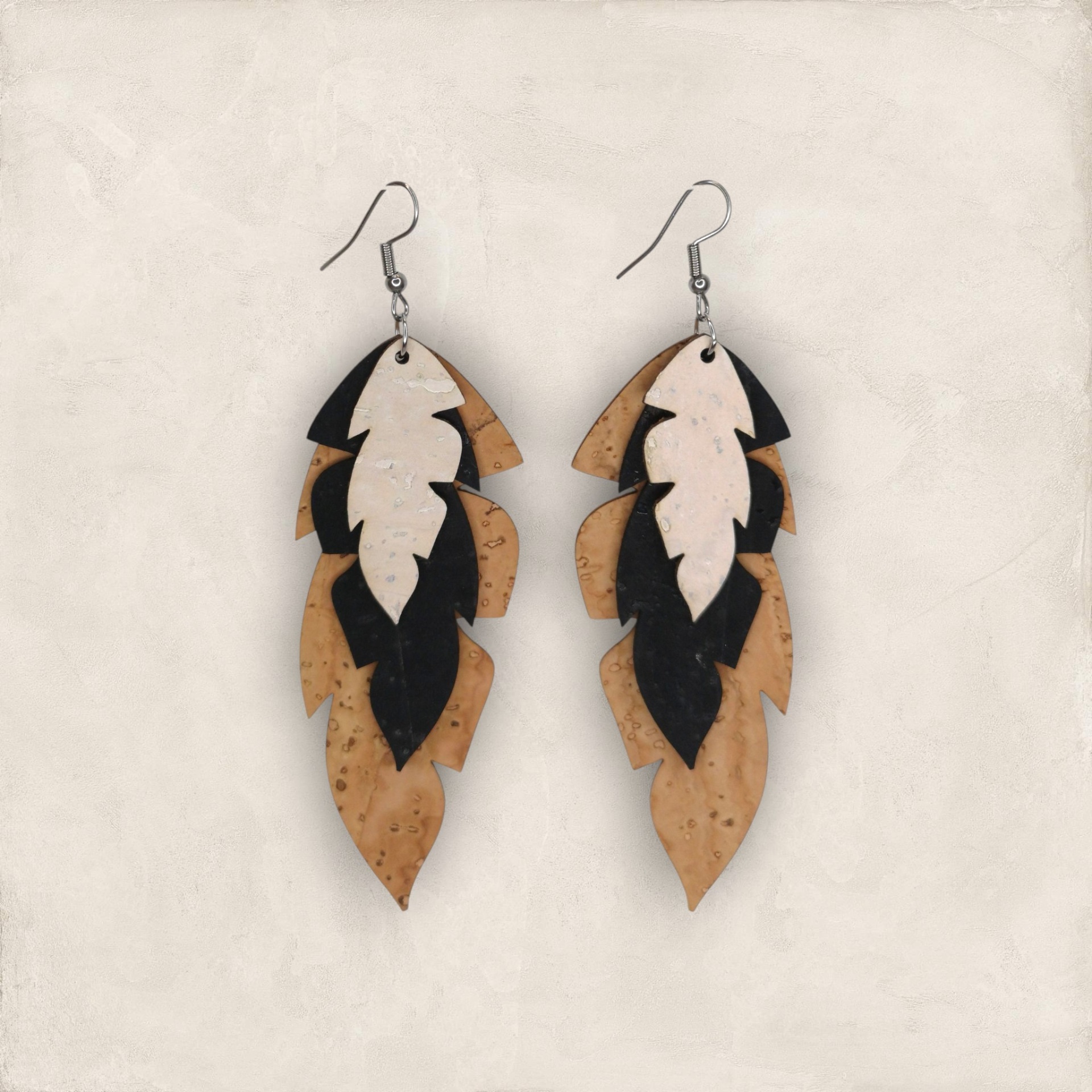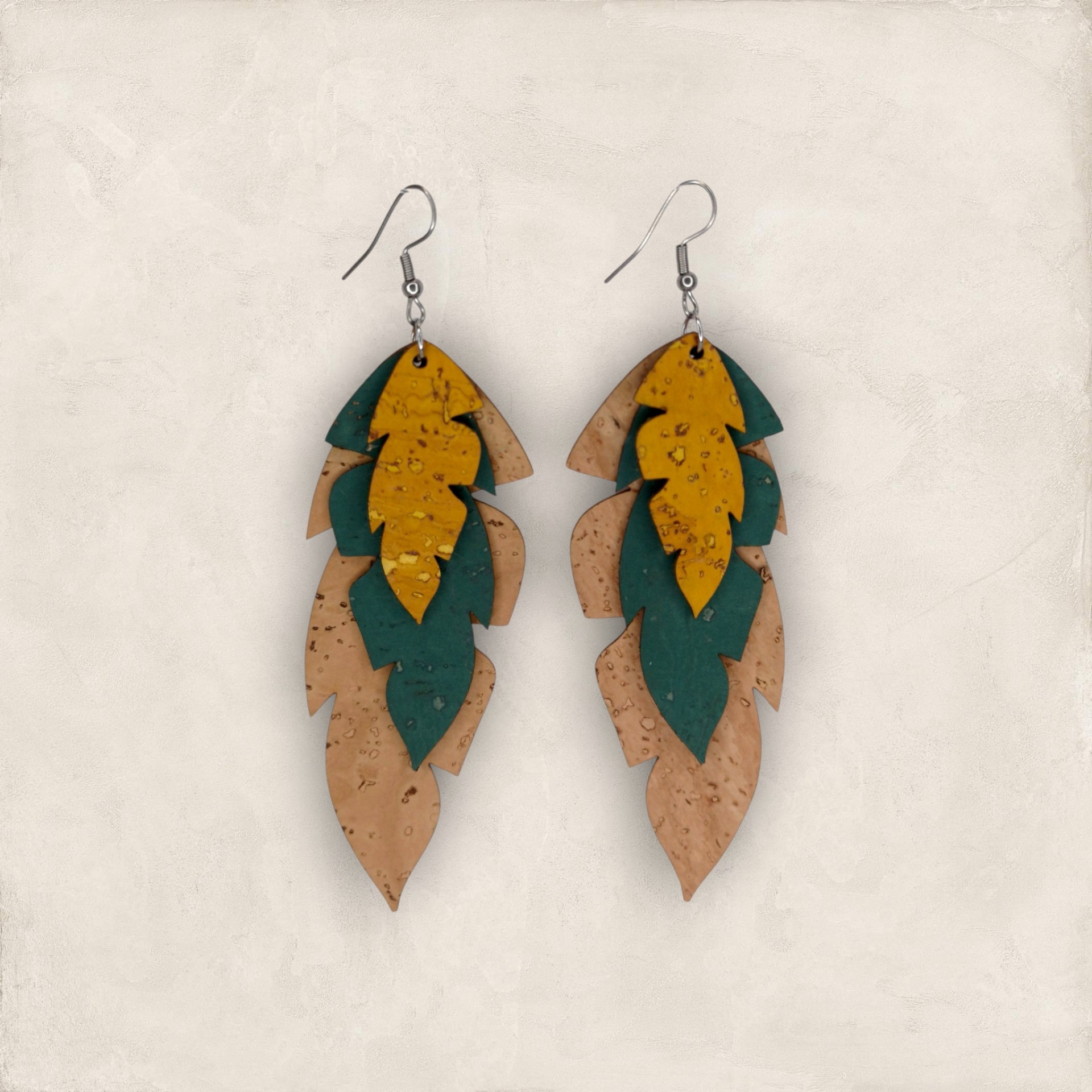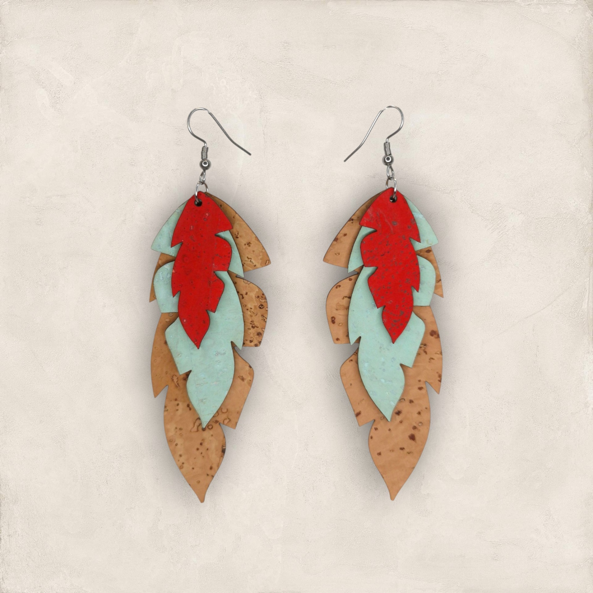 Brinco longo de cortiça portuguesa em três camadas, pintado com tintas à base de água. Inspirado em paisagens tropicais, é um brinco leve e de corte moderno.
