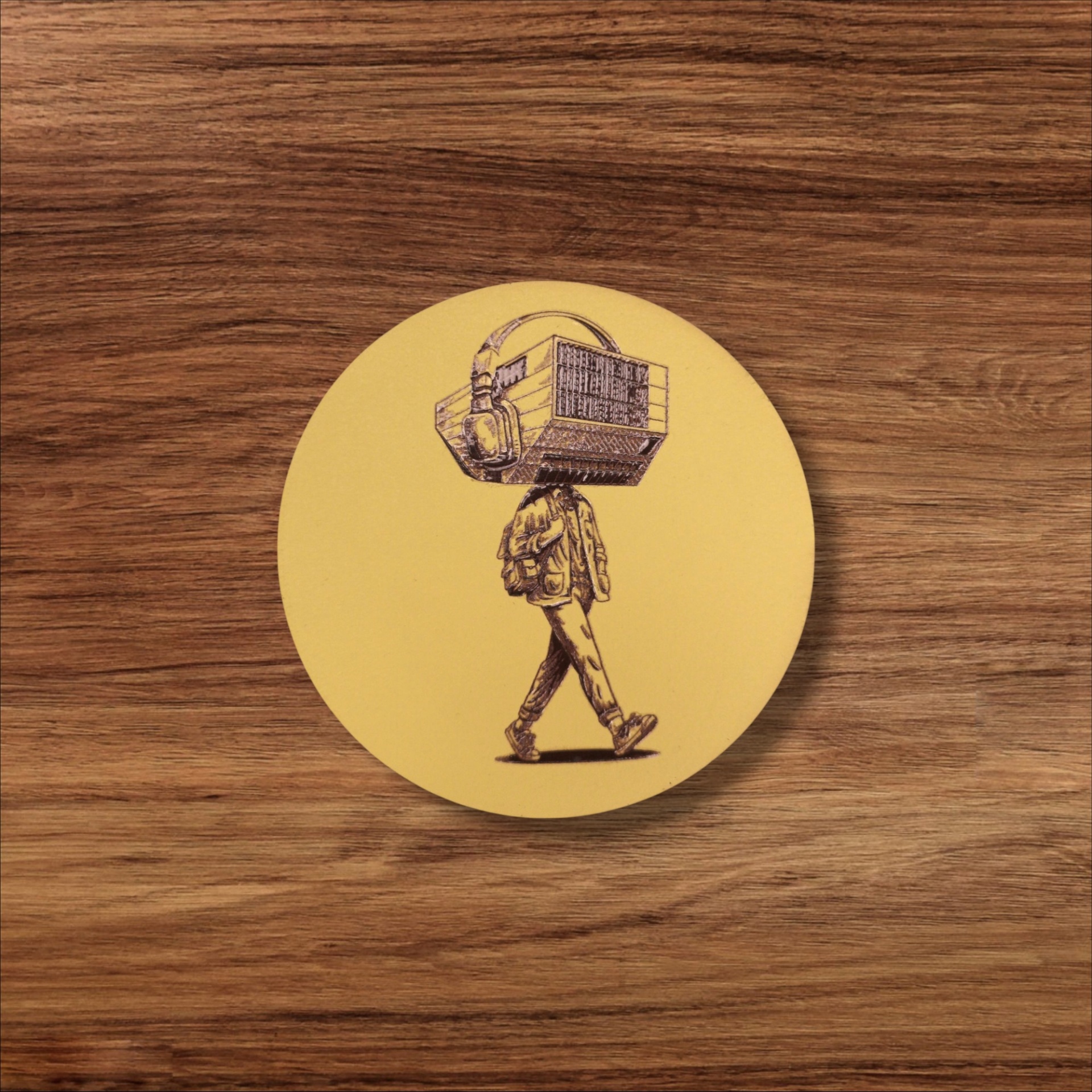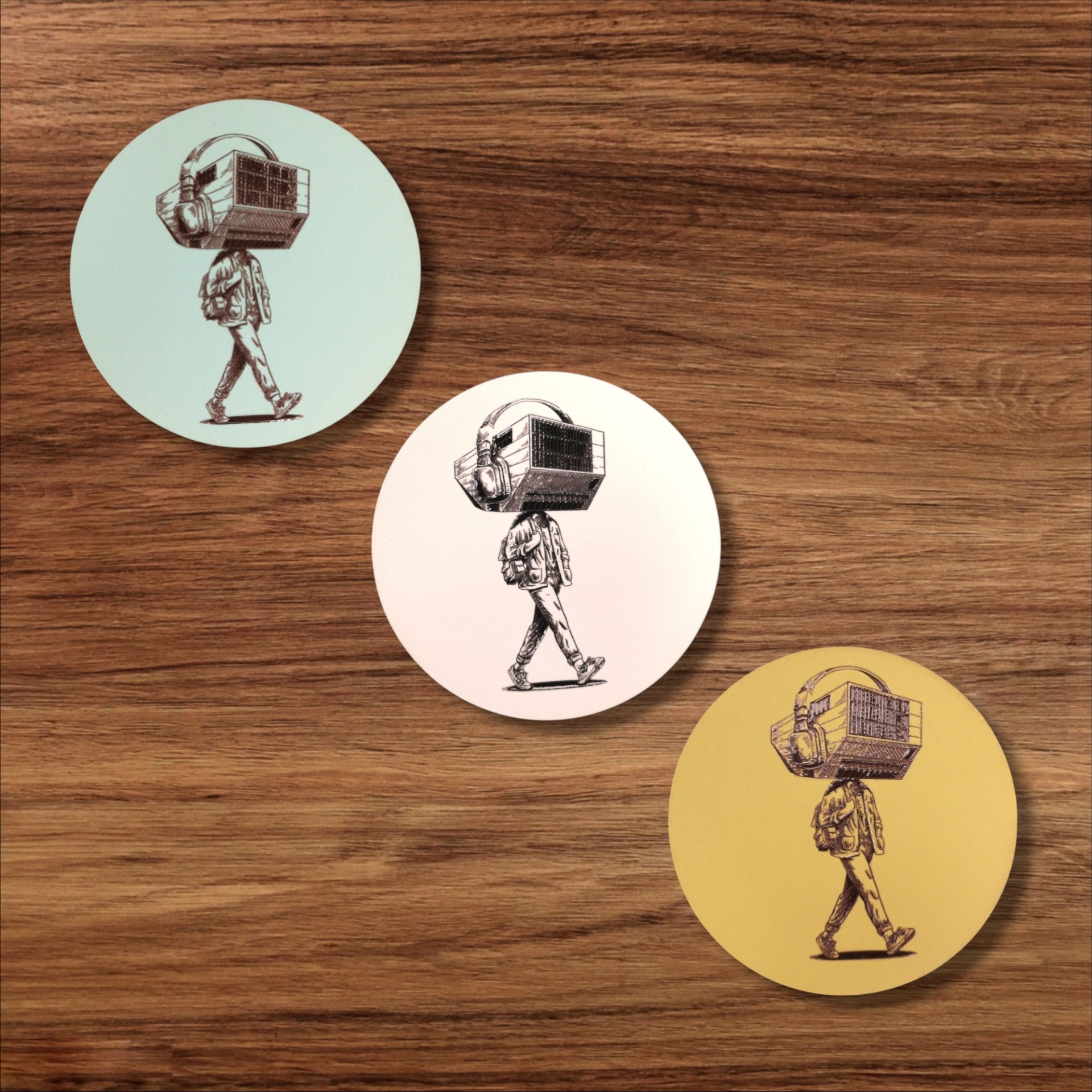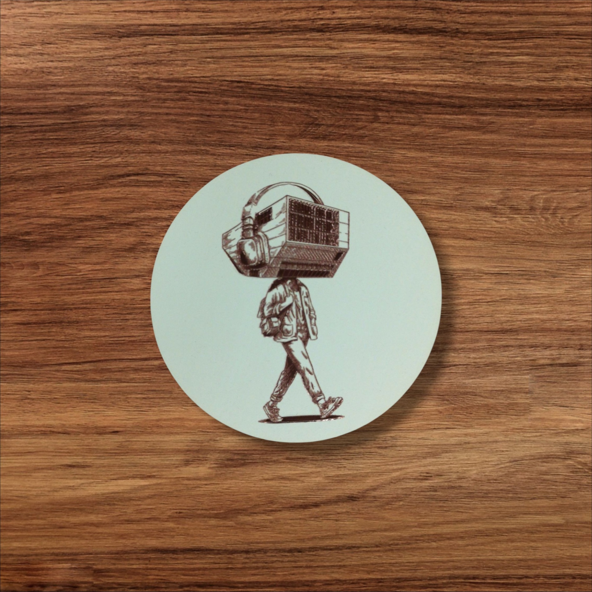 Base de copos em madeira reciclada, pintada com tintas à base de água, com um design contemporâneo que transforma a Casa da Música na silhueta de um jovem de auscultadores, entregue ao som que o envolve.