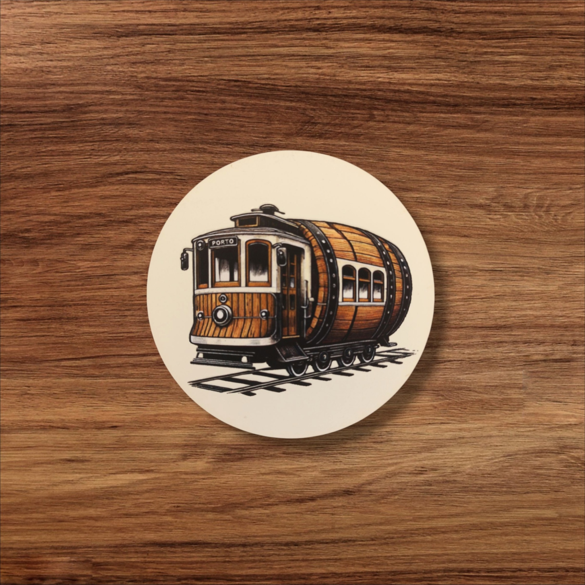 Base de copos em madeira reciclada, pintada com tintas à base de água, com o divertido tema do elétrico em formato de pipo.