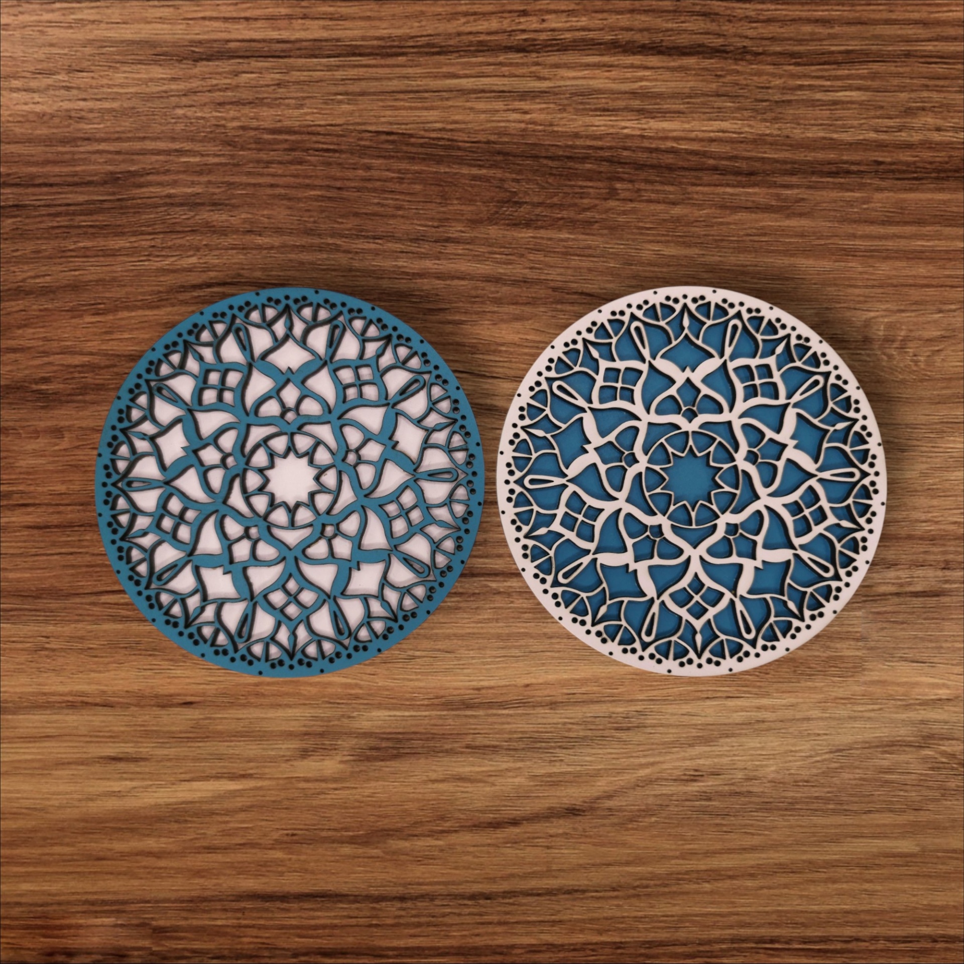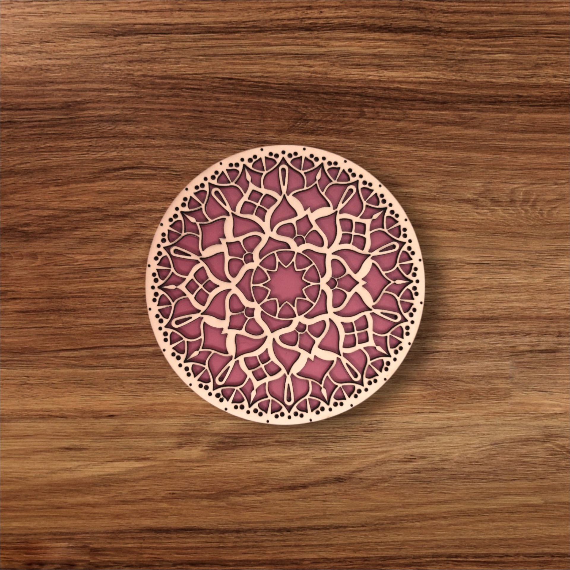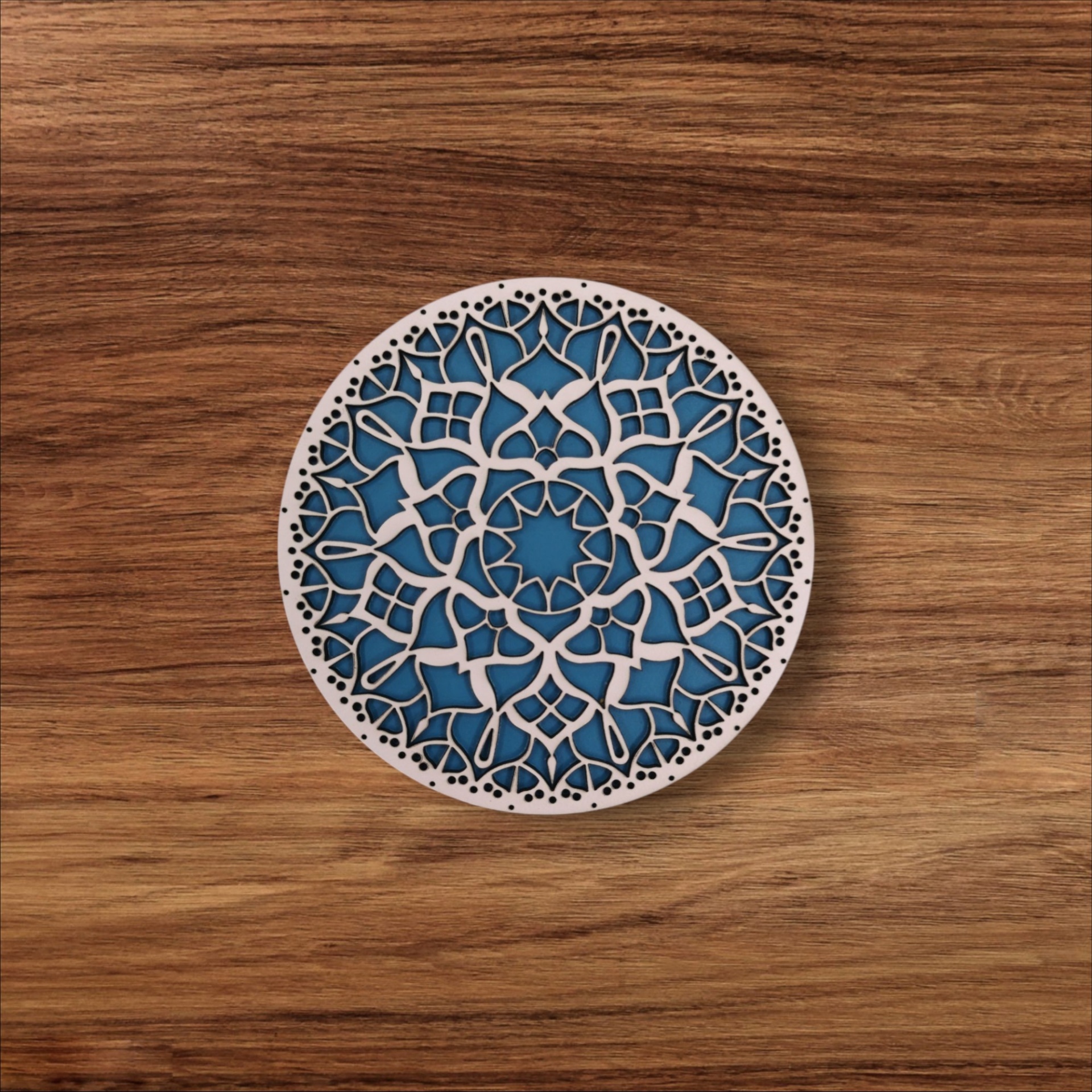 Apresenta um desenho de mandala formado por duas placas sobrepostas, num subtil jogo de cores. Uma peça decorativa e funcional que irradia equilíbrio e harmonia.