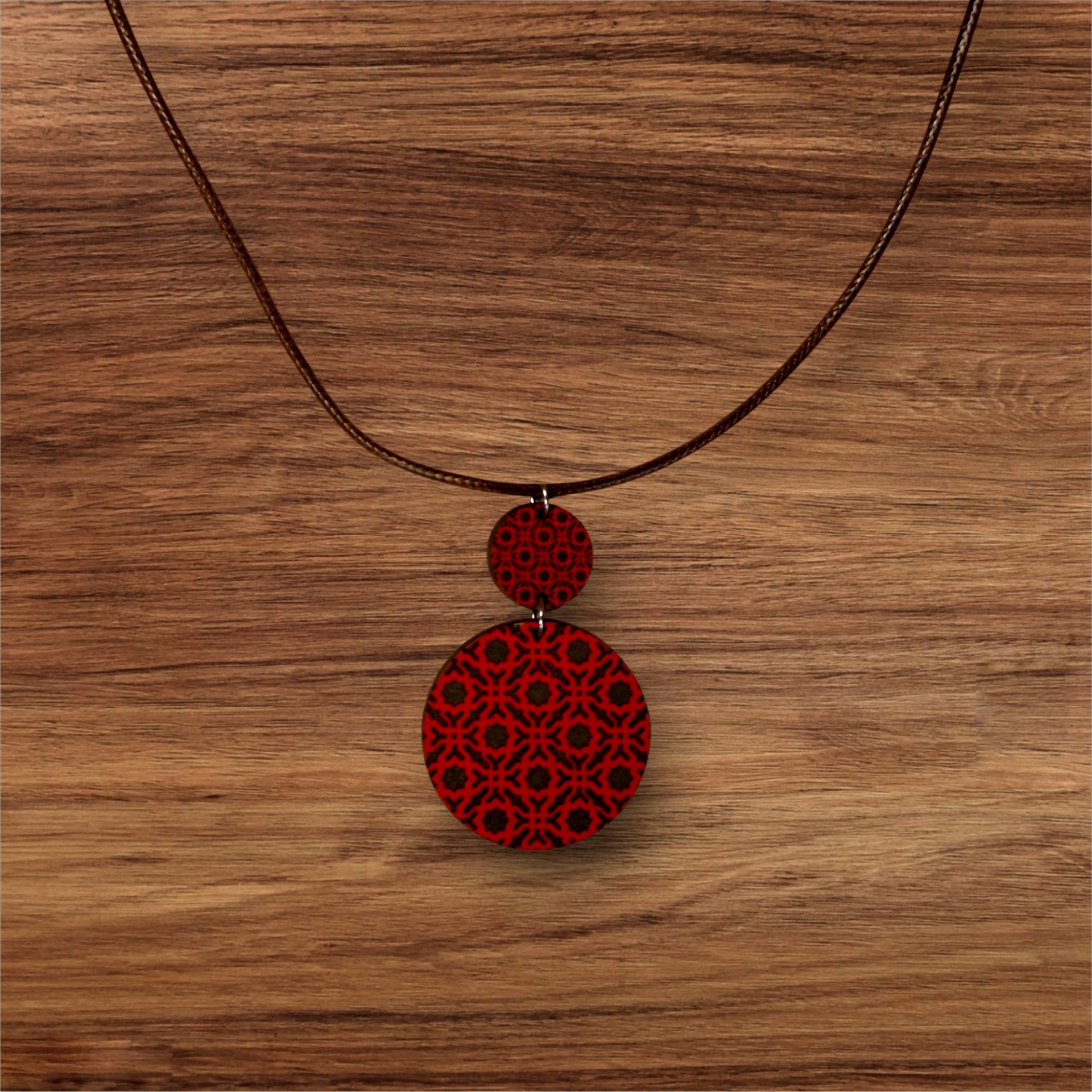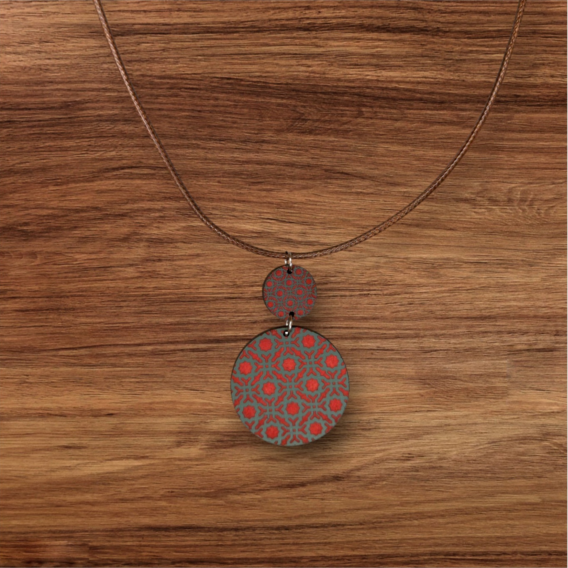 Colar com pendente de madeira reciclada inspirado nos padrões geométricos de Alhambra, em Granada. Design artesanal que expressa elegância e consciência ambiental.