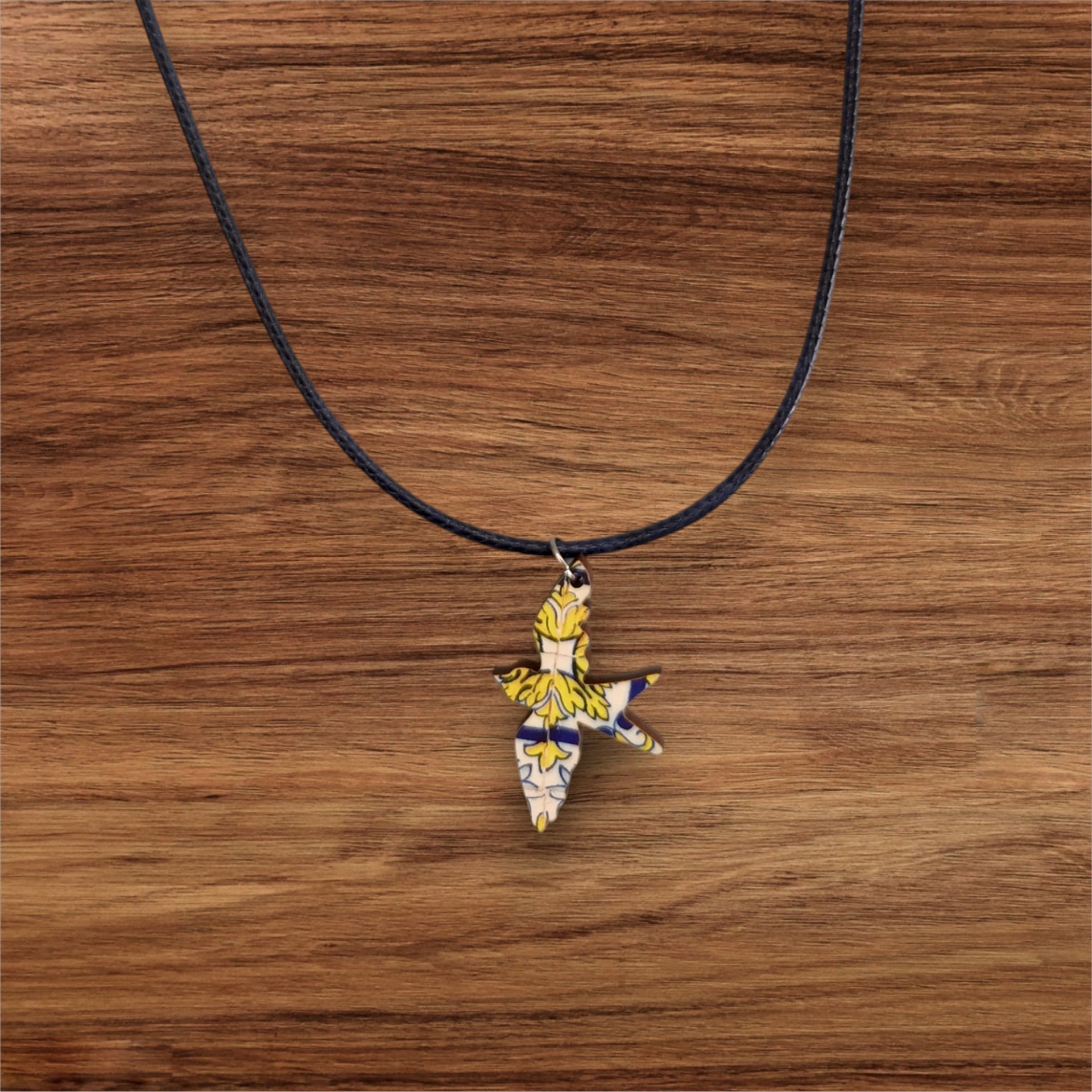 Colar de madeira reciclada com padrão de azulejos e andorinhas. Feito em Portugal com alma, tradição e sustentabilidade.