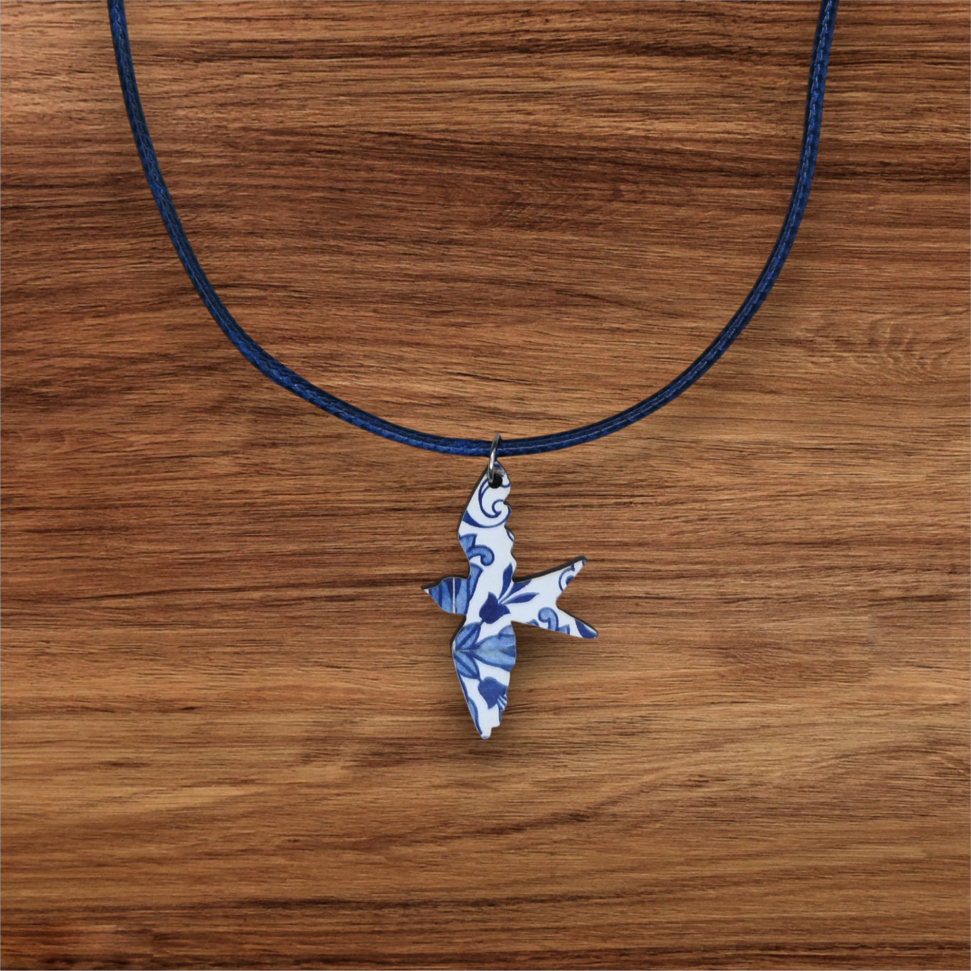 As andorinhas, símbolo de amor, liberdade e regresso a casa, dão vida a este colar inspirado nos azulejos portugueses. Feito à mão em Portugal com madeira reciclada e tintas ecológicas, é uma peça que une tradição, elegância e consciência ambiental.