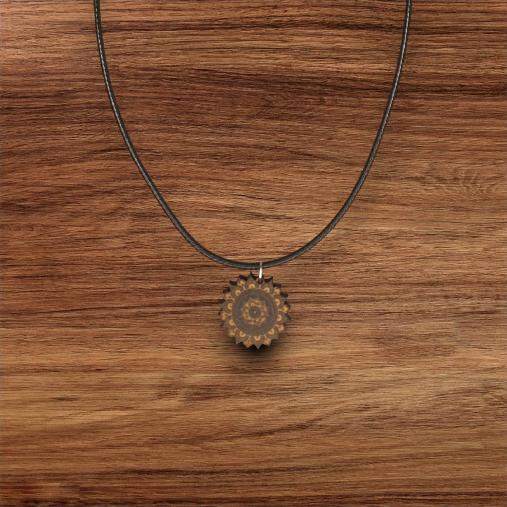Colar artesanal com pendente de mandala recortada e gravada em madeira reciclada, pintado com tintas à base de água.