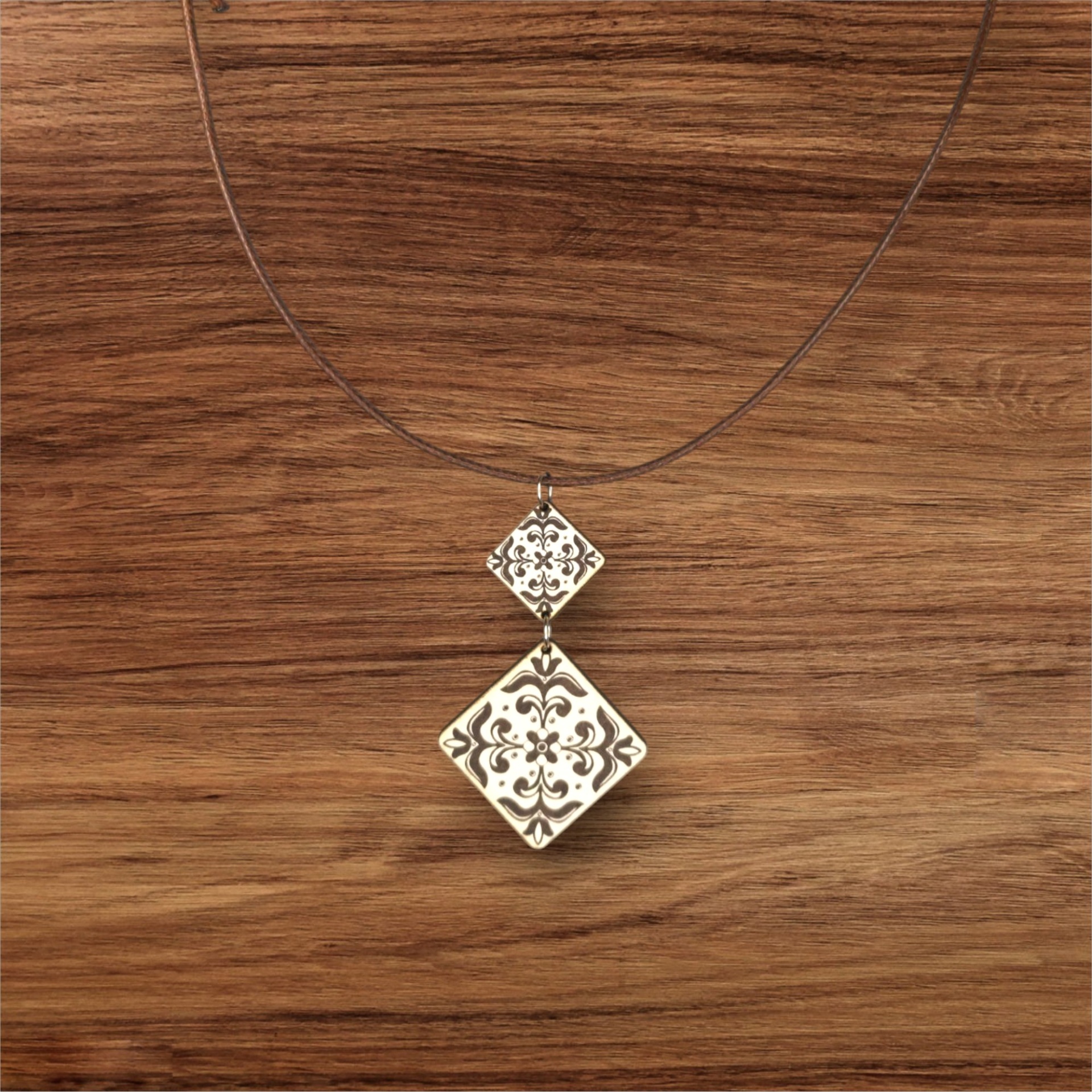 Colar em madeira reciclada, pintado com tintas à base de água e inspirado nos azulejos de Portugal. Elegância artesanal e consciência ambiental.