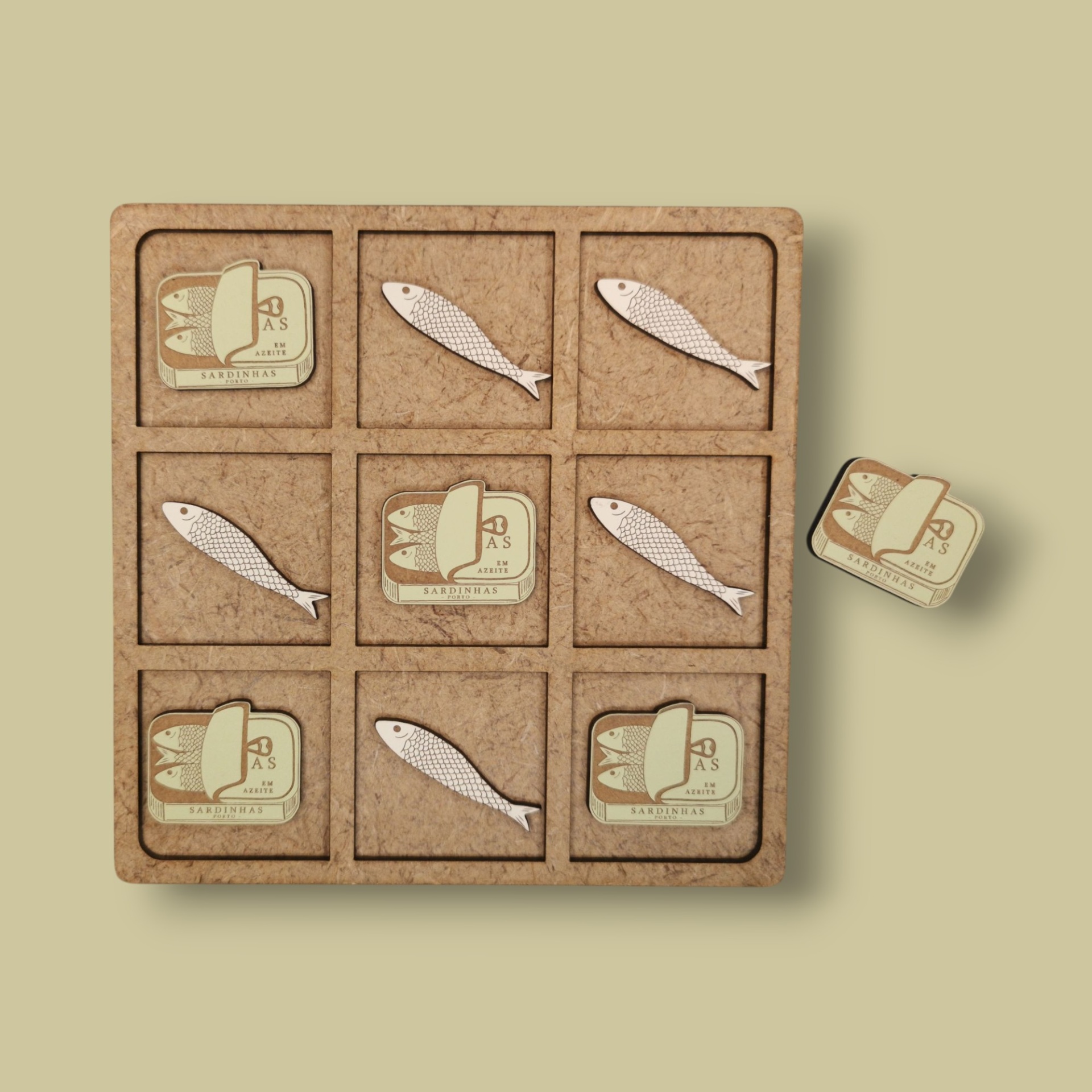 Jogo do Galo com tema de Sardinha em Lata, feito em madeira reciclada e pintado com tintas à base de água. Artesanal, divertido e 100% português!