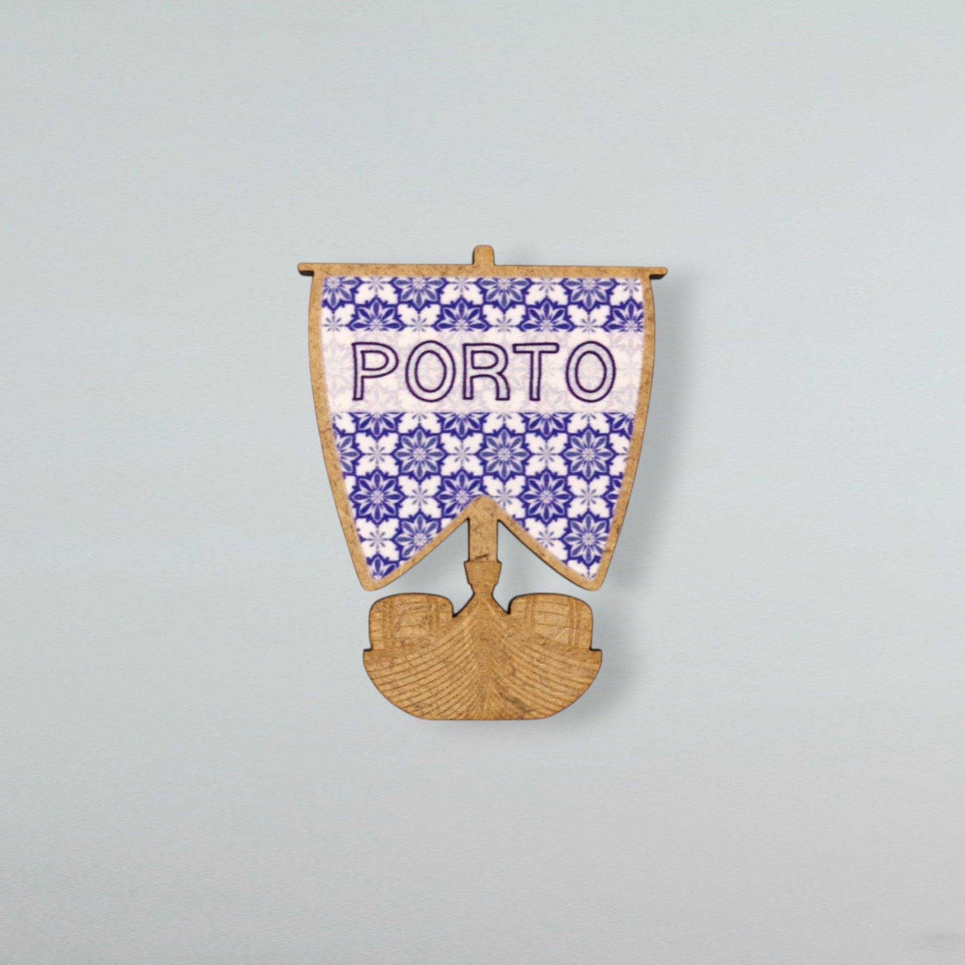 Magnético em forma de barco Rabelo, feito em madeira reciclada e decorado com detalhes de azulejo. Artesanato português sustentável, perfeito como lembrança ou decoração da cidade do Porto.