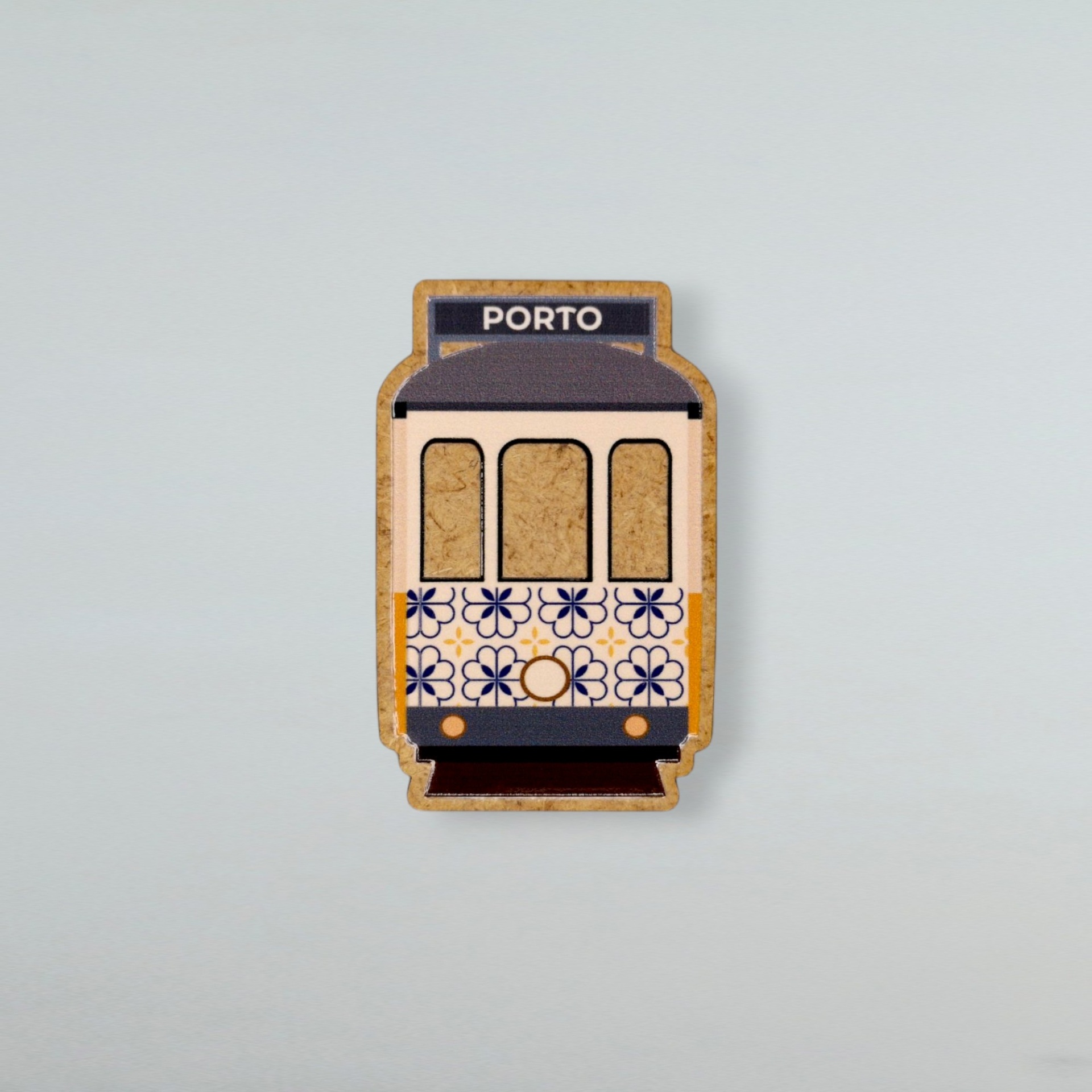Magnético decorativo com o tema do elétrico do Porto, detalhado com padrões de azulejo. Feito em madeira reciclada é um artesanato português sustentável e único.