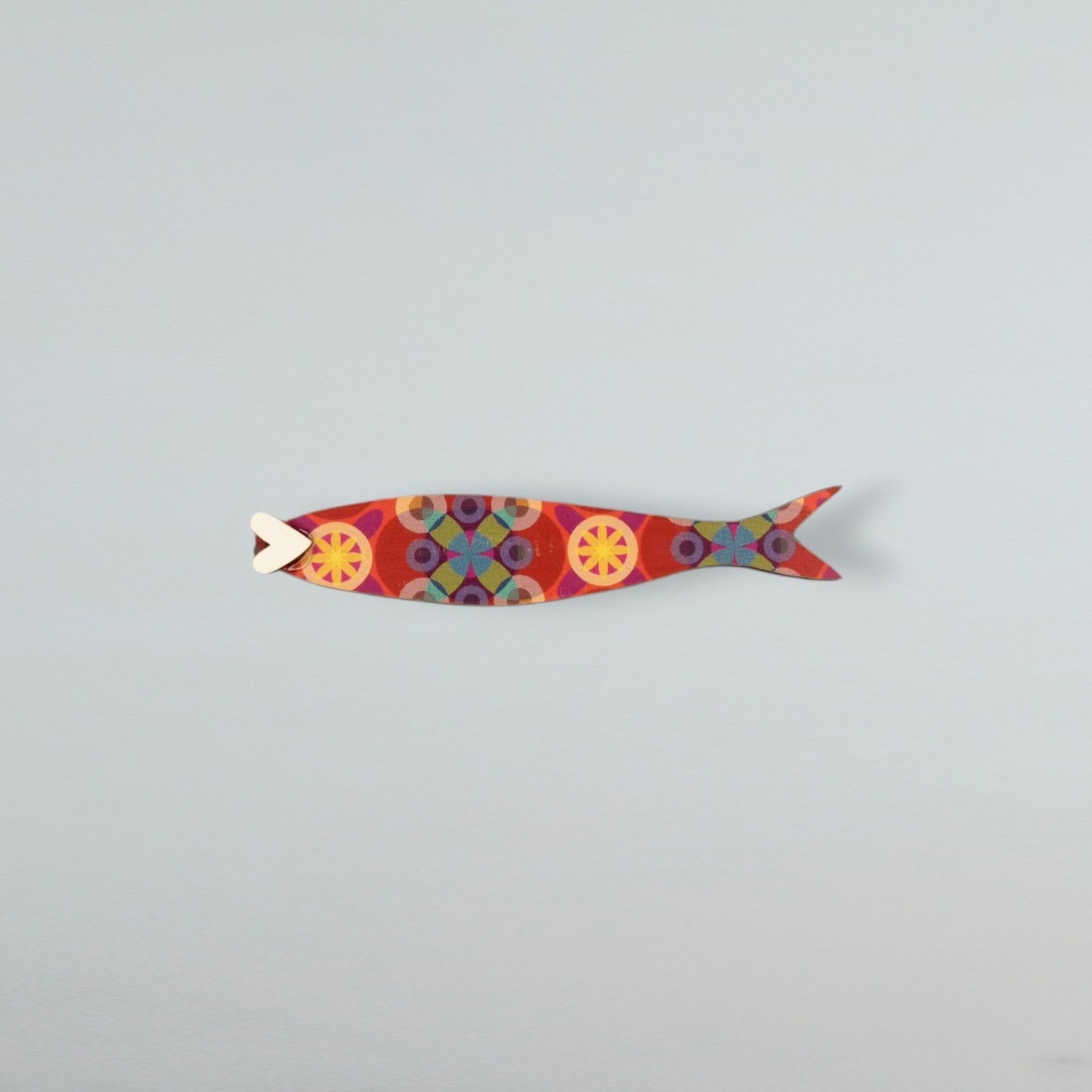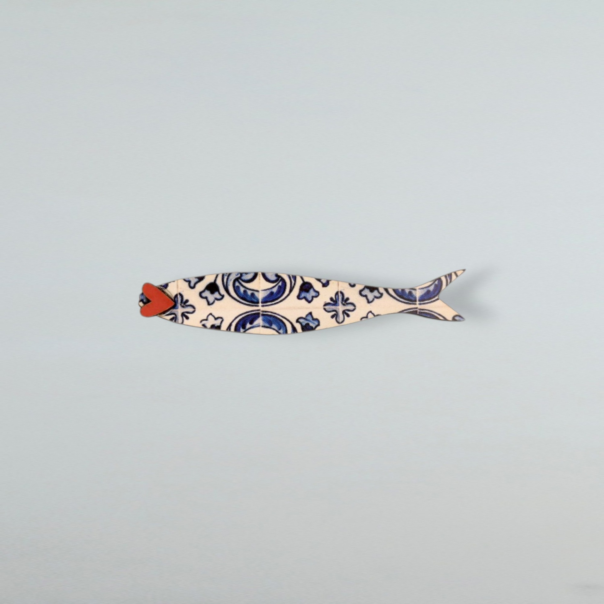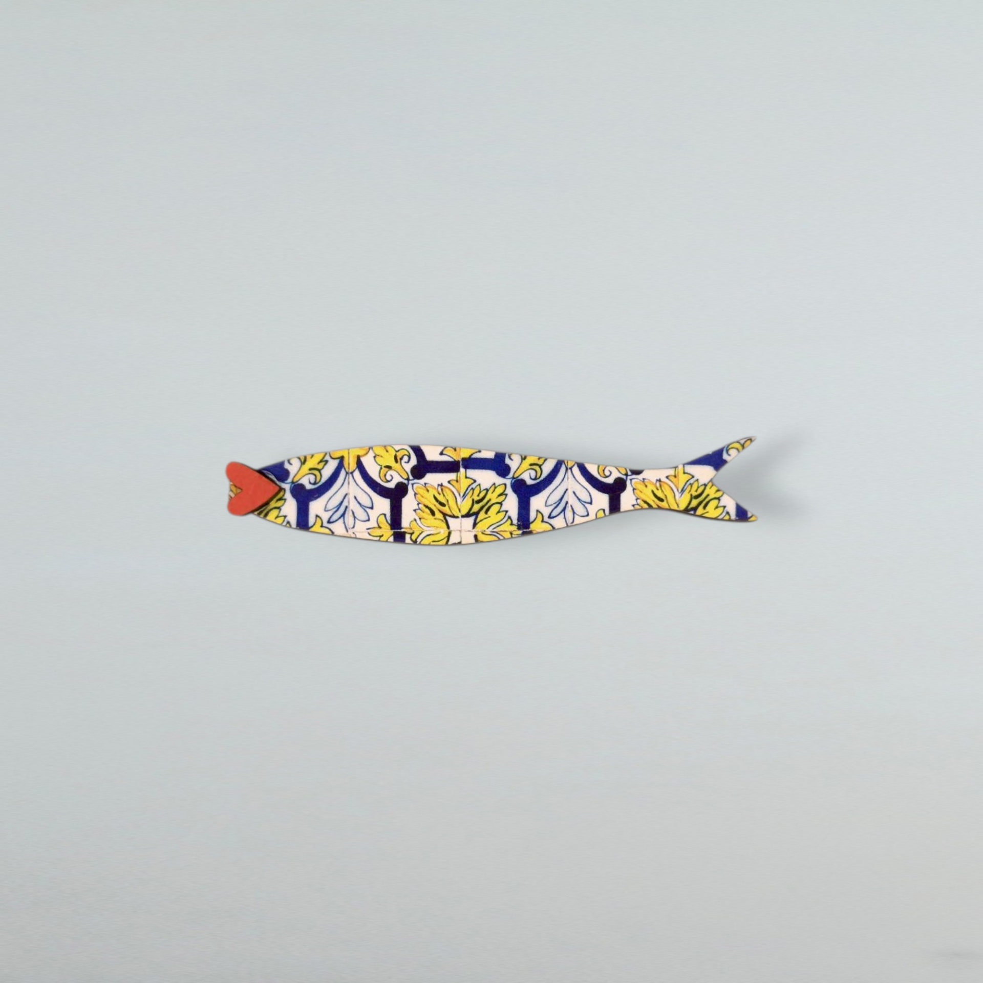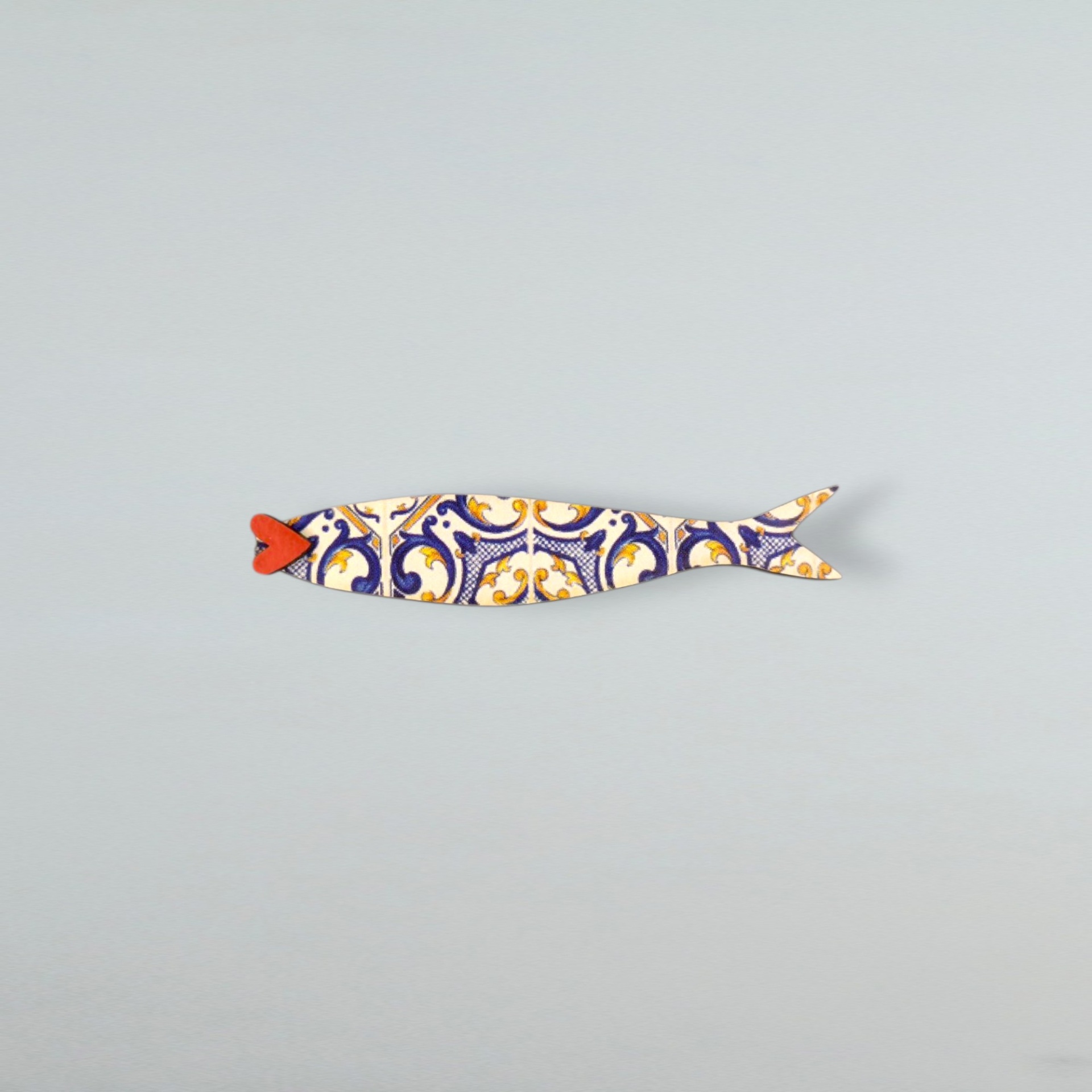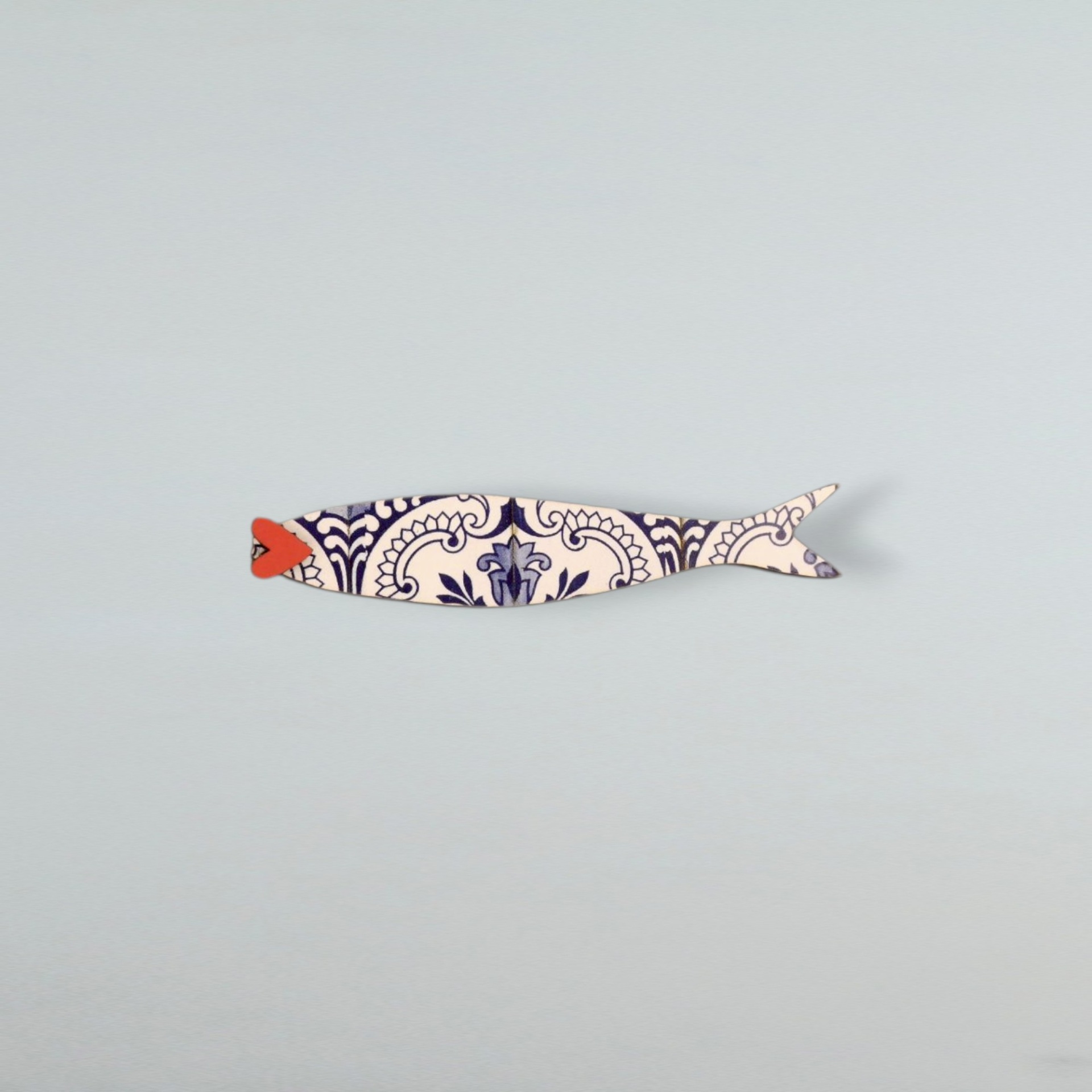 Magnético em formato de sardinha, feito à mão com madeira reciclada e estampa inspirada nos tradicionais azulejos portugueses .
