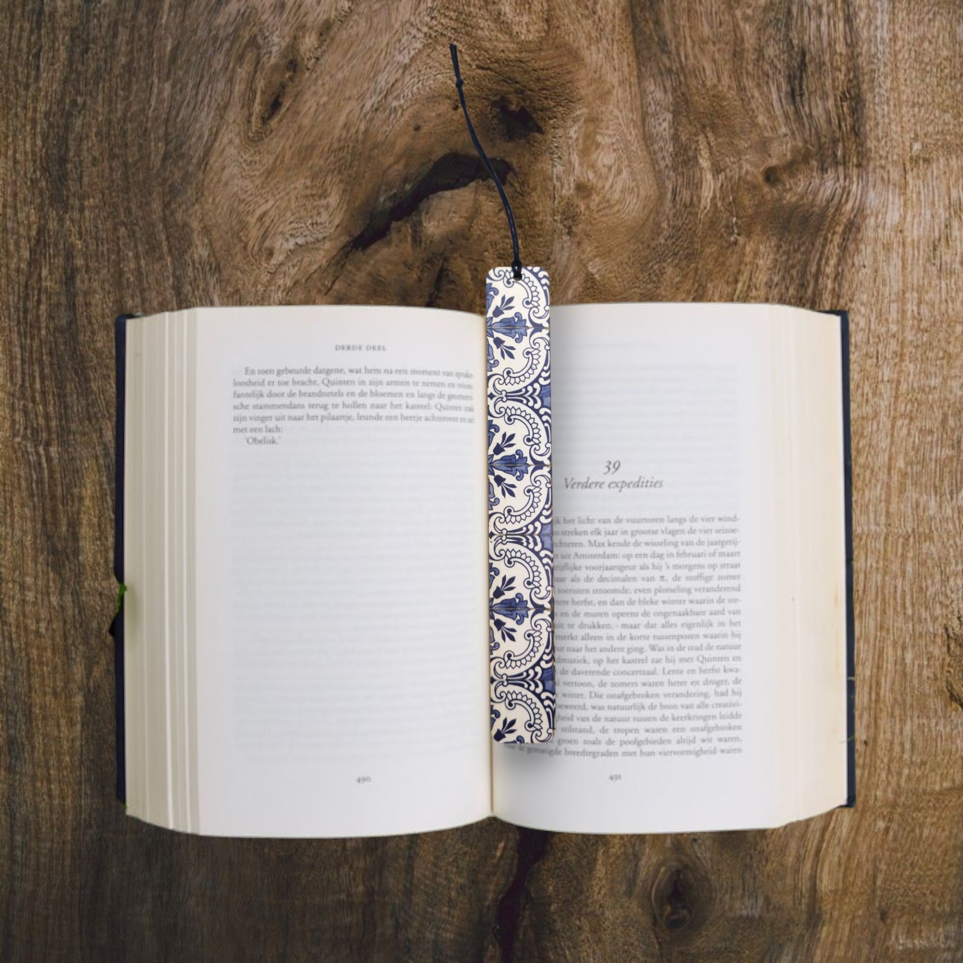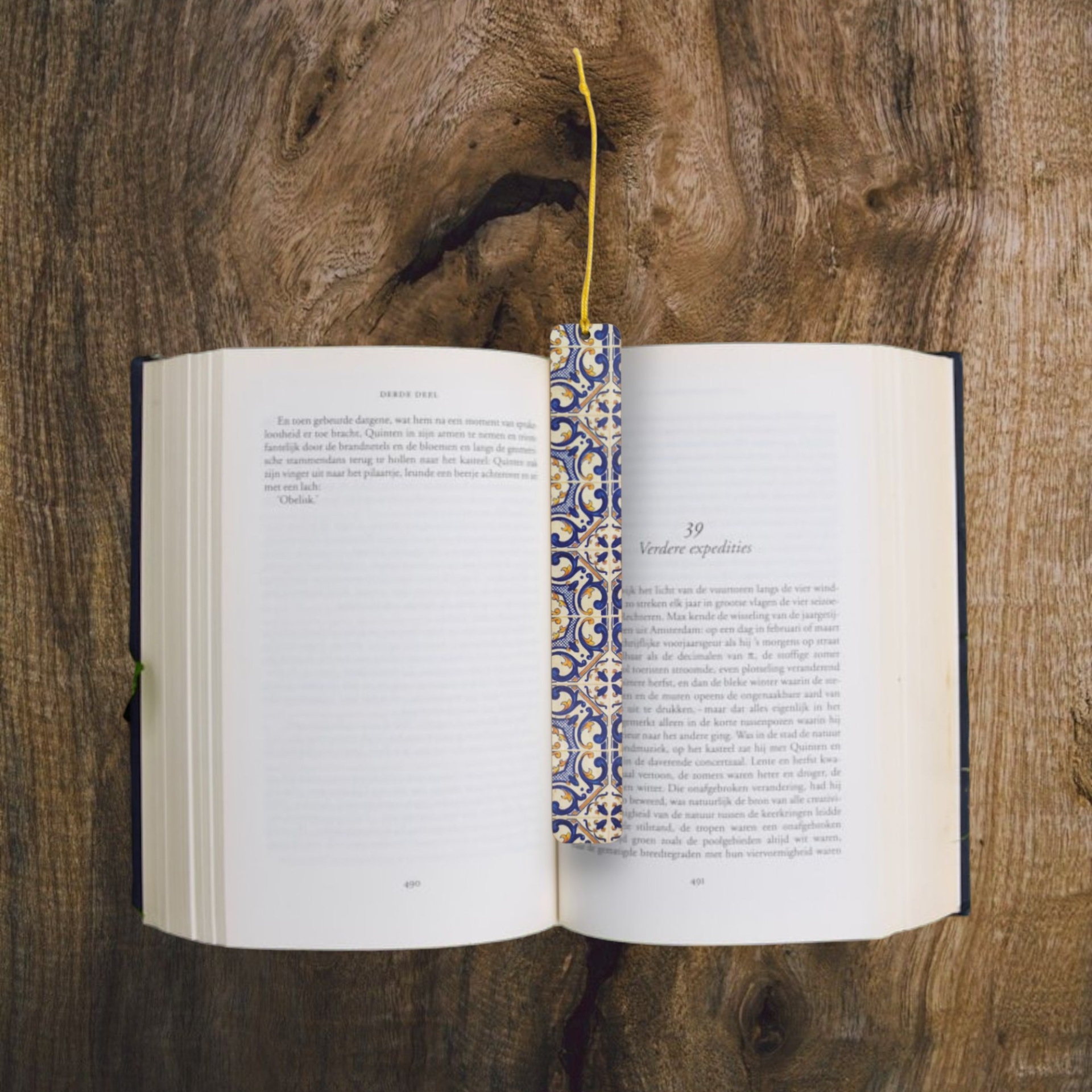 Marcador de livros artesanal em madeira MDF reciclada, com inspiração nos tradicionais azulejos portugueses.