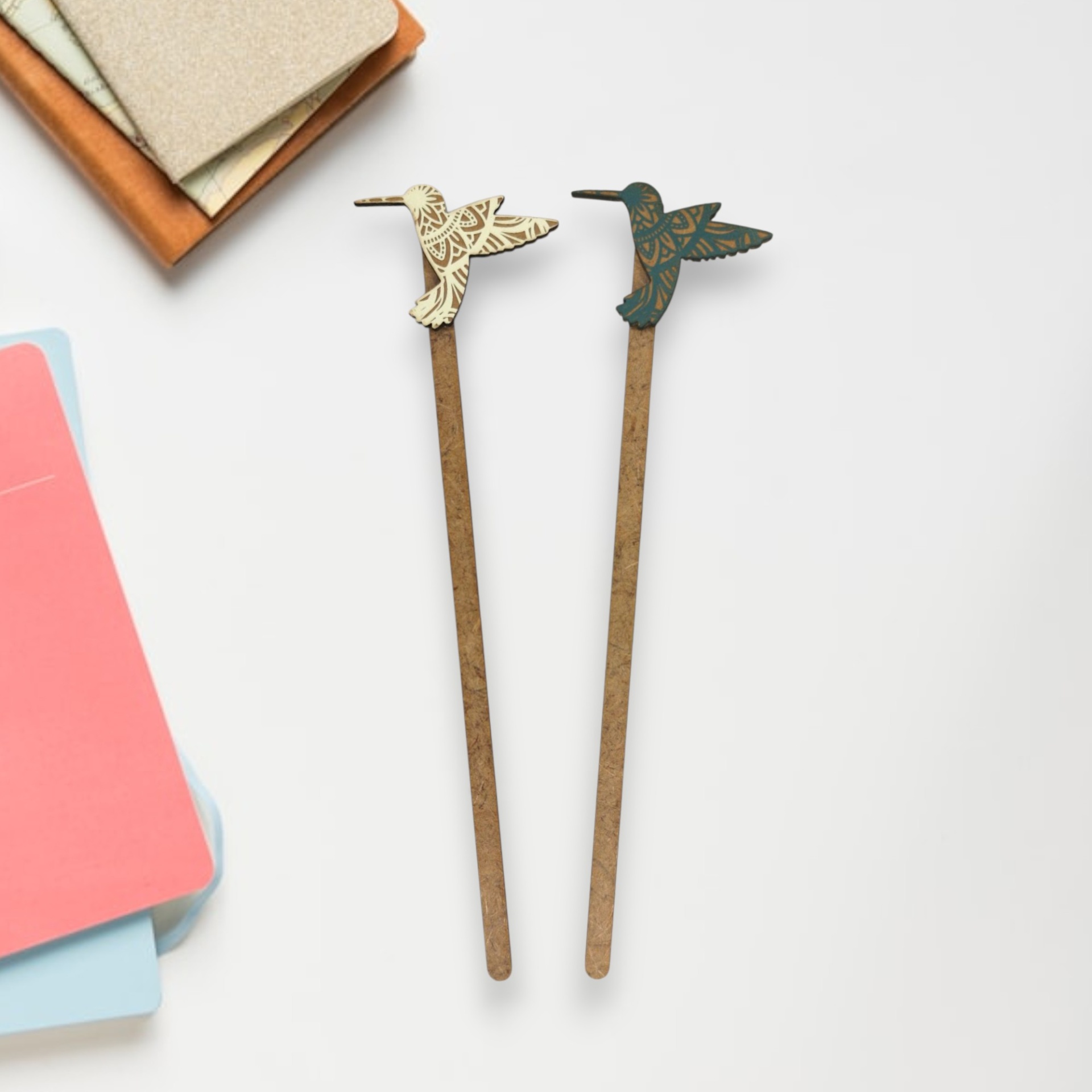 Marcador de livros em madeira, sustentável e artesanal, com a imagem de um beija-flor.