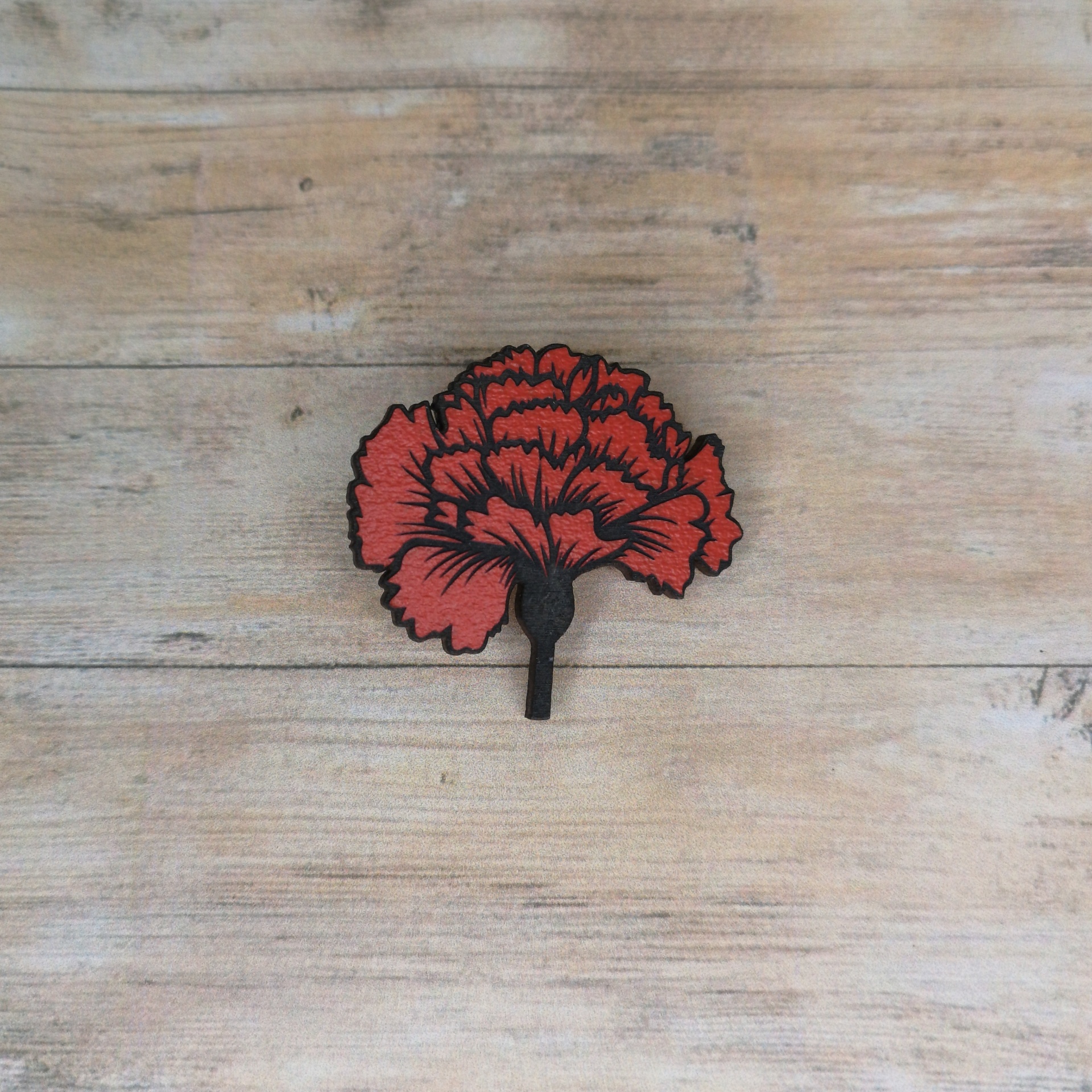 Pin em forma de cravo, produzida em madeira MDF reciclada e pintada com tintas à base de água.