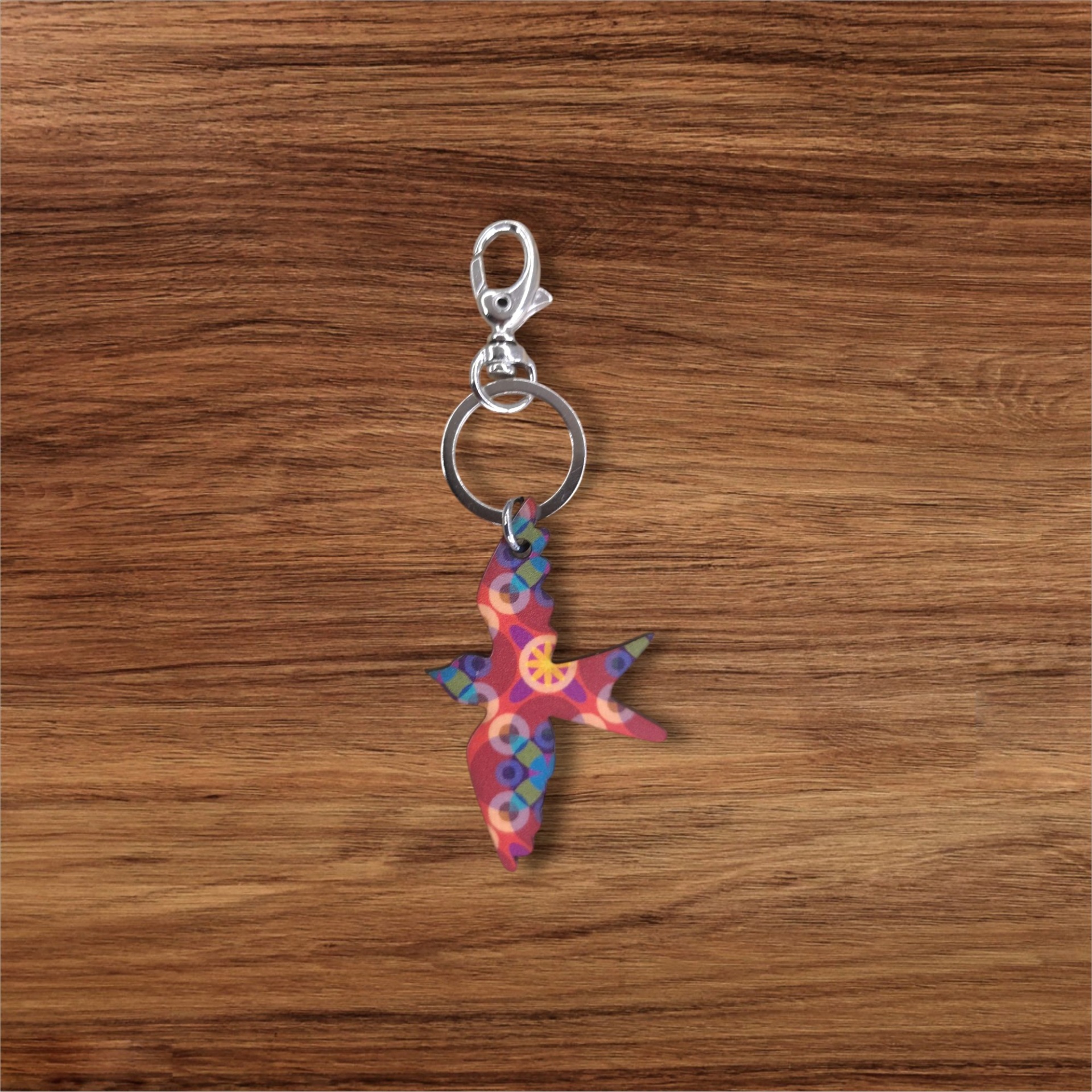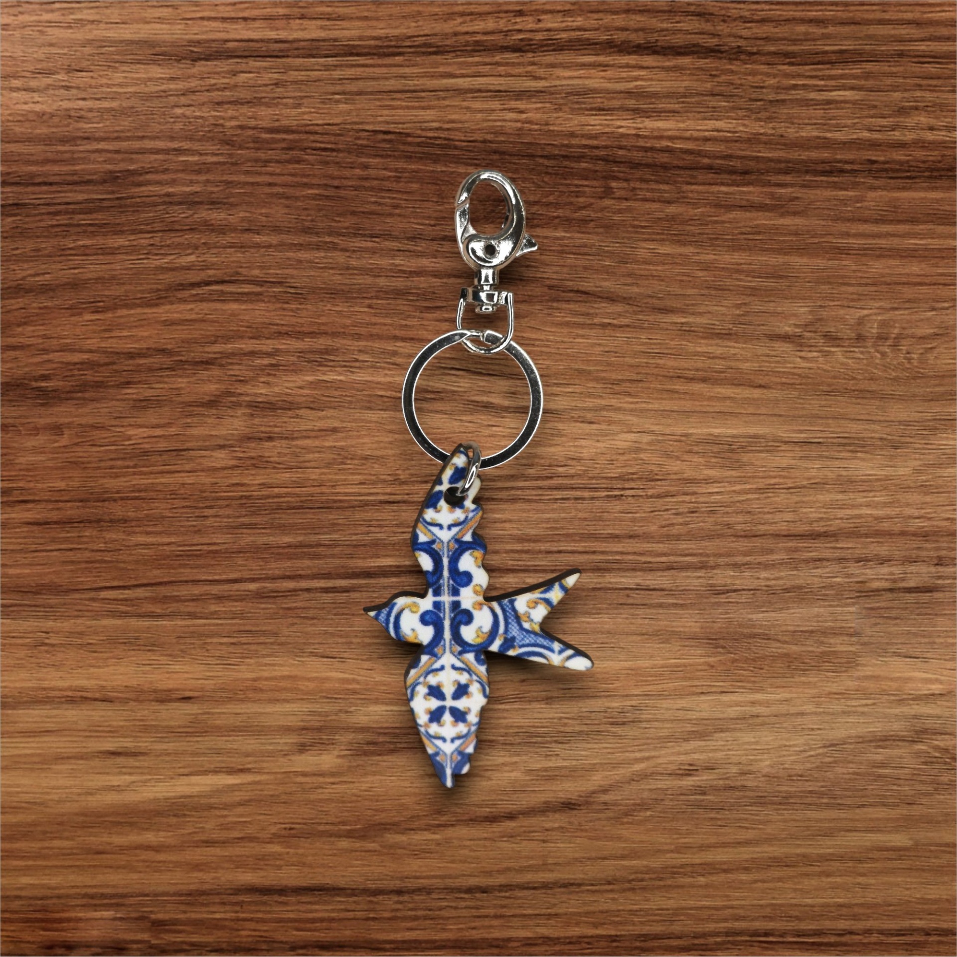 Porta-chaves em madeira reciclada em forma de andorinha com padrão de azulejos. Um acessório com alma, feito à mão para guardar memórias e caminhos.