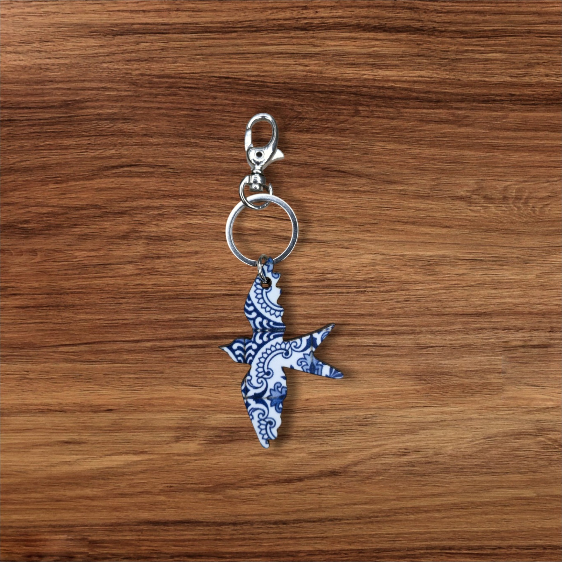 Mais do que um porta-chaves, uma andorinha que simboliza o lar, o retorno e as histórias vividas. Feito à mão com madeira reciclada e inspiração nos azulejos portugueses.