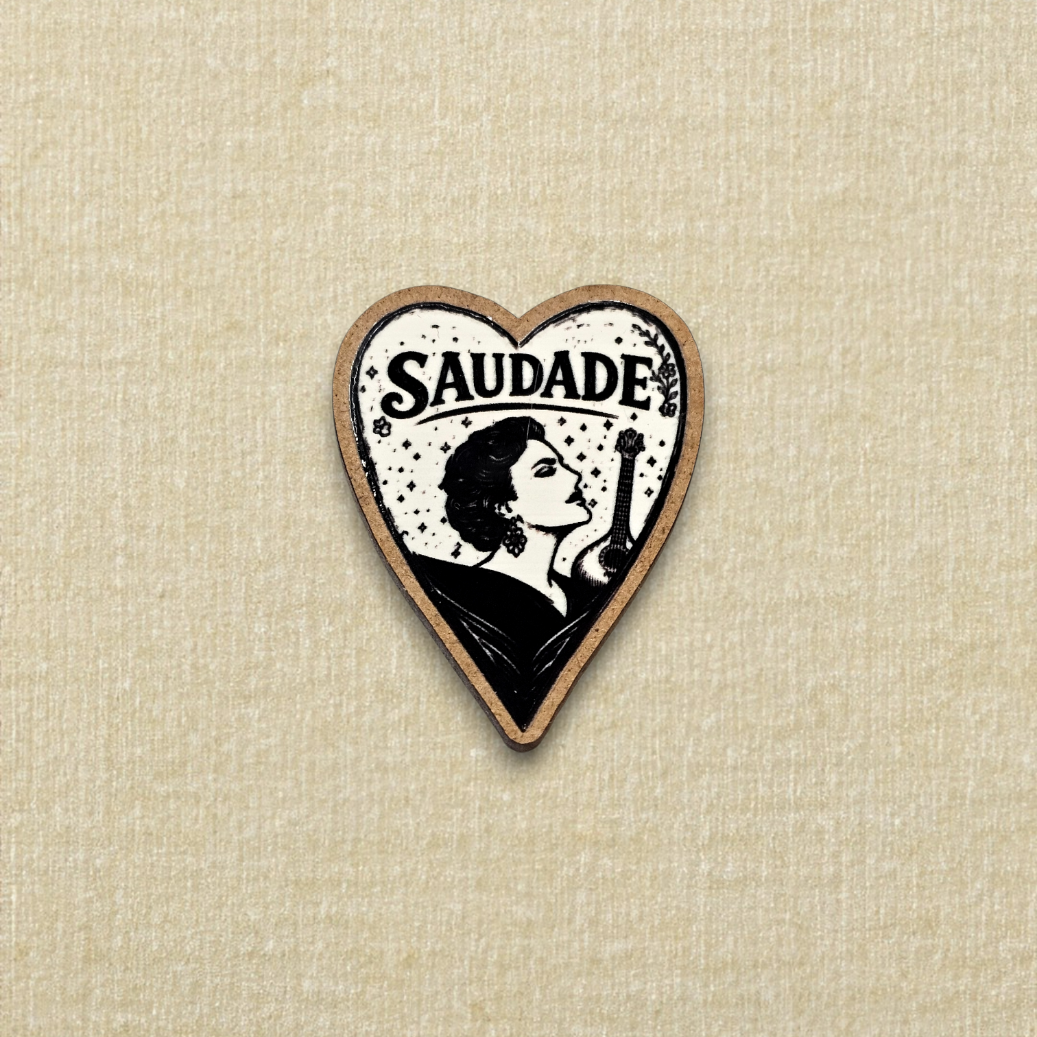 Pregadeira em forma de coração, produzido em madeira reciclada, com ilustração inspirada na fadista Amália Rodrigues. Uma peça artesanal portuguesa que une design, sustentabilidade e emoção.